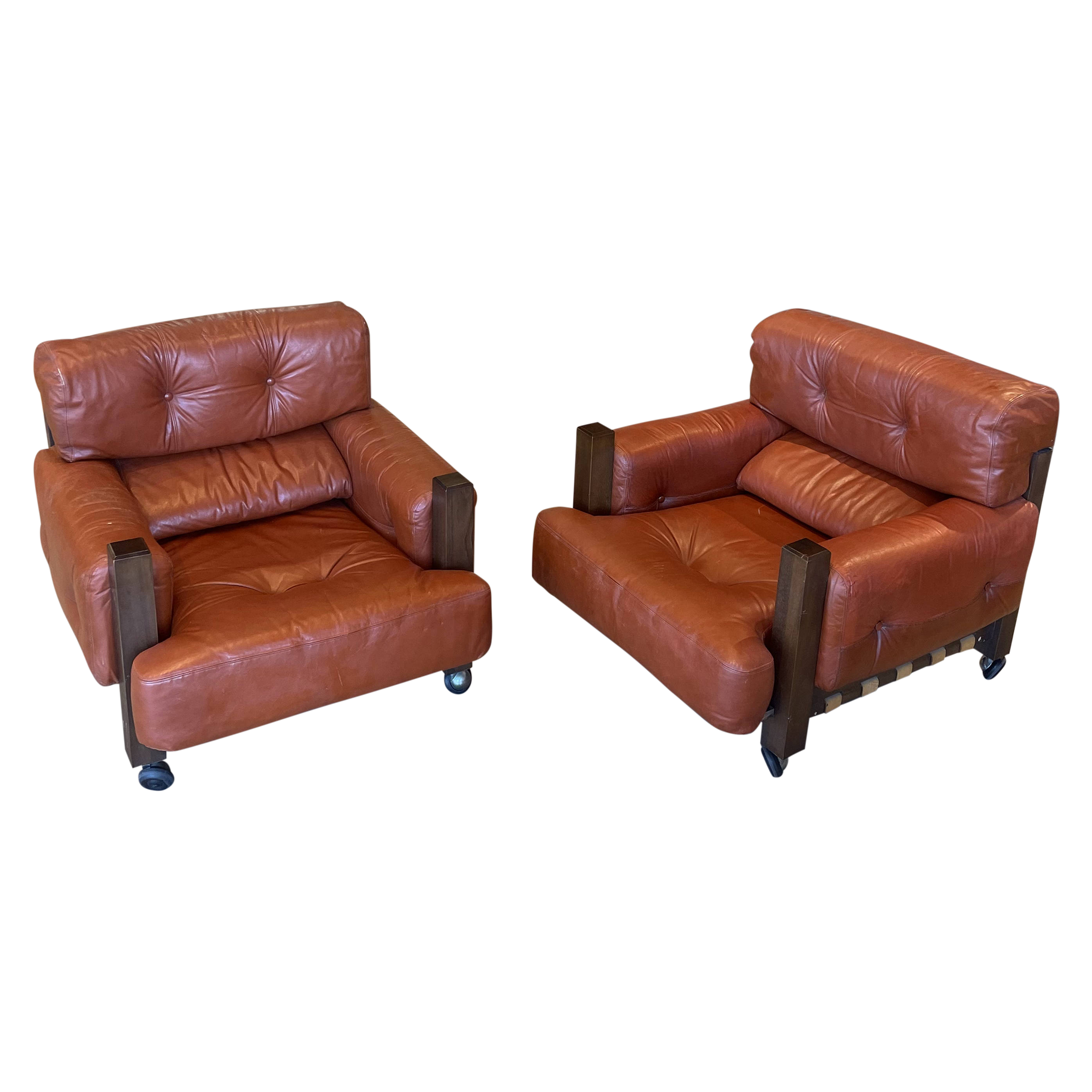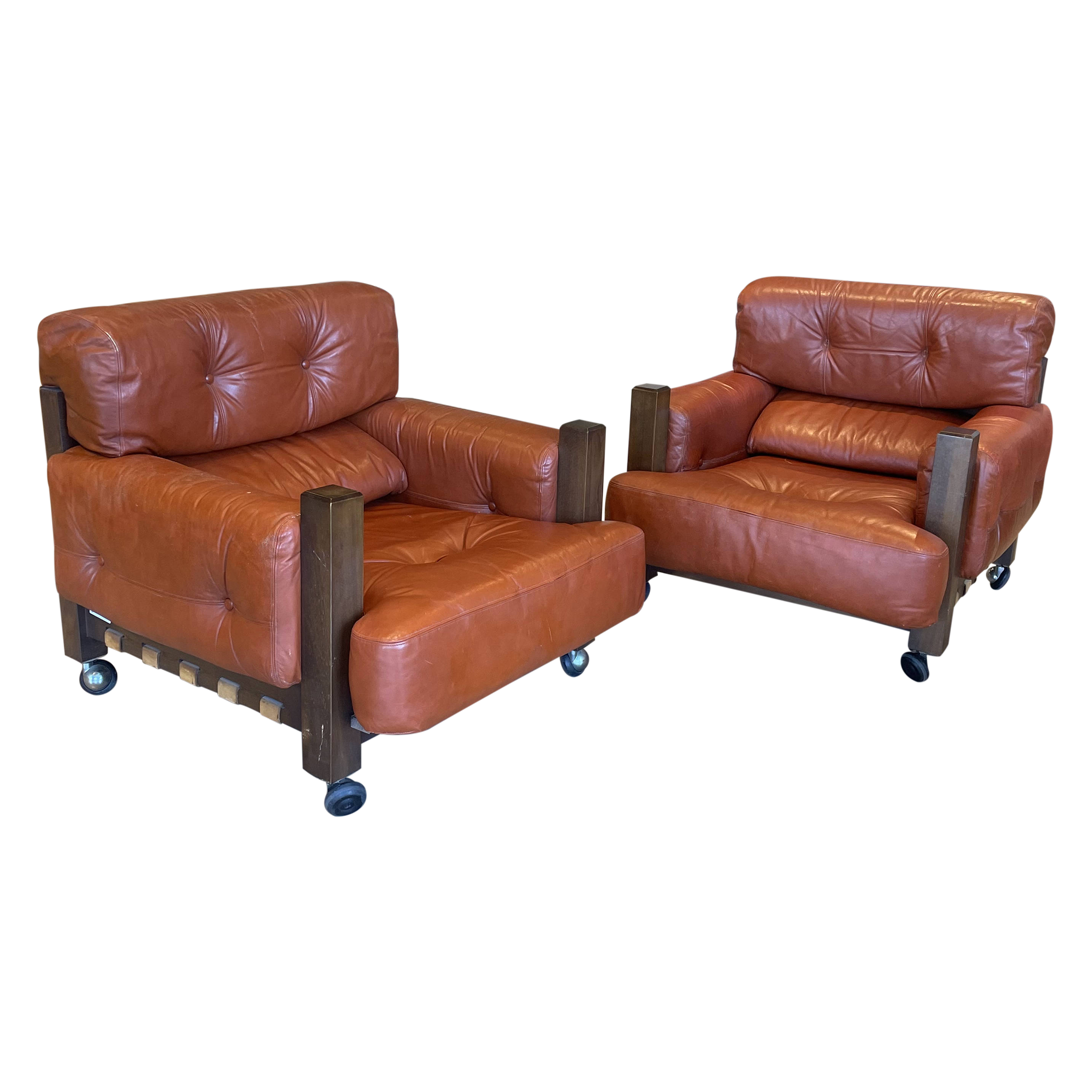 Pair of Chunky Wood and Leather Rolling Armchairs