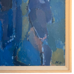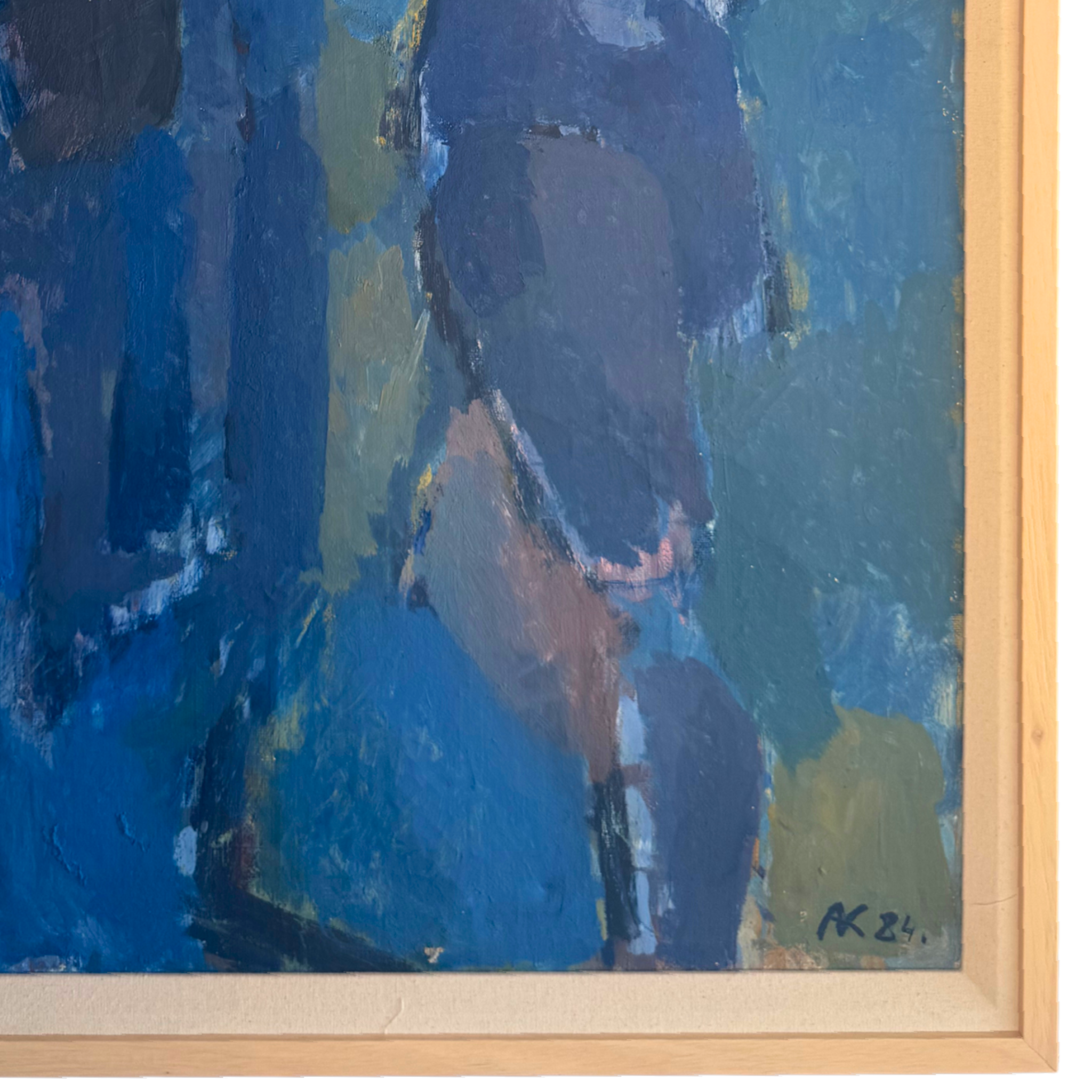 An abstracted pair of figures built from layered shades of blue with rough, textured brushwork. Signed "AK 84".