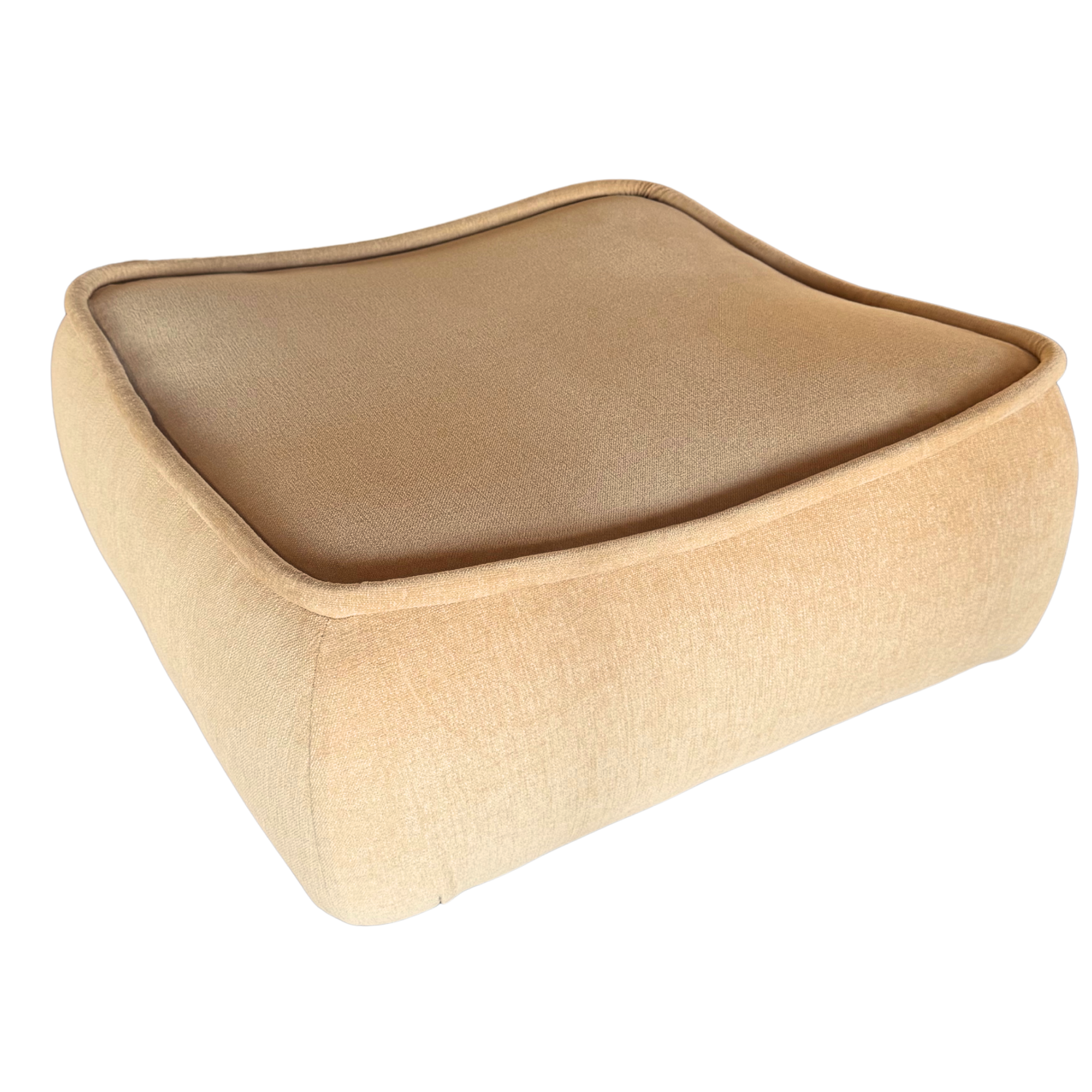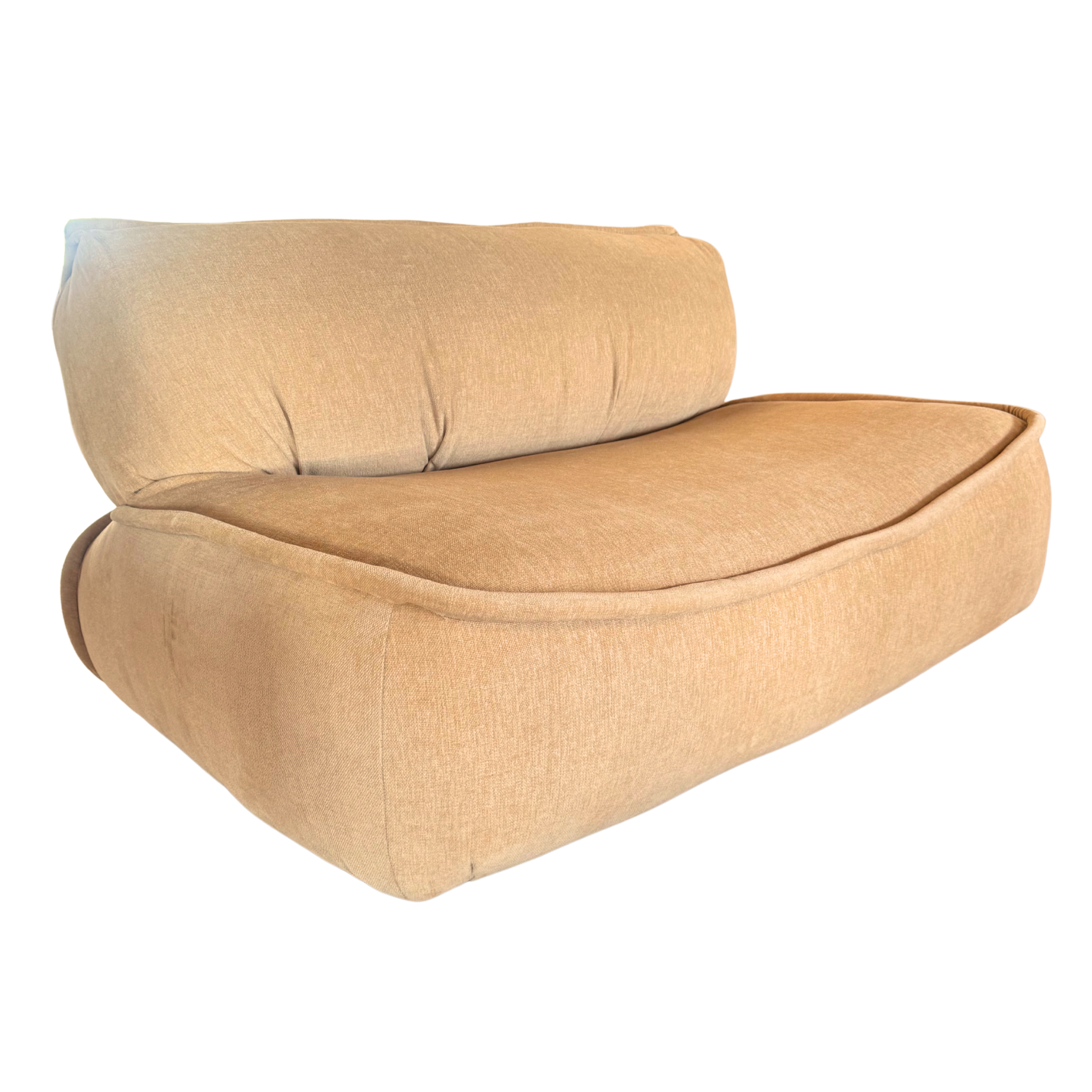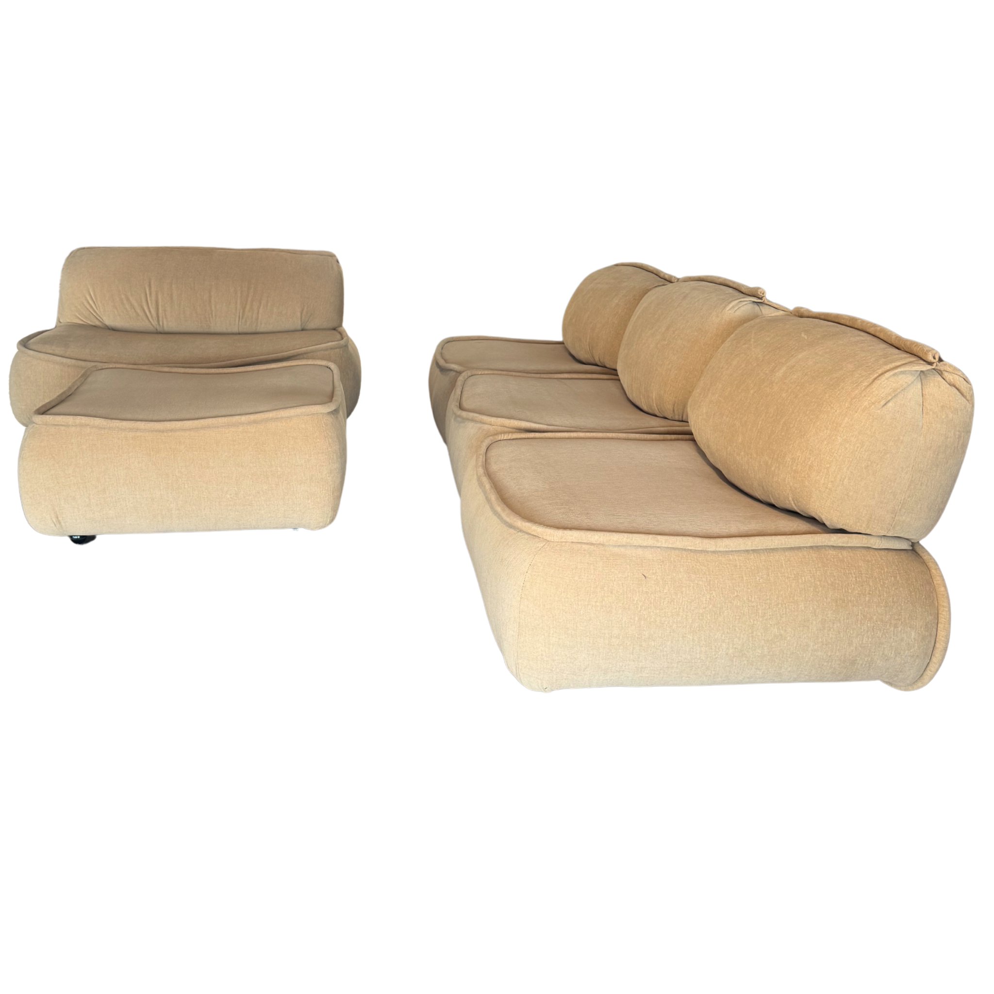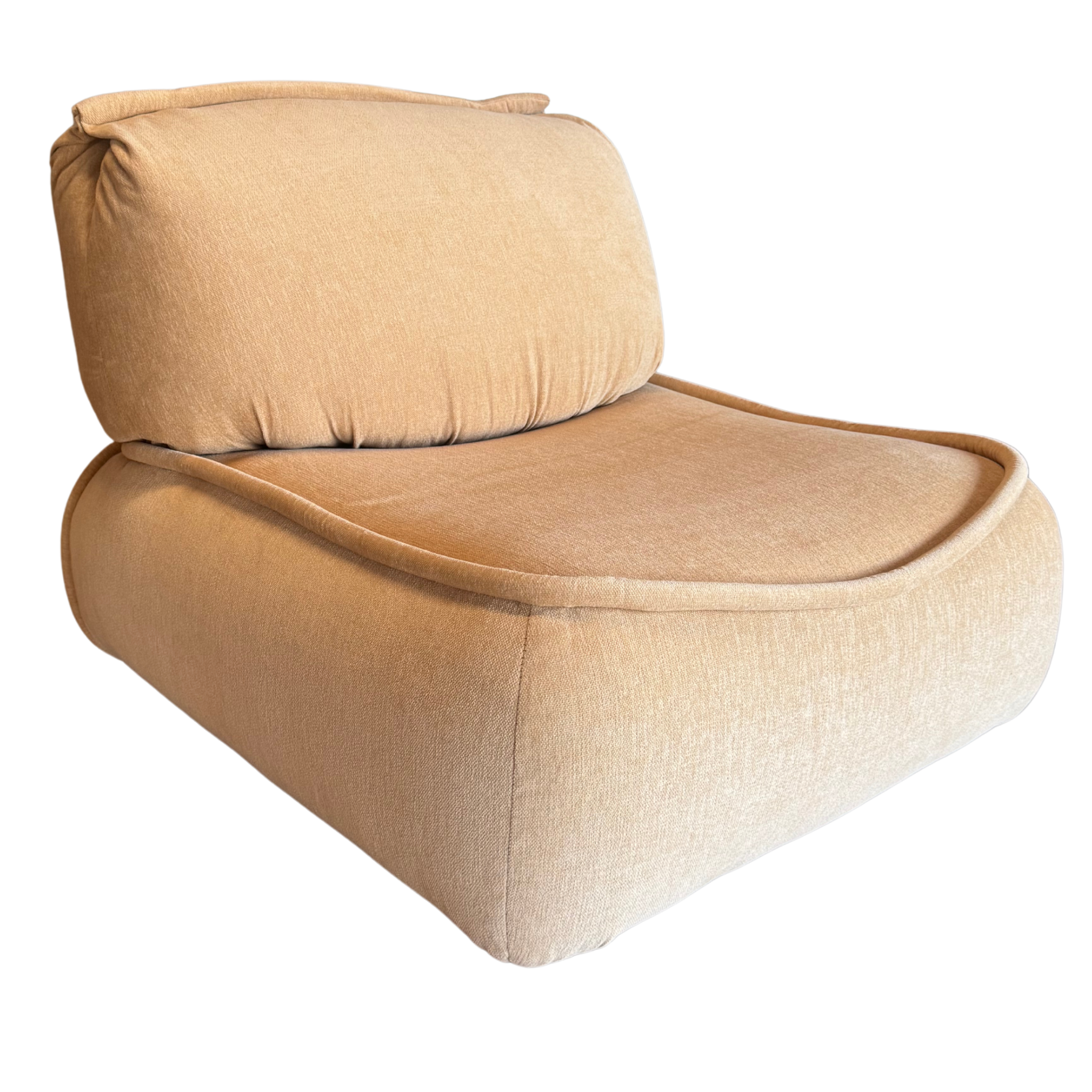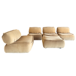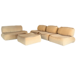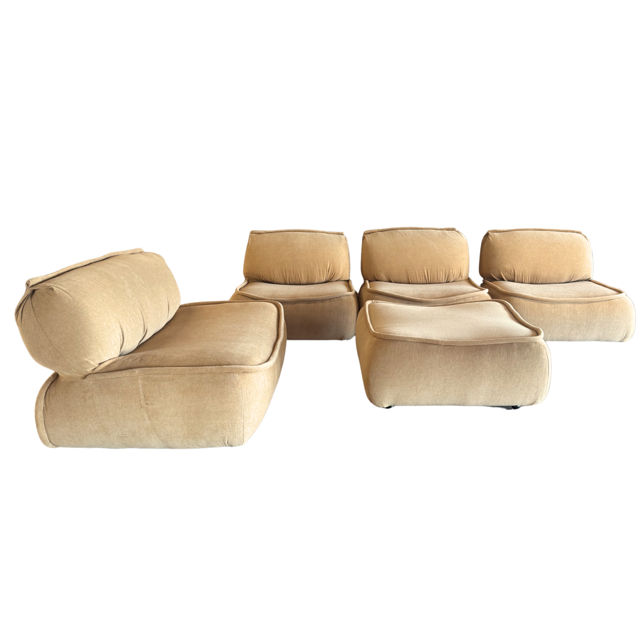 x3 Single Seaters, x1 Loveseat, x1 Ottoman. Soft edged and low to the ground, this modular lounge set brings an easy, sculptural calm. Newly reupholstered in plush butter chenille, each piece connects cleanly for flexible arrangements that feel warm and grounded.