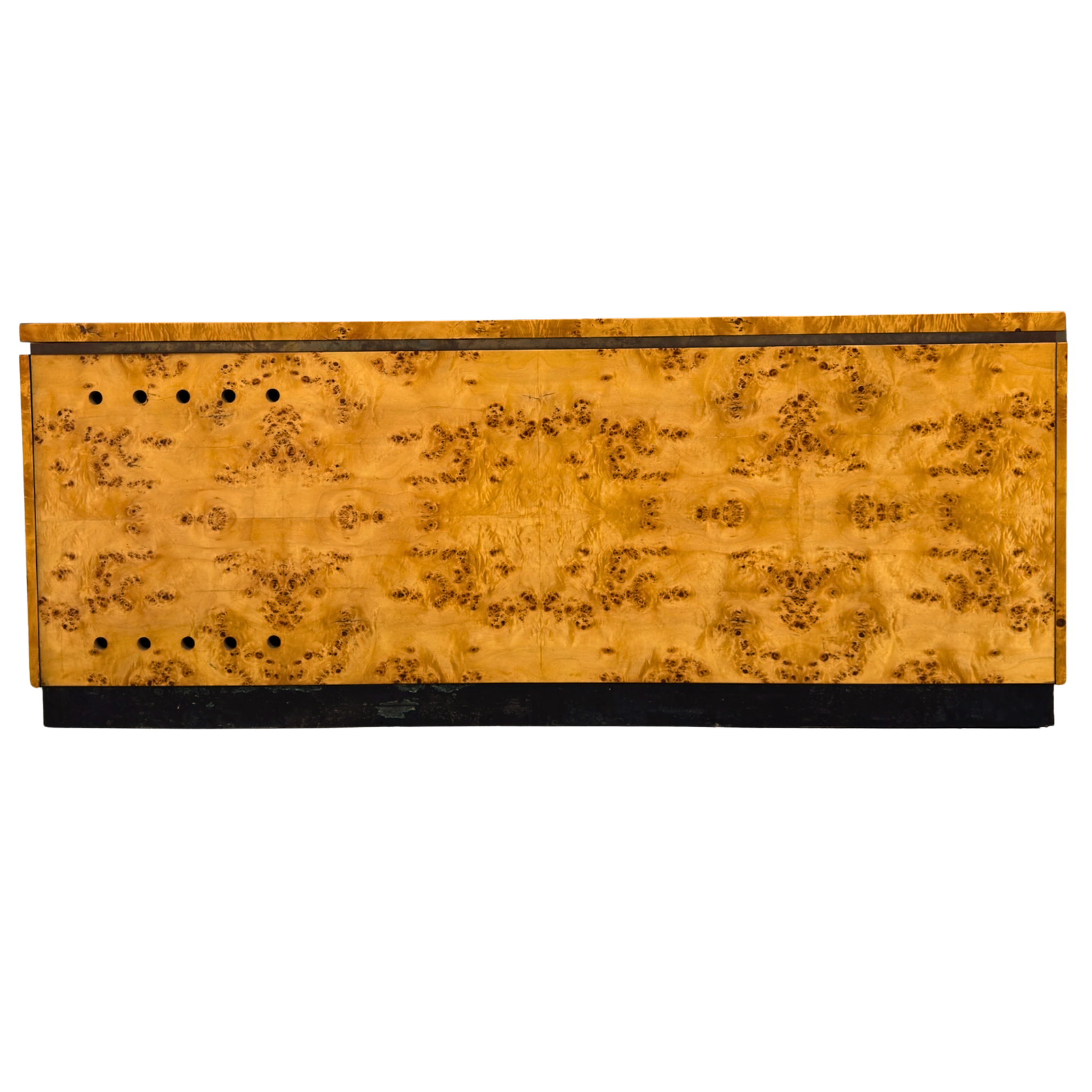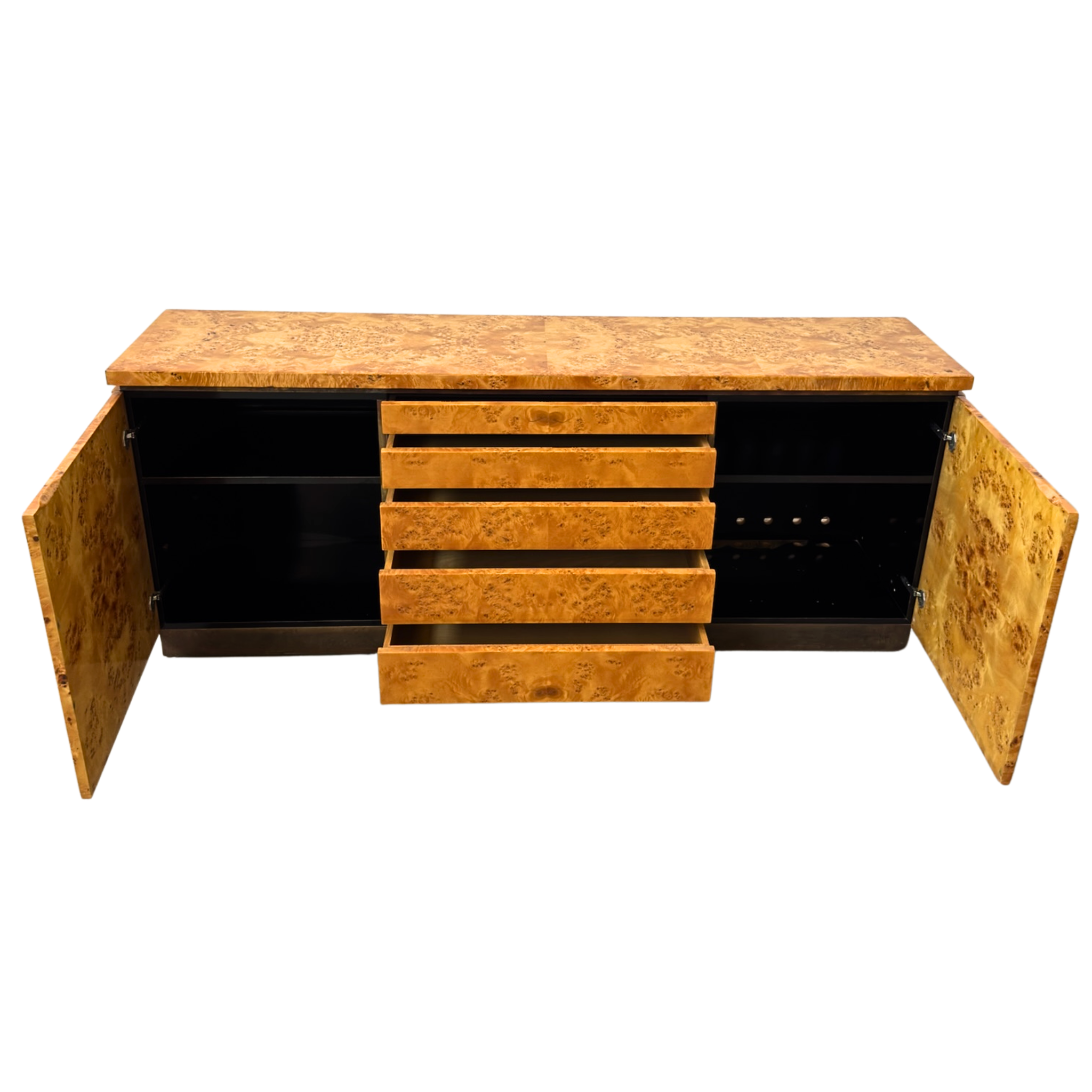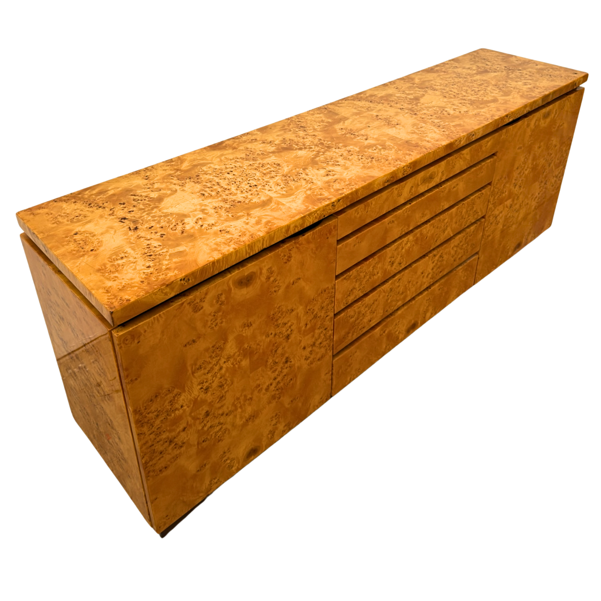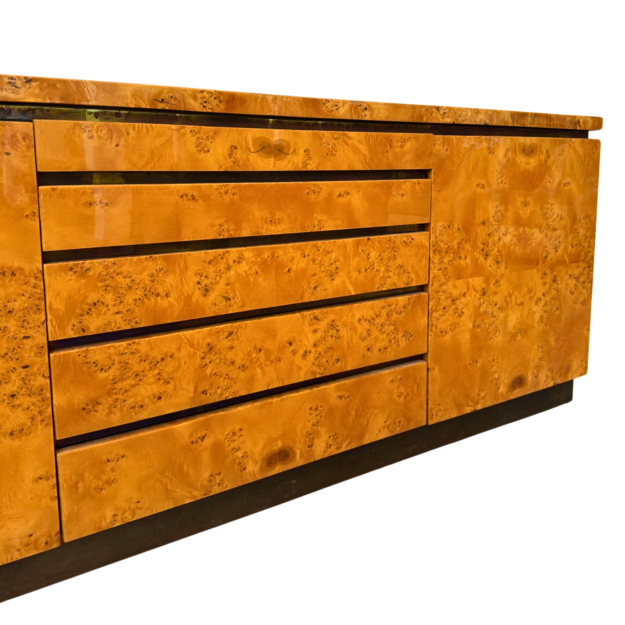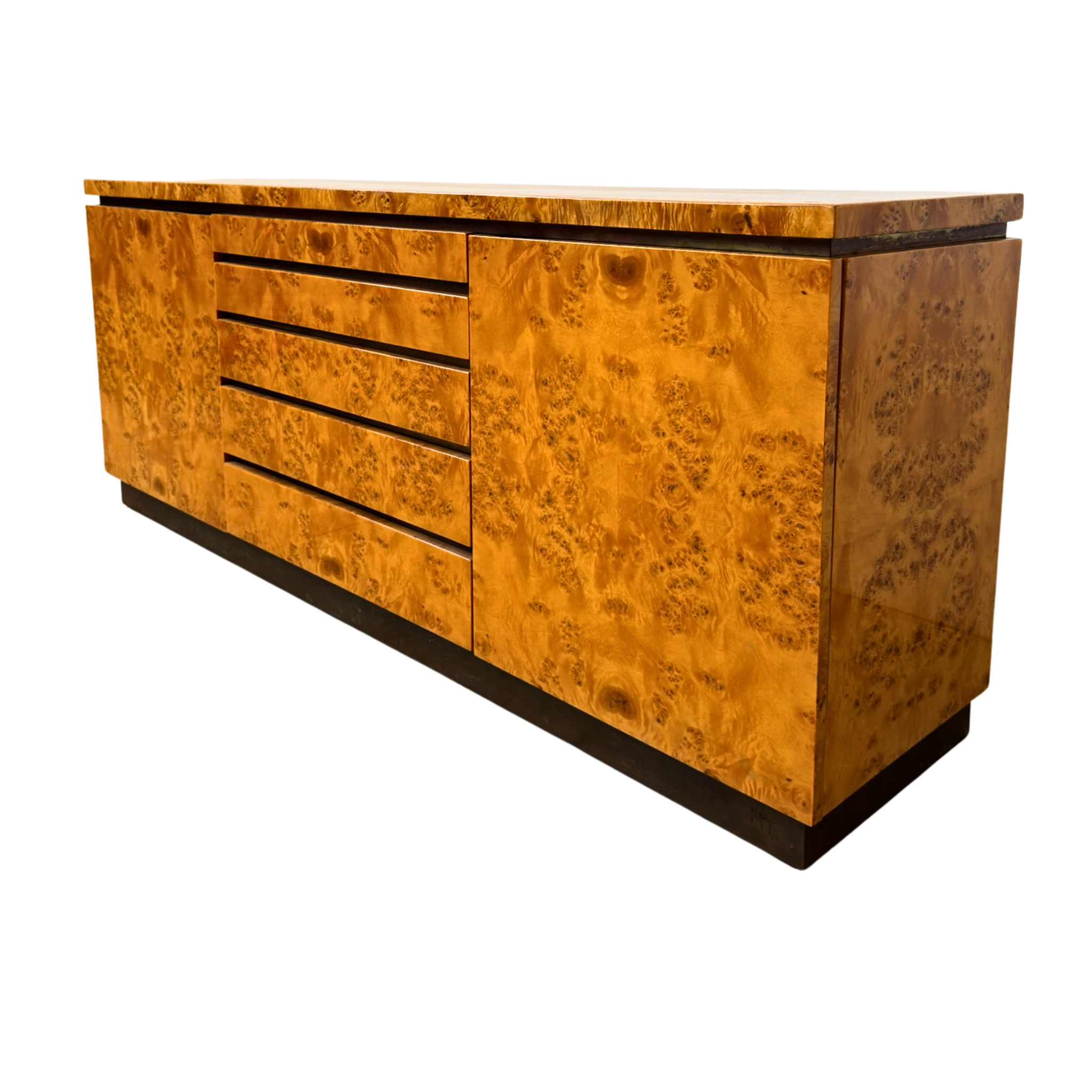 1970s Italian dresser in high gloss burlwood veneer with clean lines and a low, architectural profile. Features five central drawers flanked by cabinet doors, all with integrated pulls and a recessed plinth base.