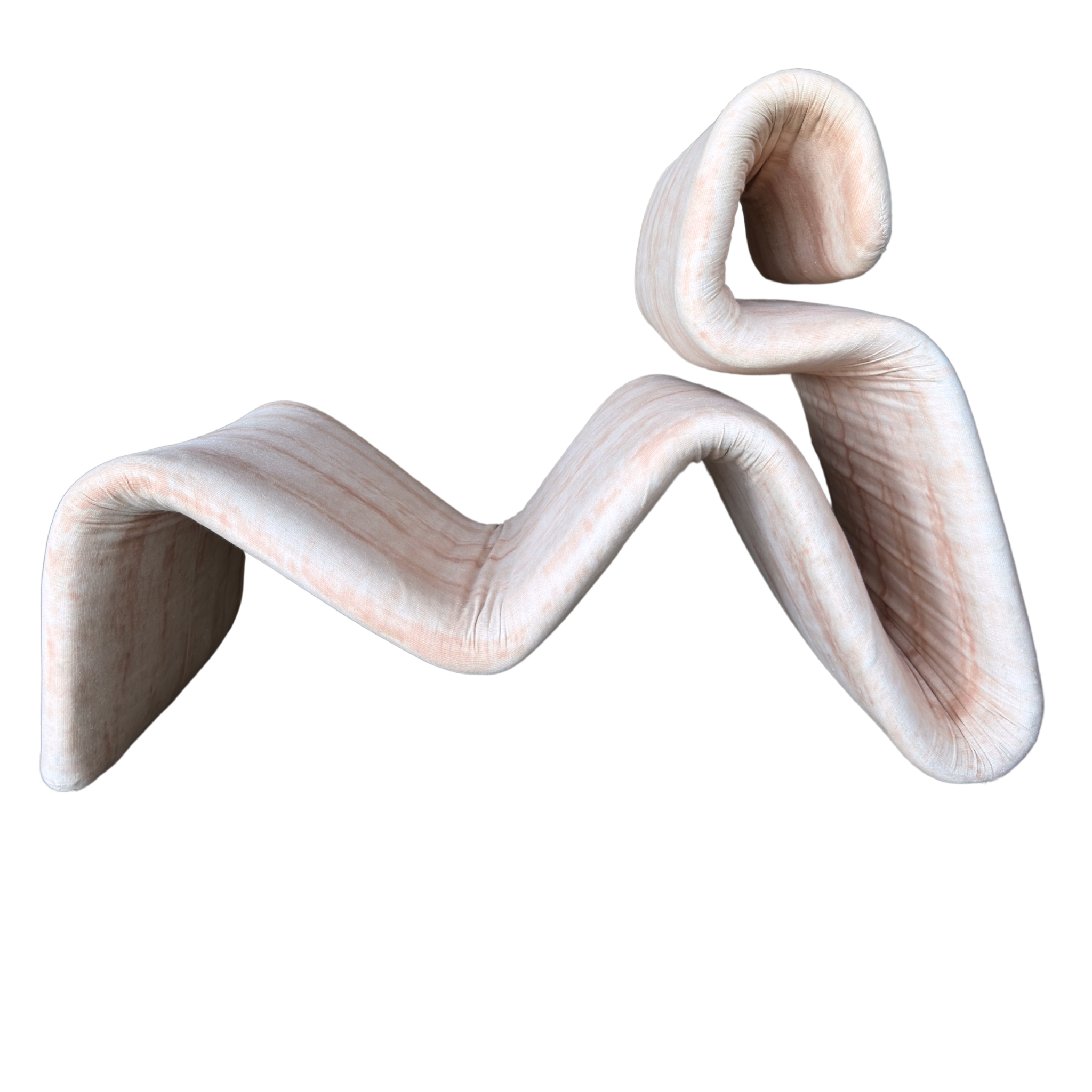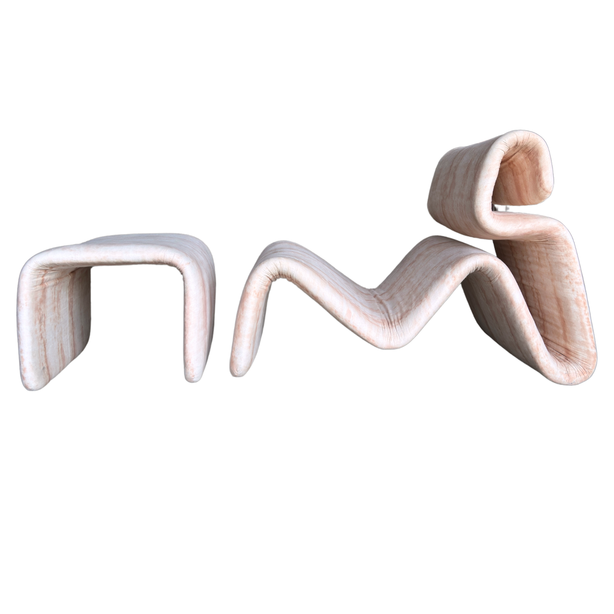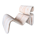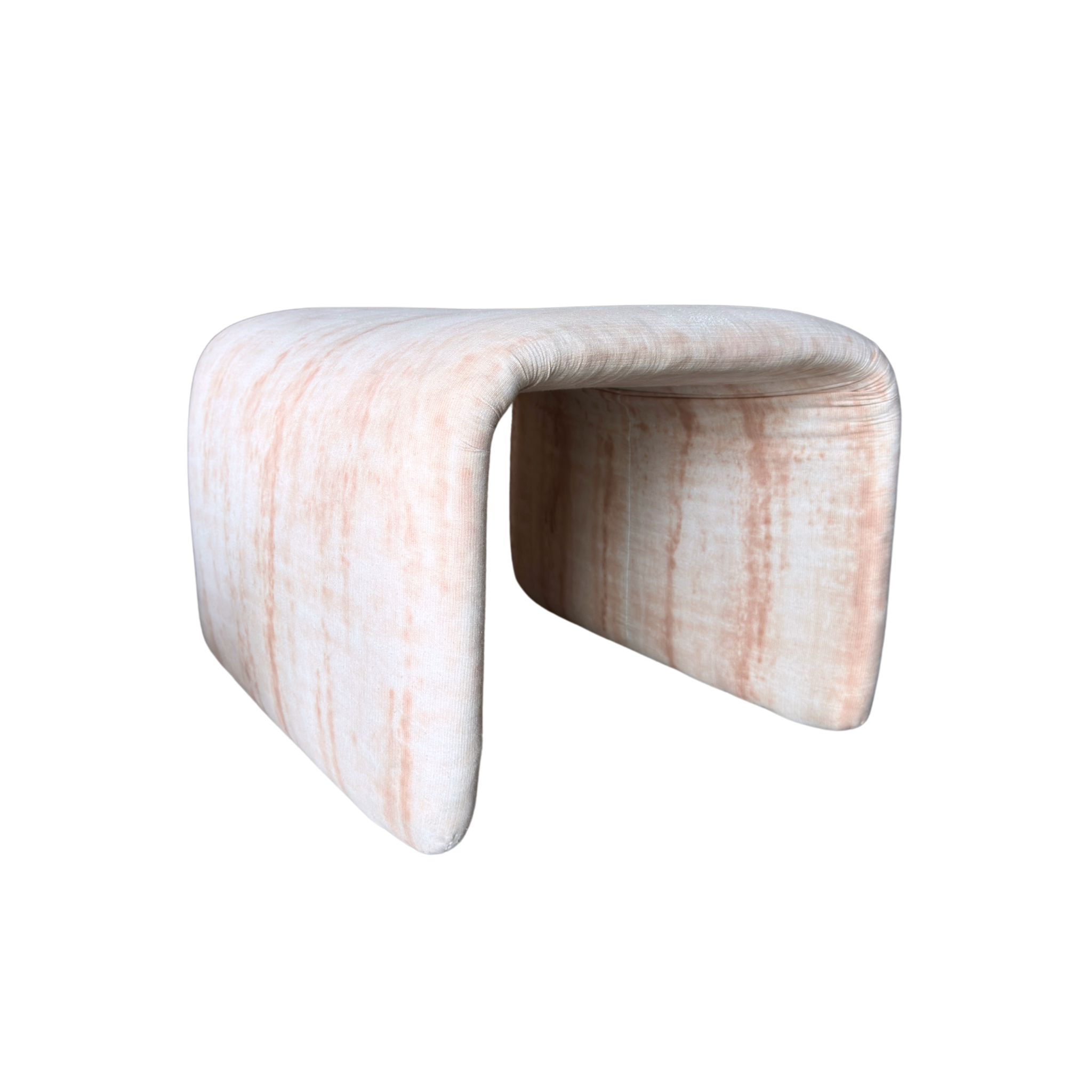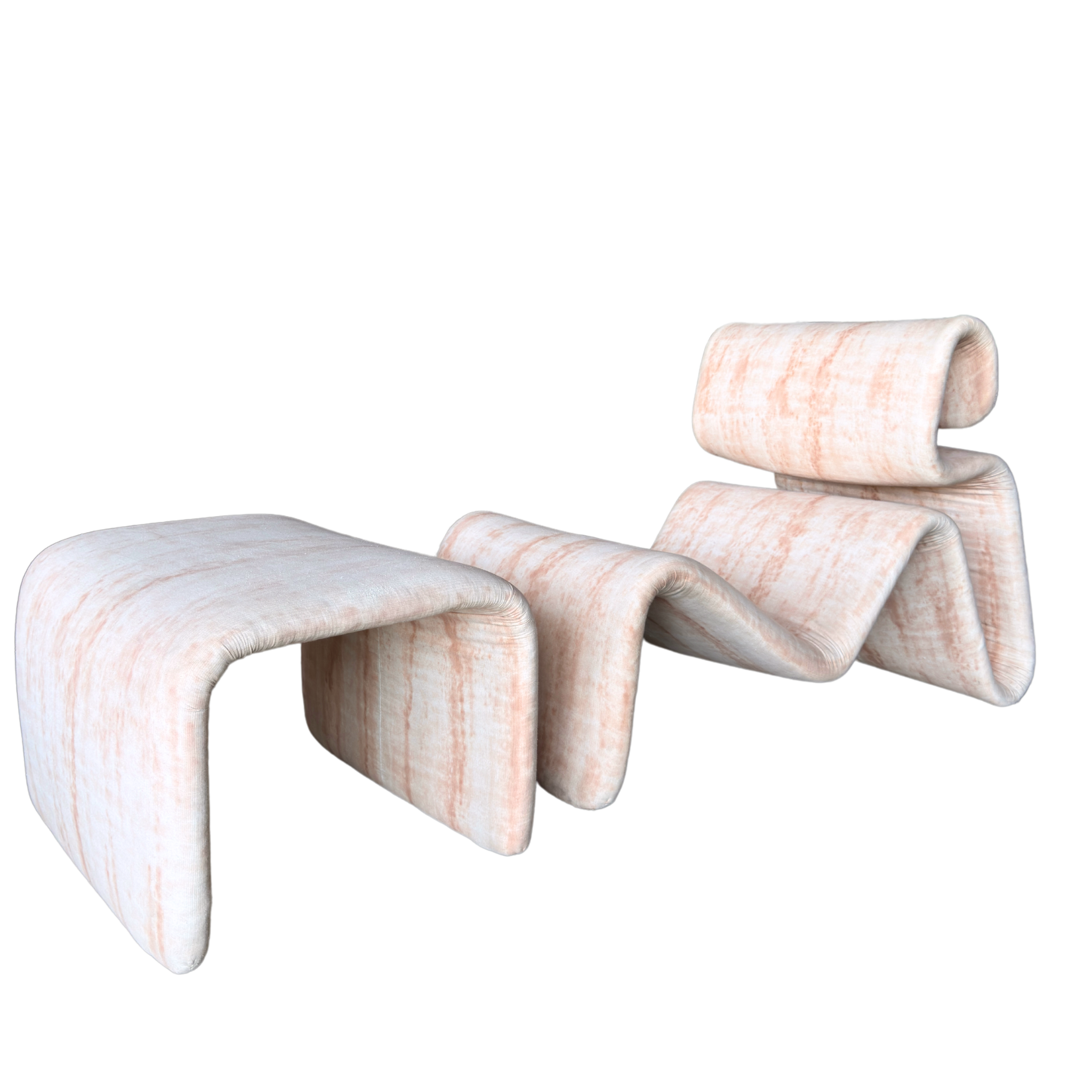 An icon of Swedish postmodern design, the Etcetera chair and ottoman by Jan Ekselius for J.O. Carlsson features a wave form wrapped in original blush pink tie dye. Upholstered over a steel and elastic frame, the design balances softness with structural tension, making it one of the most recognizable silhouettes of the 1970s.