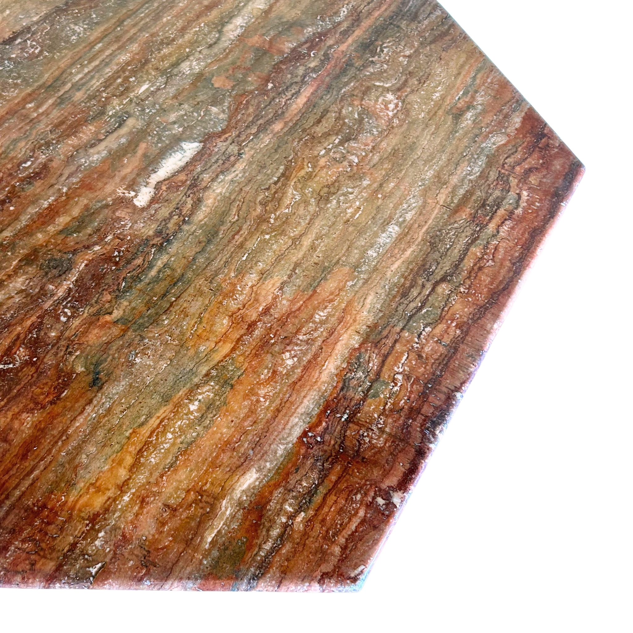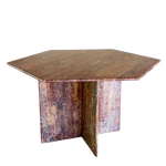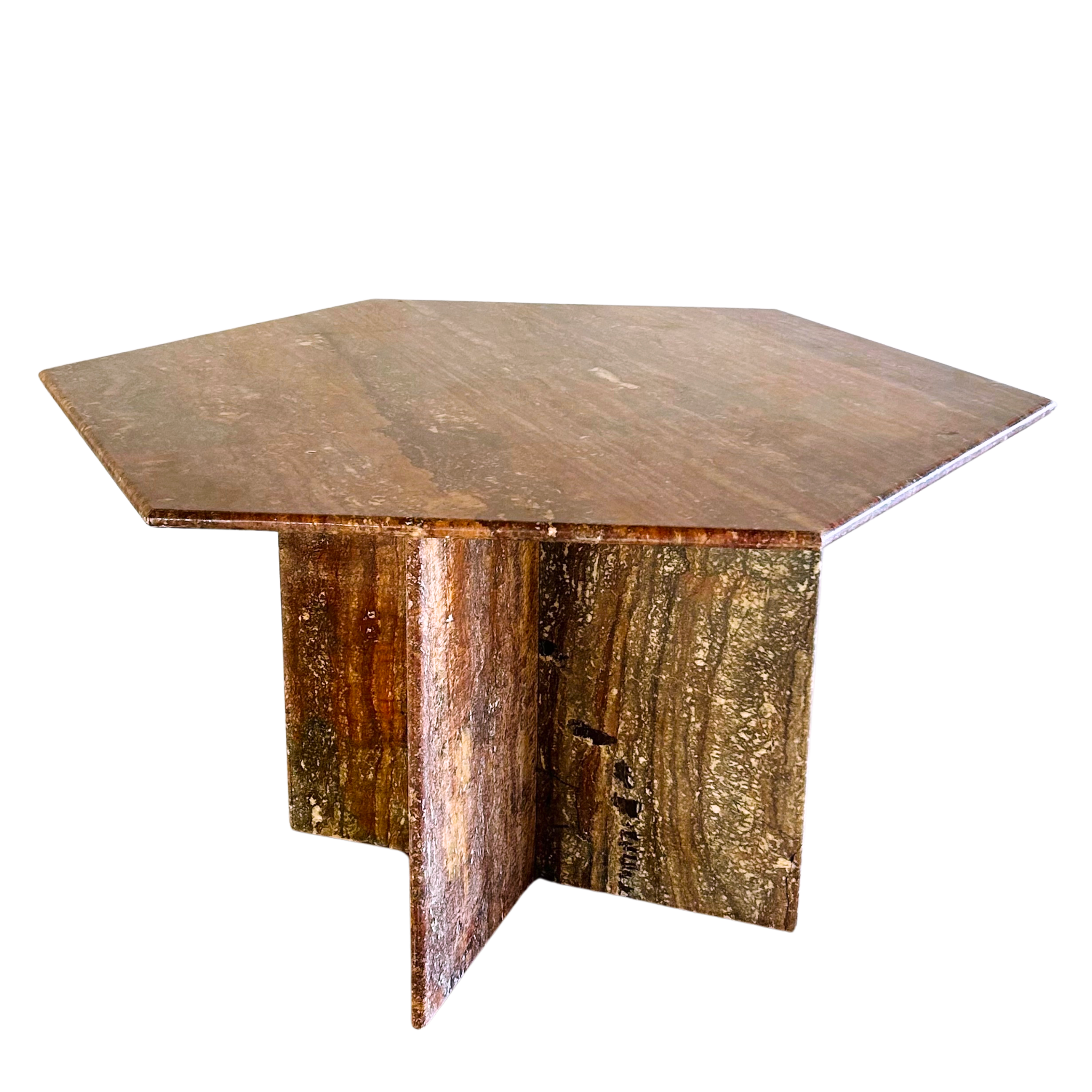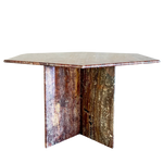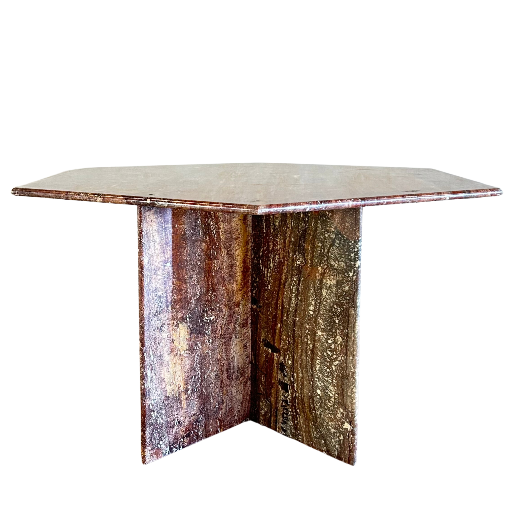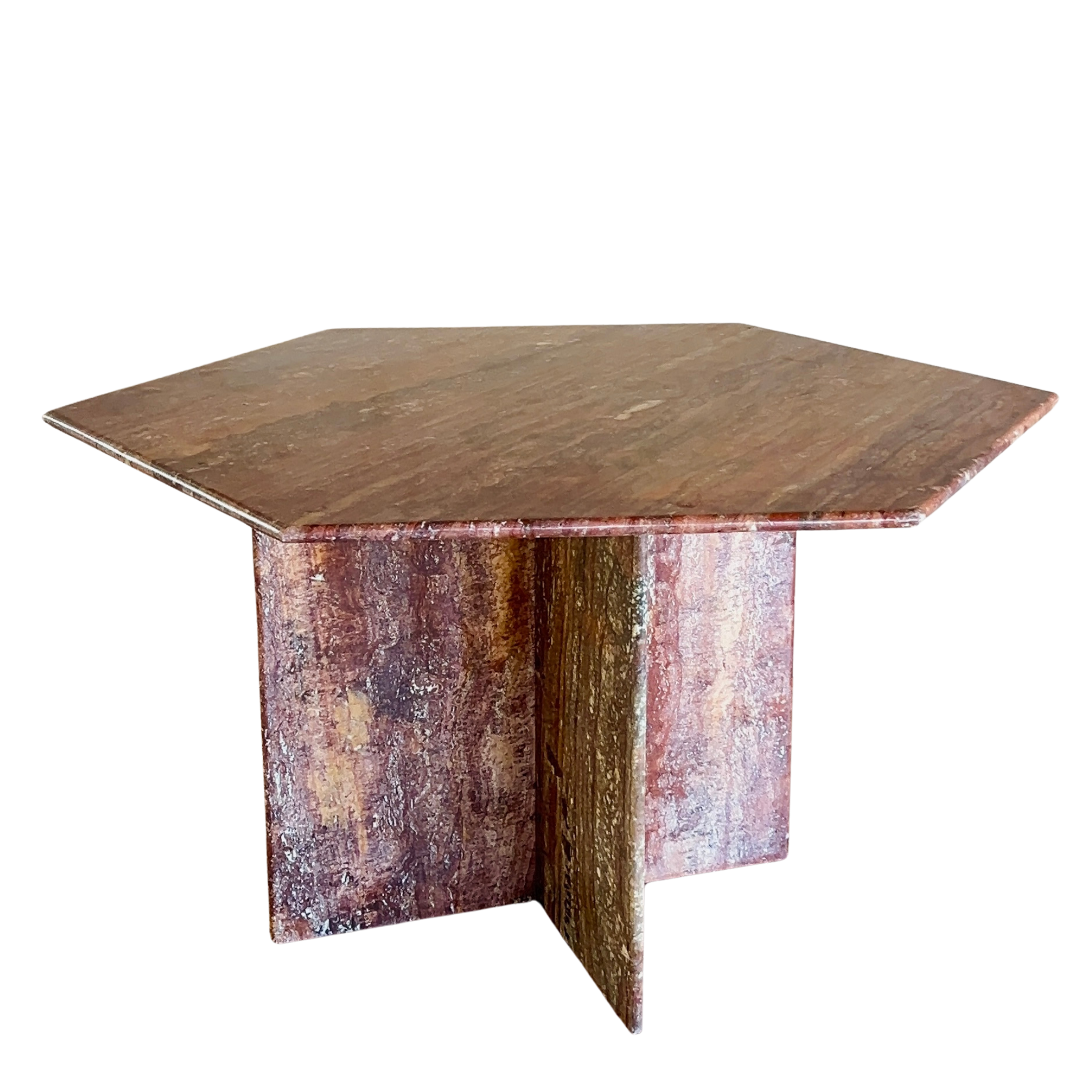 SALE- marked down from $5,500. Striking red travertine with deep veining and a bold hexagonal top, anchored by a sculptural cross base. Strong geometry meets natural drama.