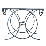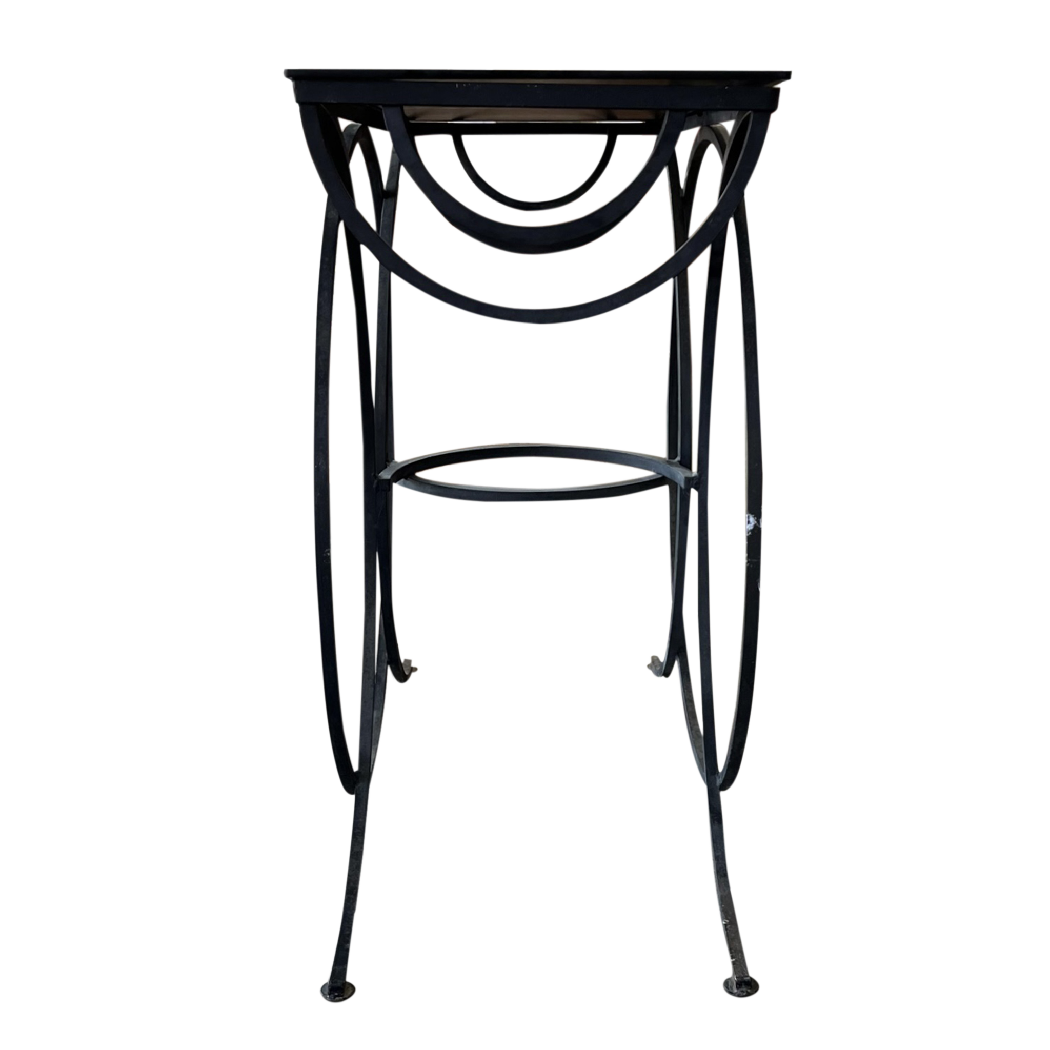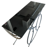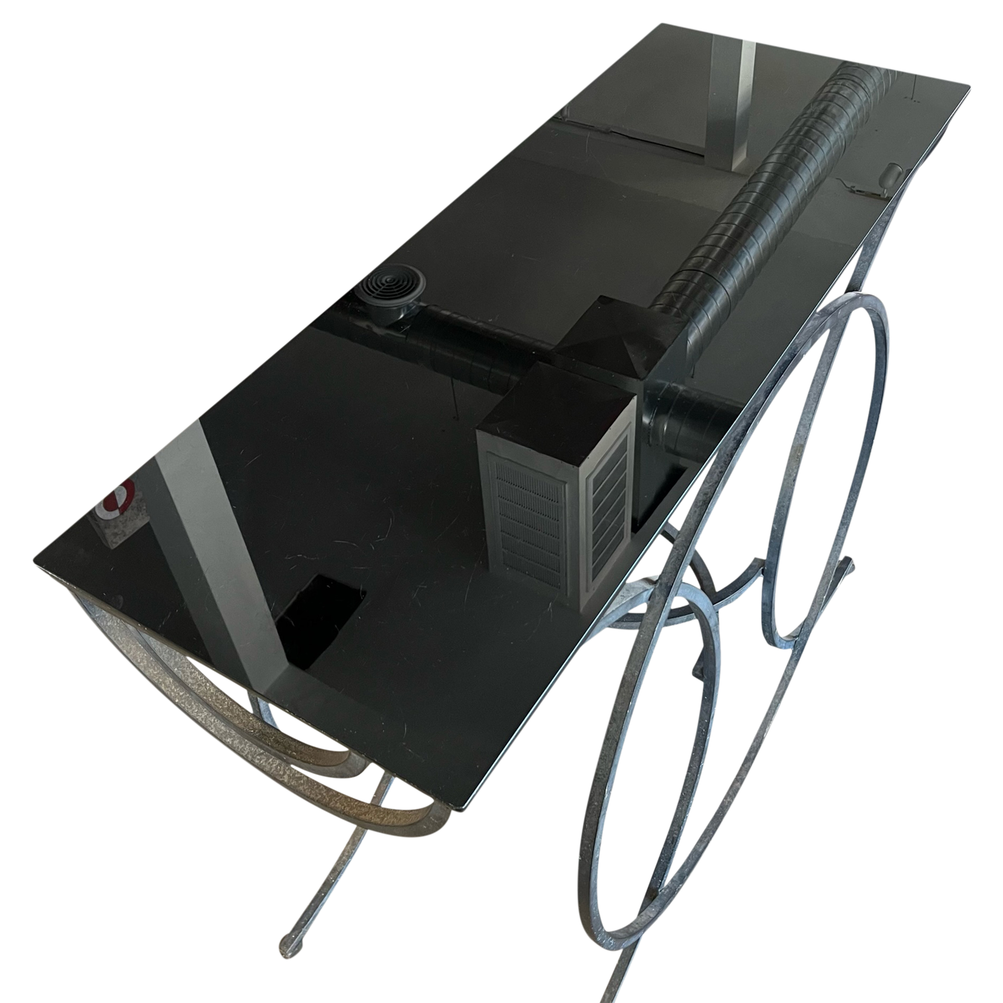 SALE: Marked down from $2,450. A sleek console table featuring a sturdy iron frame paired with a smooth smoked glass top. The combination of materials creates a sophisticated, contemporary look with a subtle, moody edge.