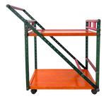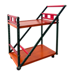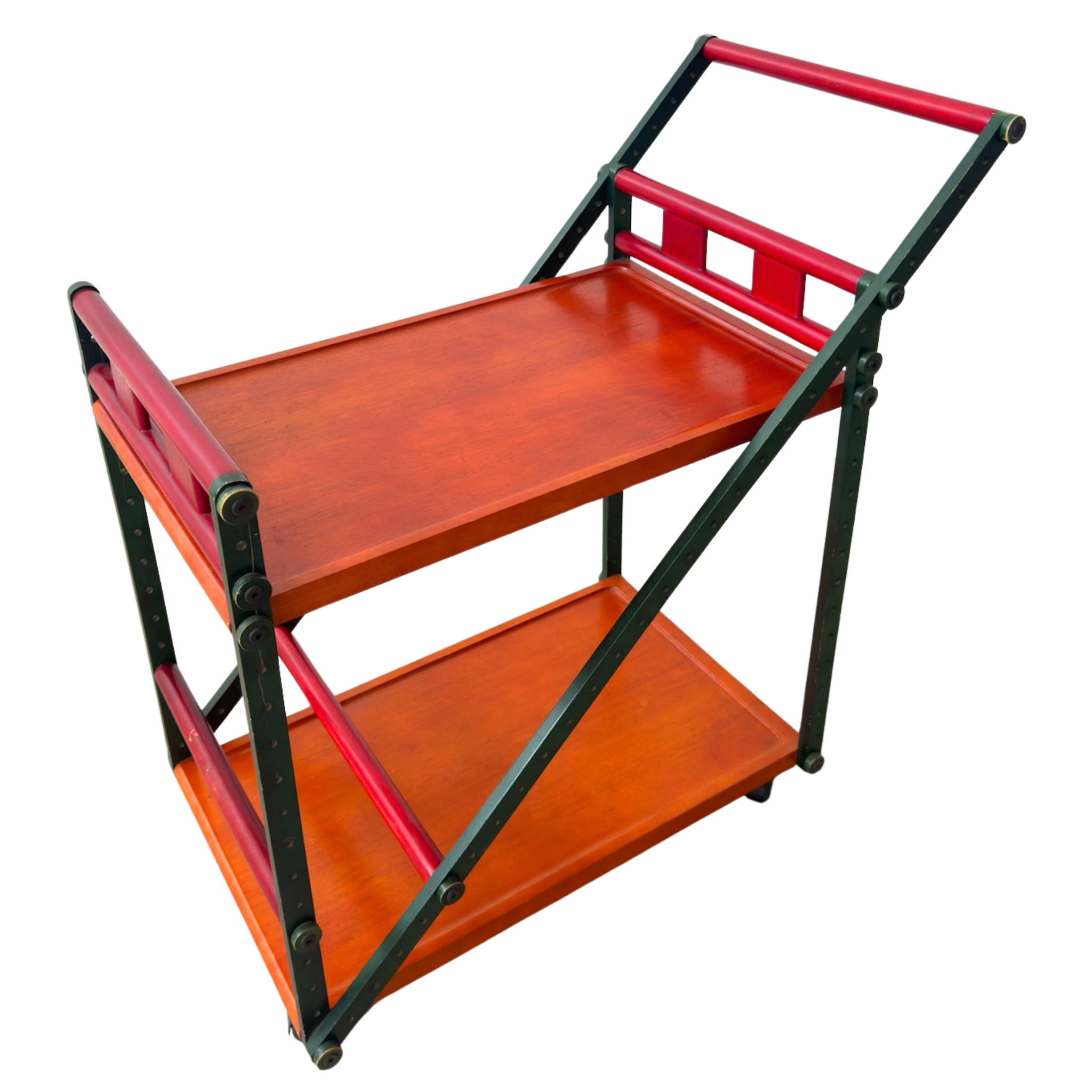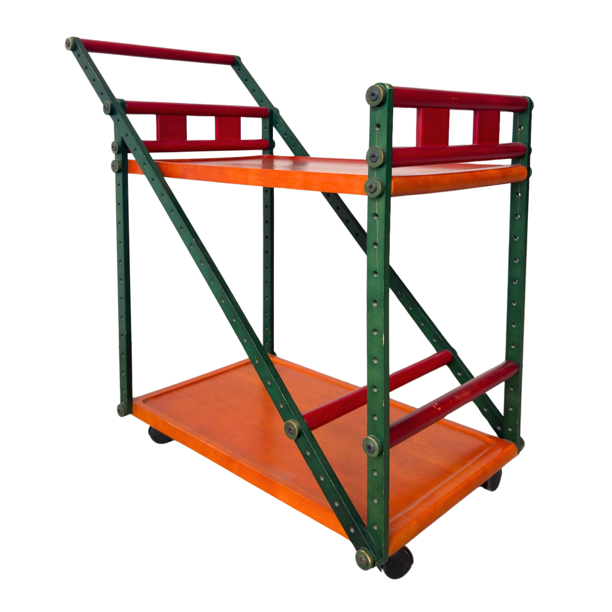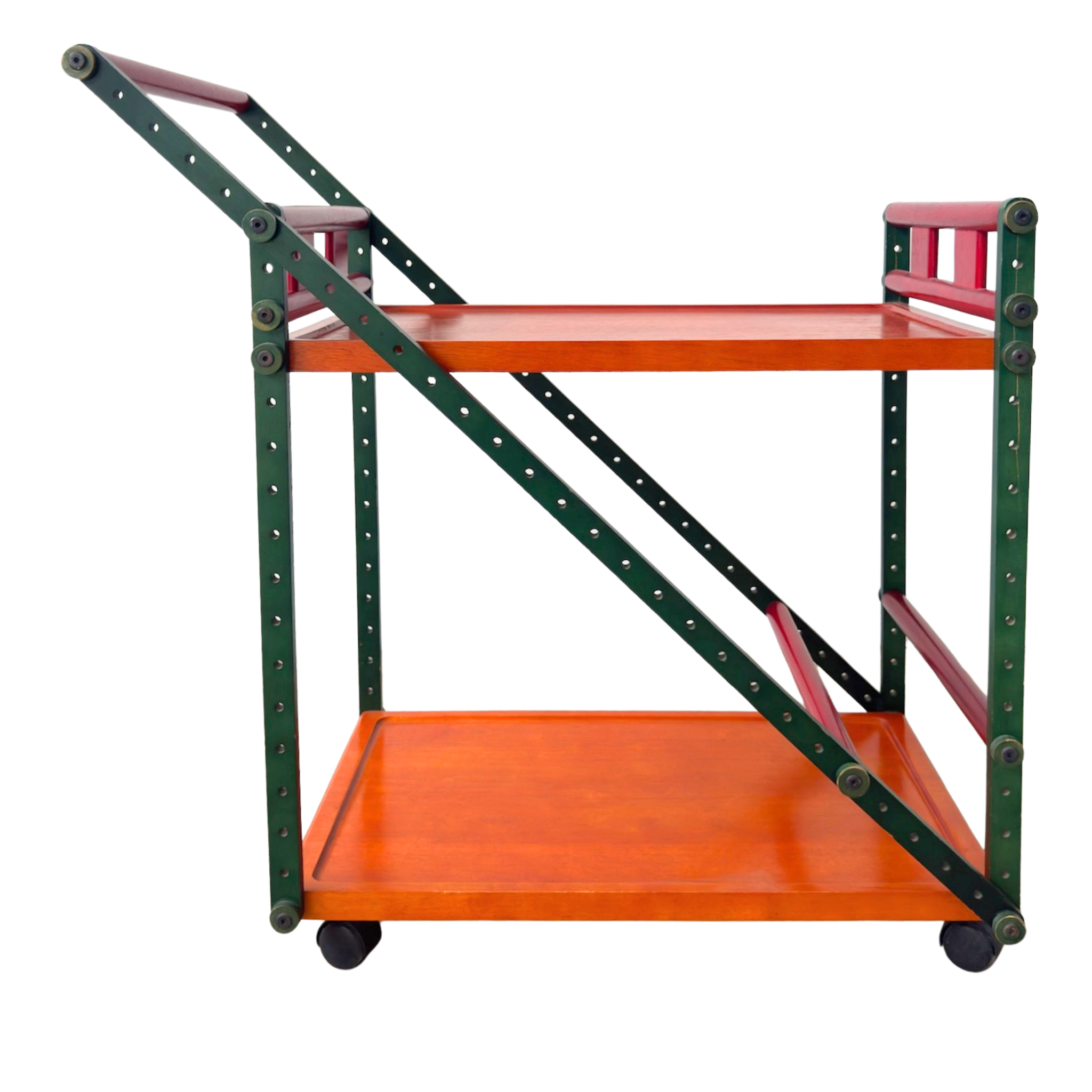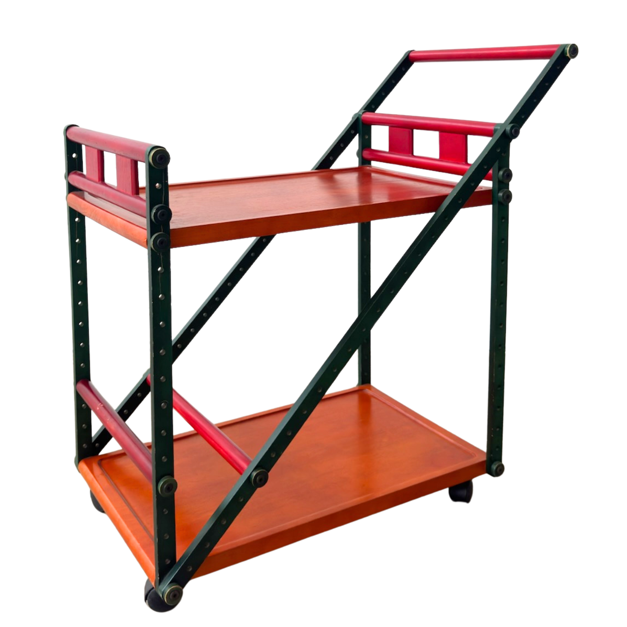 Italian postmodern bar cart with a bold palette of paprika orange, racing green, and oxblood red. The riveted frame, geometric side rails, and industrial wheels give it a structural, almost toy like quality. Playful proportions with a graphic edge.