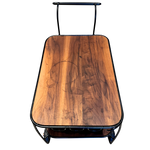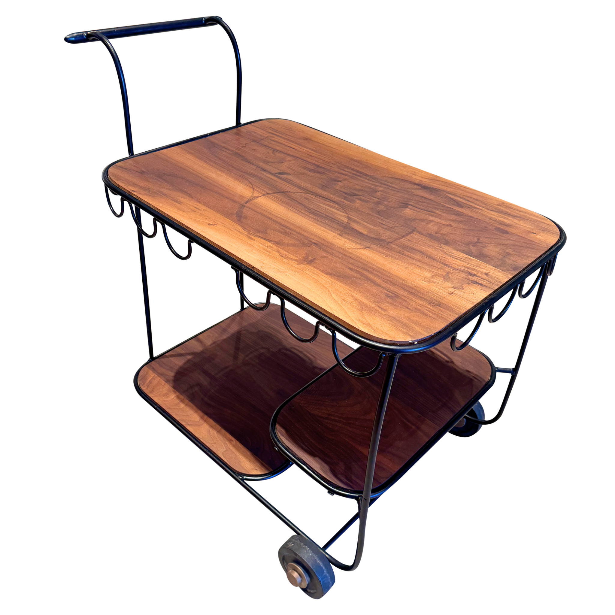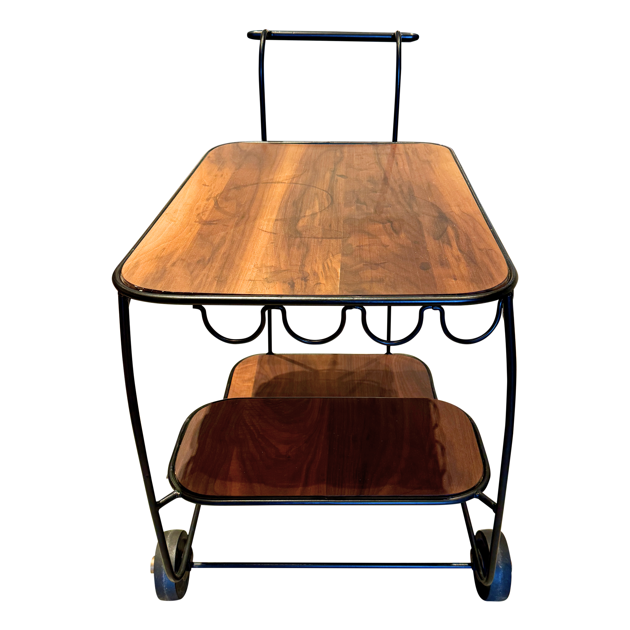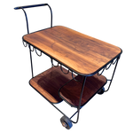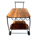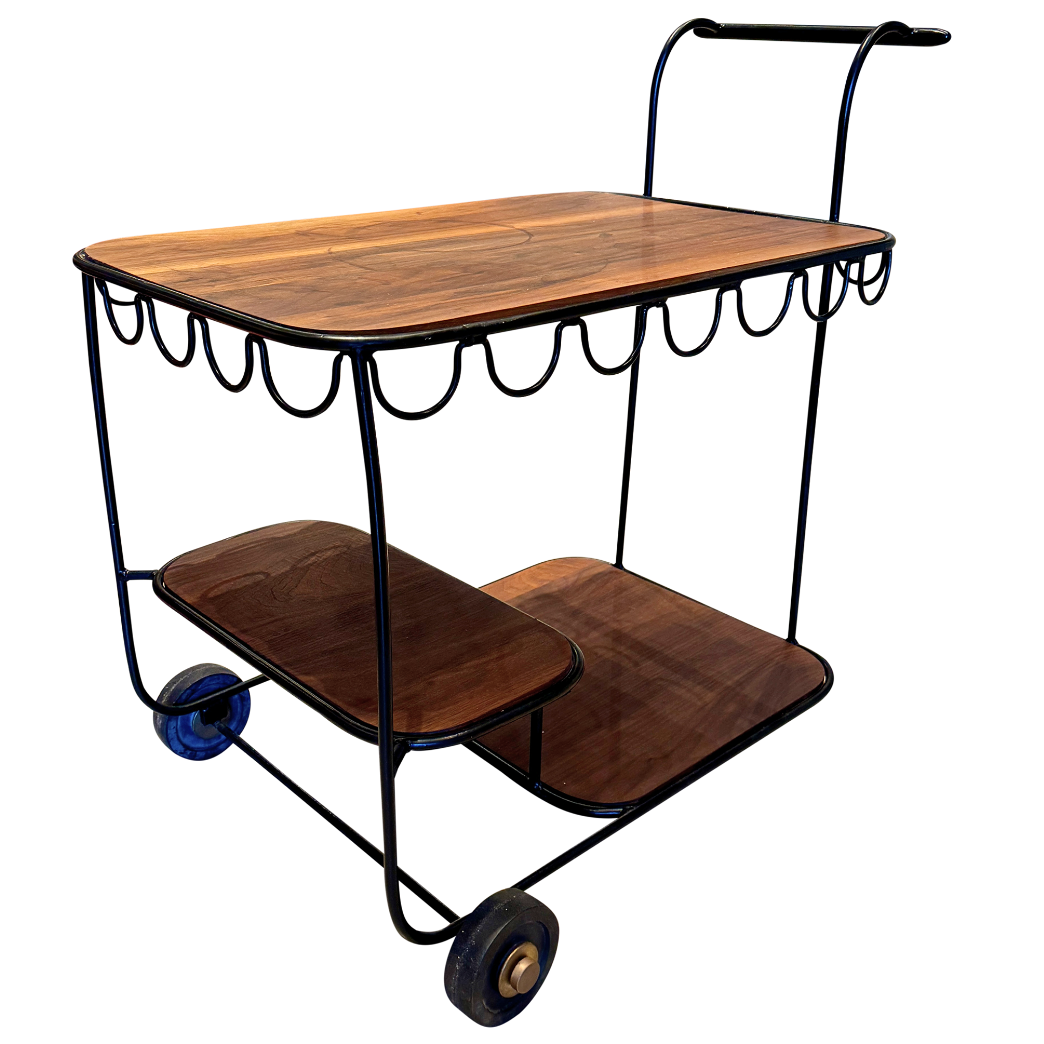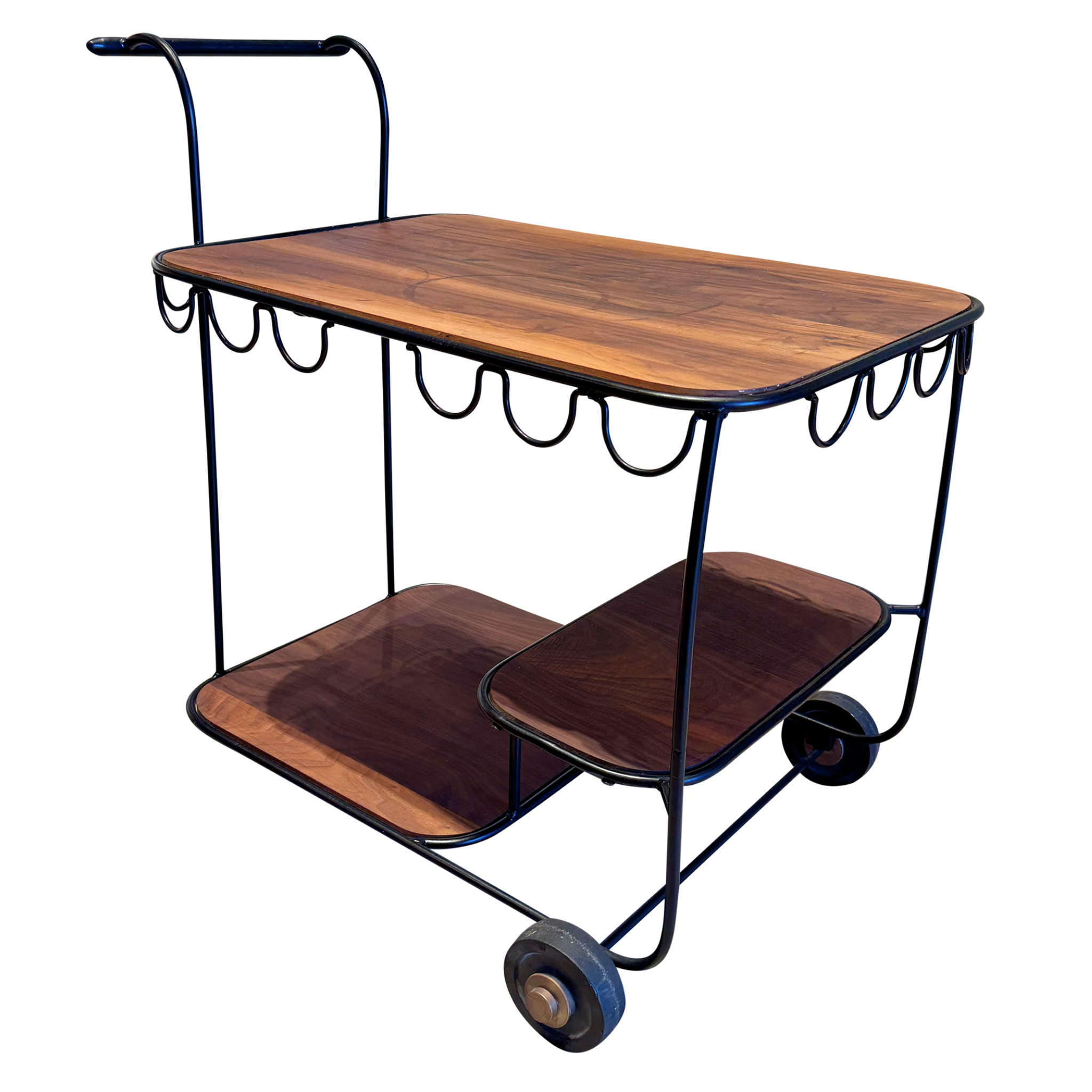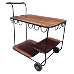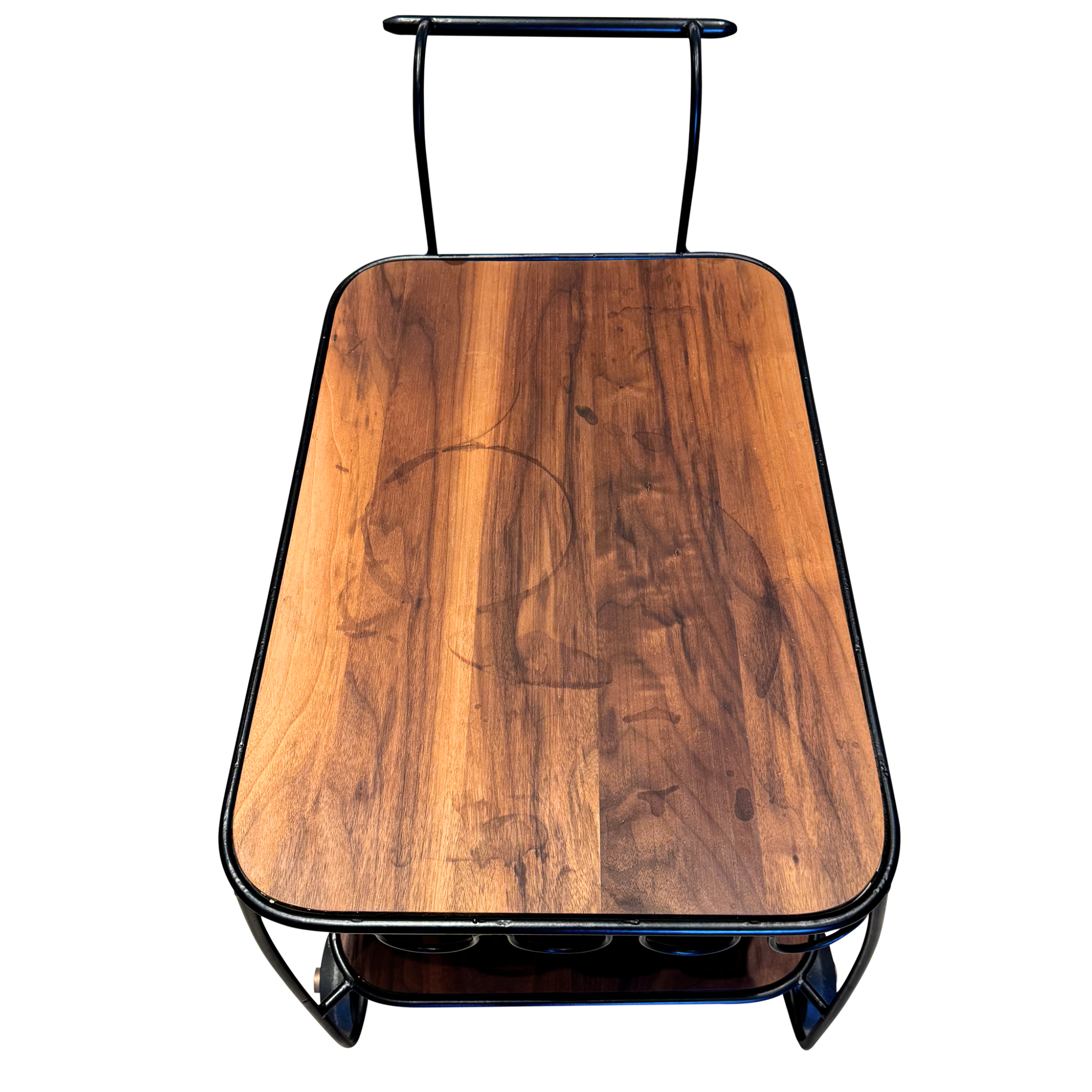 Sleek lines meet warm grain in this sculptural bar cart, crafted from richly figured walnut and framed in blackened iron. The integrated bottle rack and tiered shelving lend additional function.