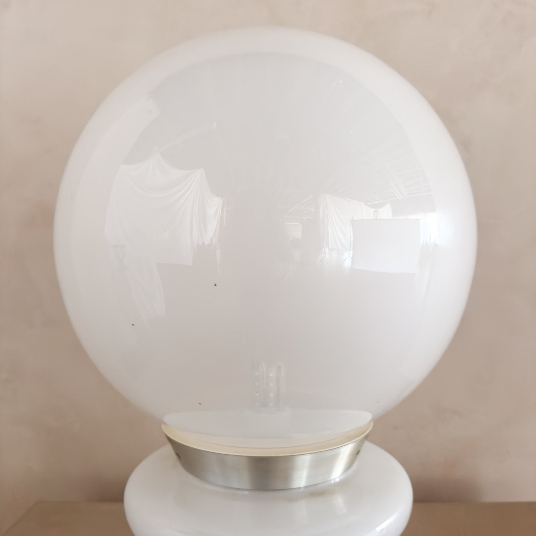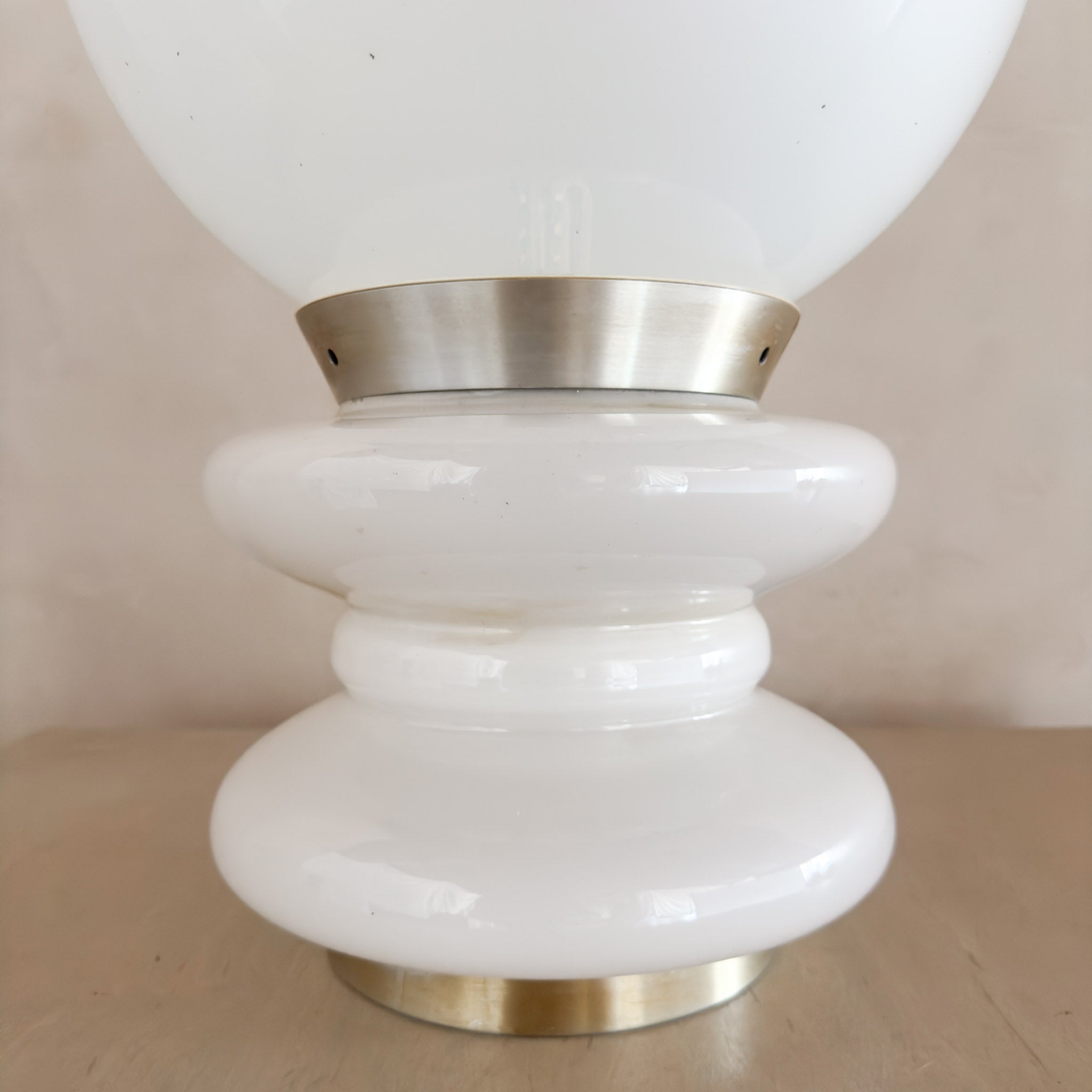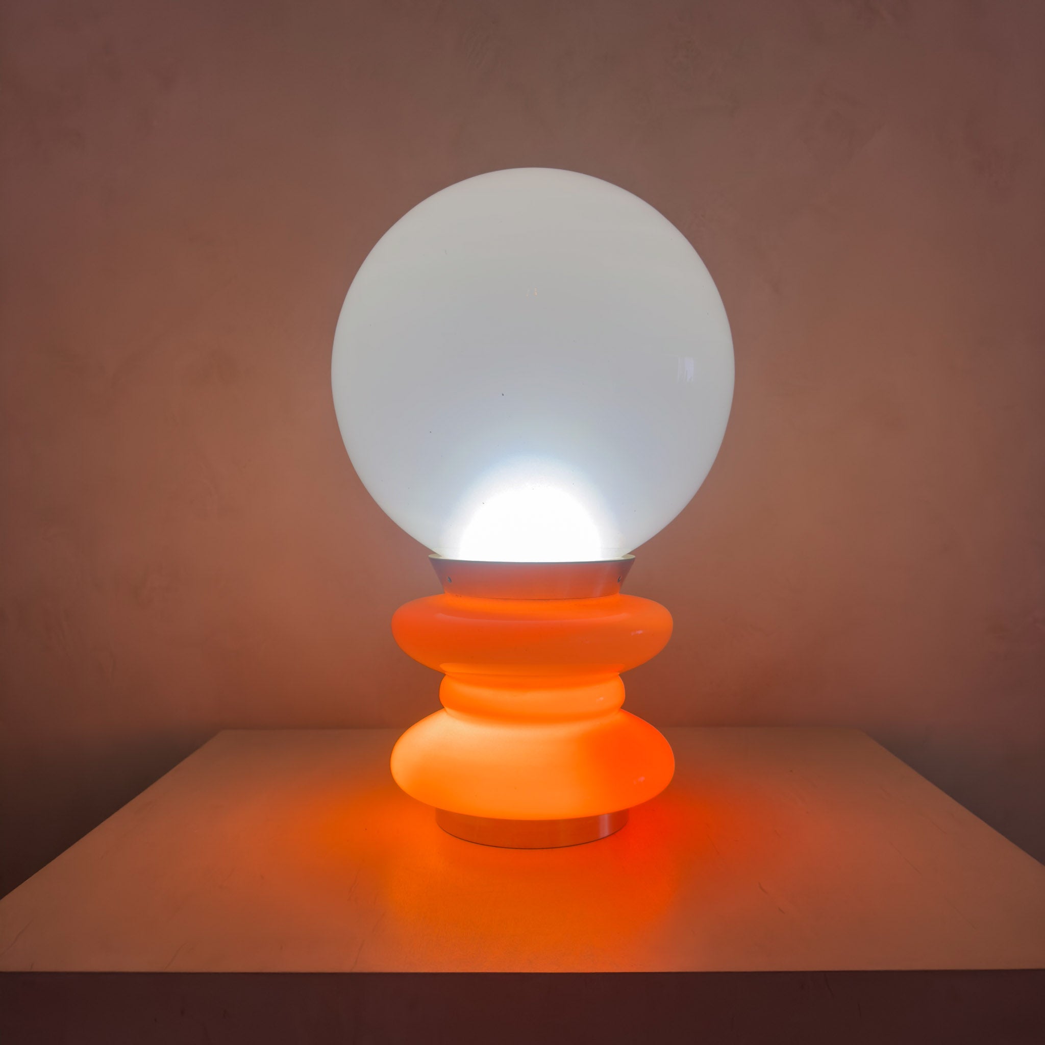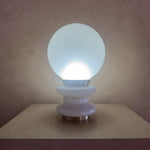 A postmodern millky glass globe set on a rounded stacked base. The all glass construction provides a soft glow when lit. Features dual lighting with individual switches for base and globe.