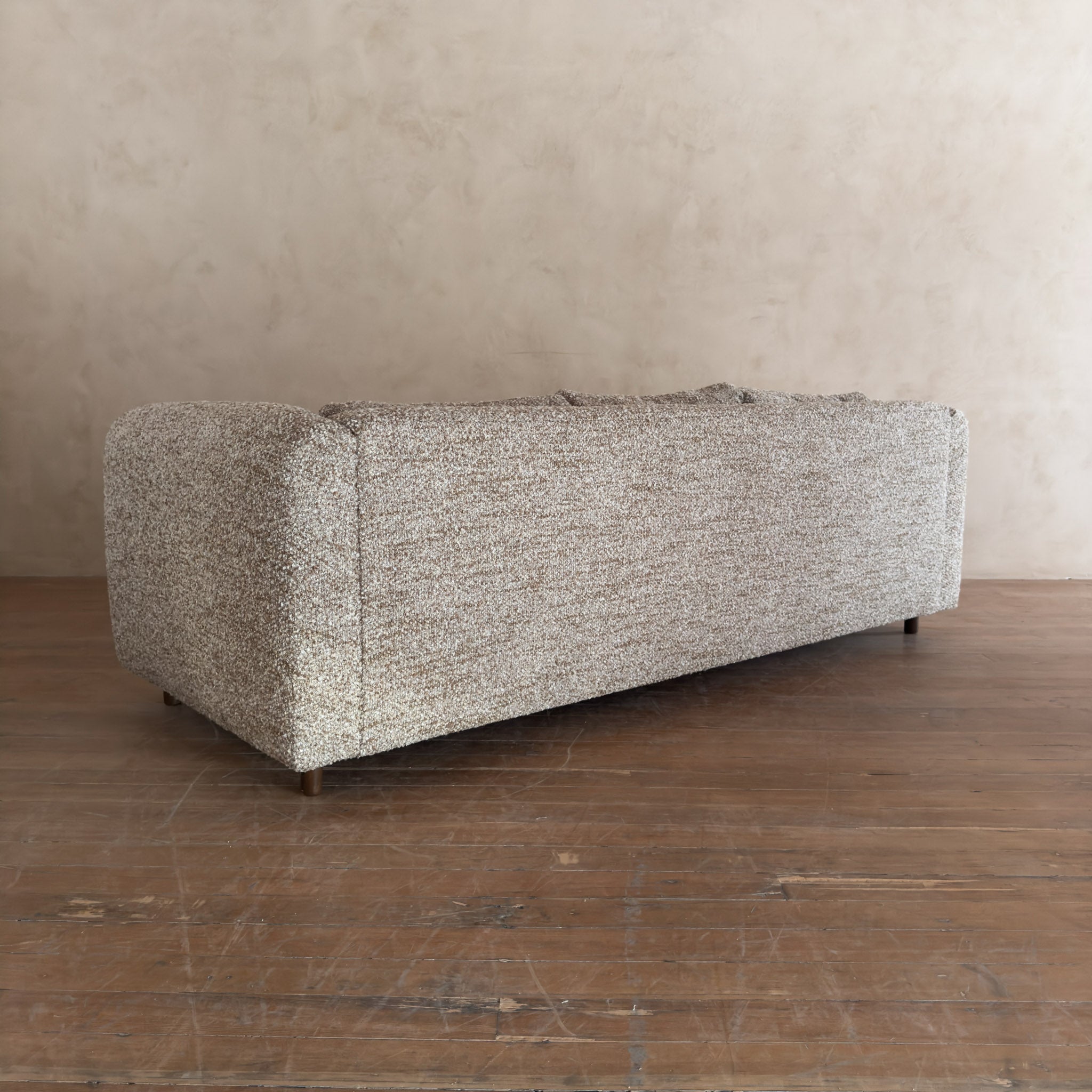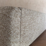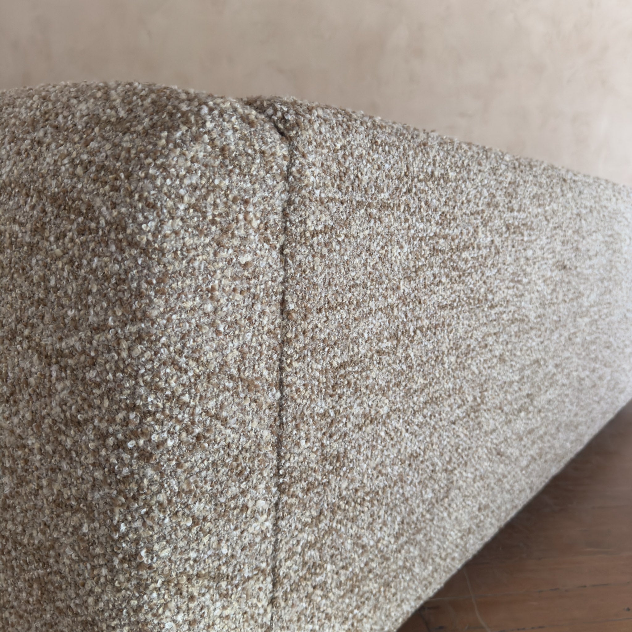 Low, wide frame with solid oak side panels and exposed bolts. The wood is warm and simple, with softly rounded corners and short turned legs. Newly reupholstered in a dense oatmeal alpaca bouclé.