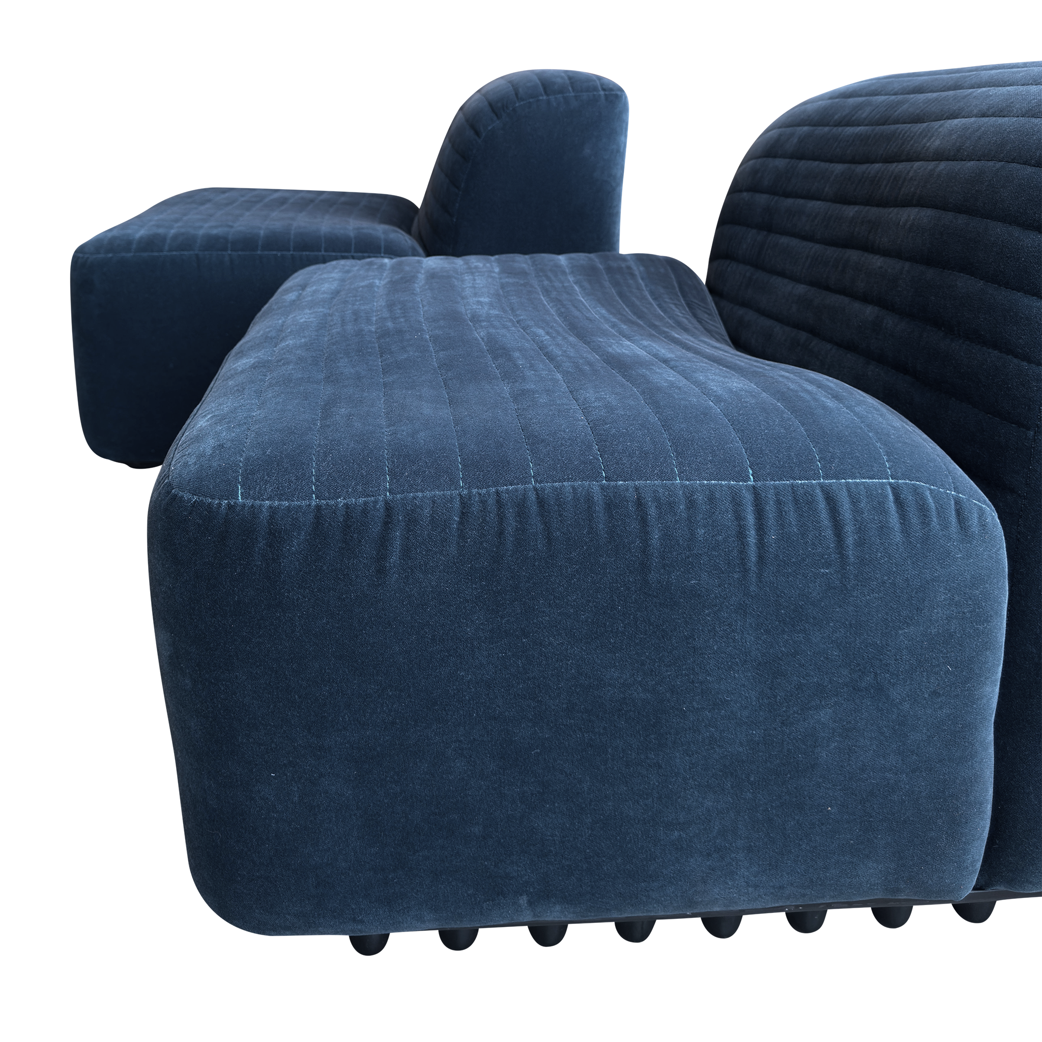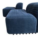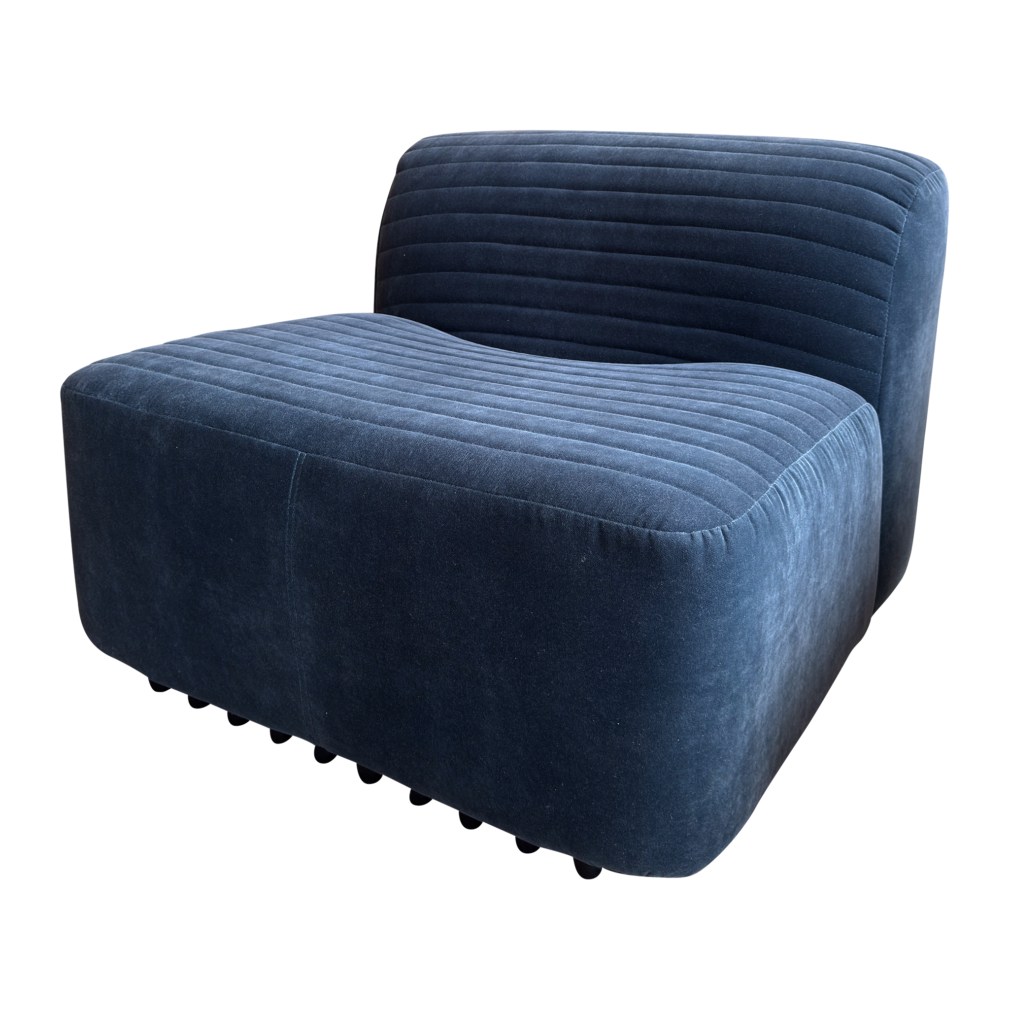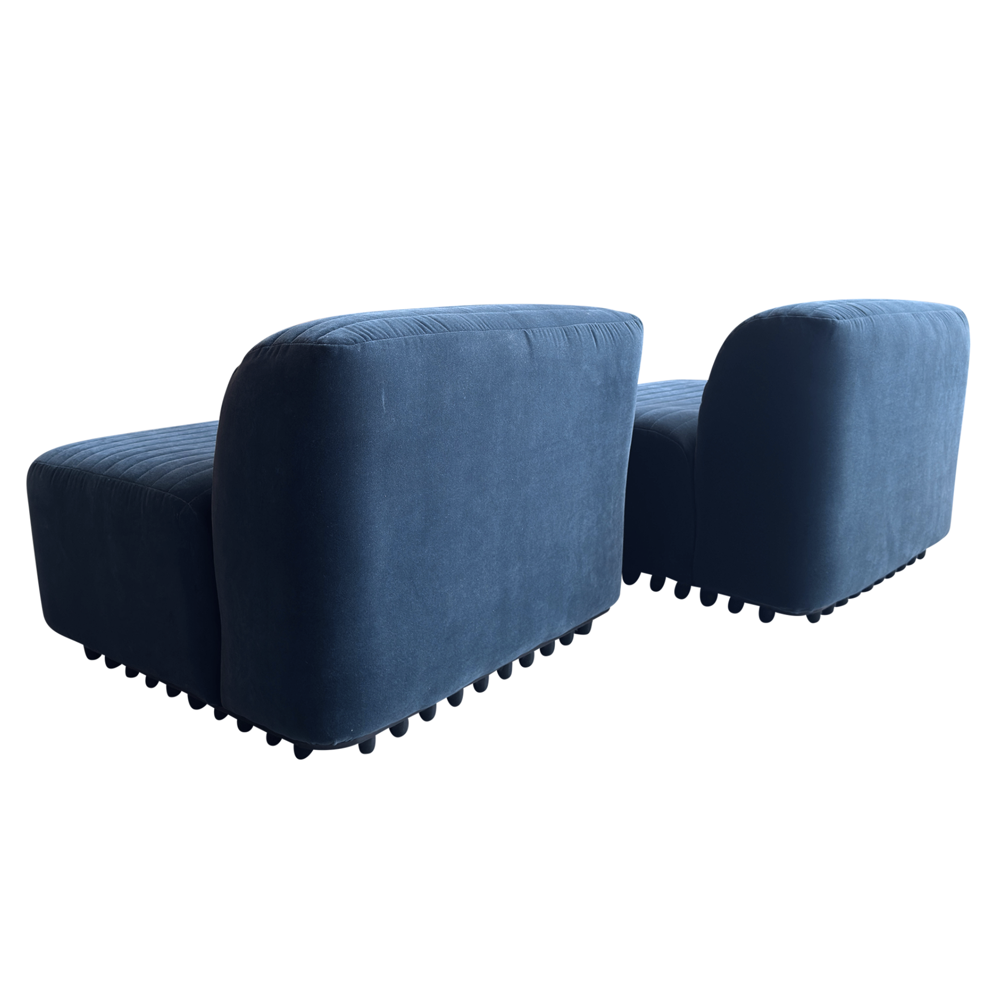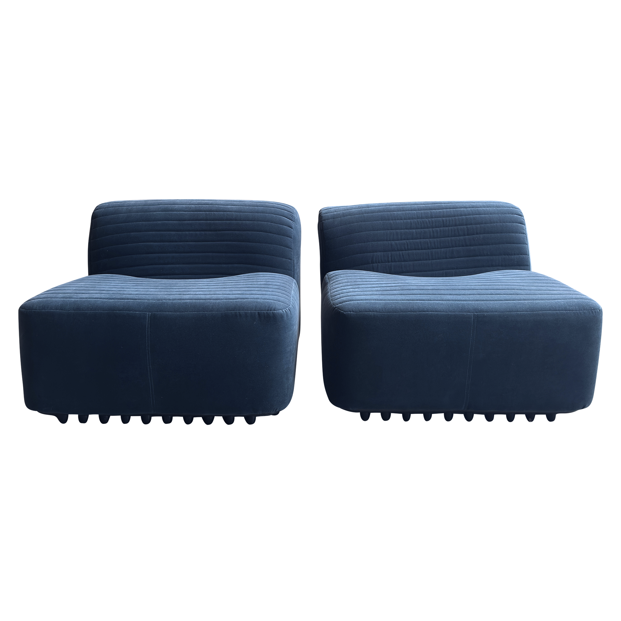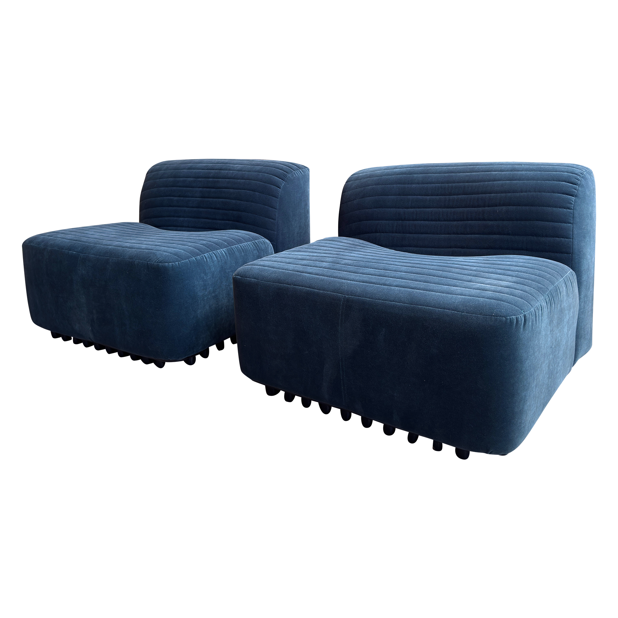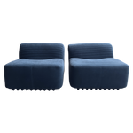 SALE- marked down from $4,550. Designed by Titina Ammannati and Gianpiero Vitelli for Brunati Italia, this pair of slipper chairs features new blue velvet upholstery on the original vintage frames. They have horizontal channel tufting that runs across both seat and backrest, and rest on original molded fiberglass bases.