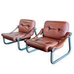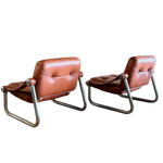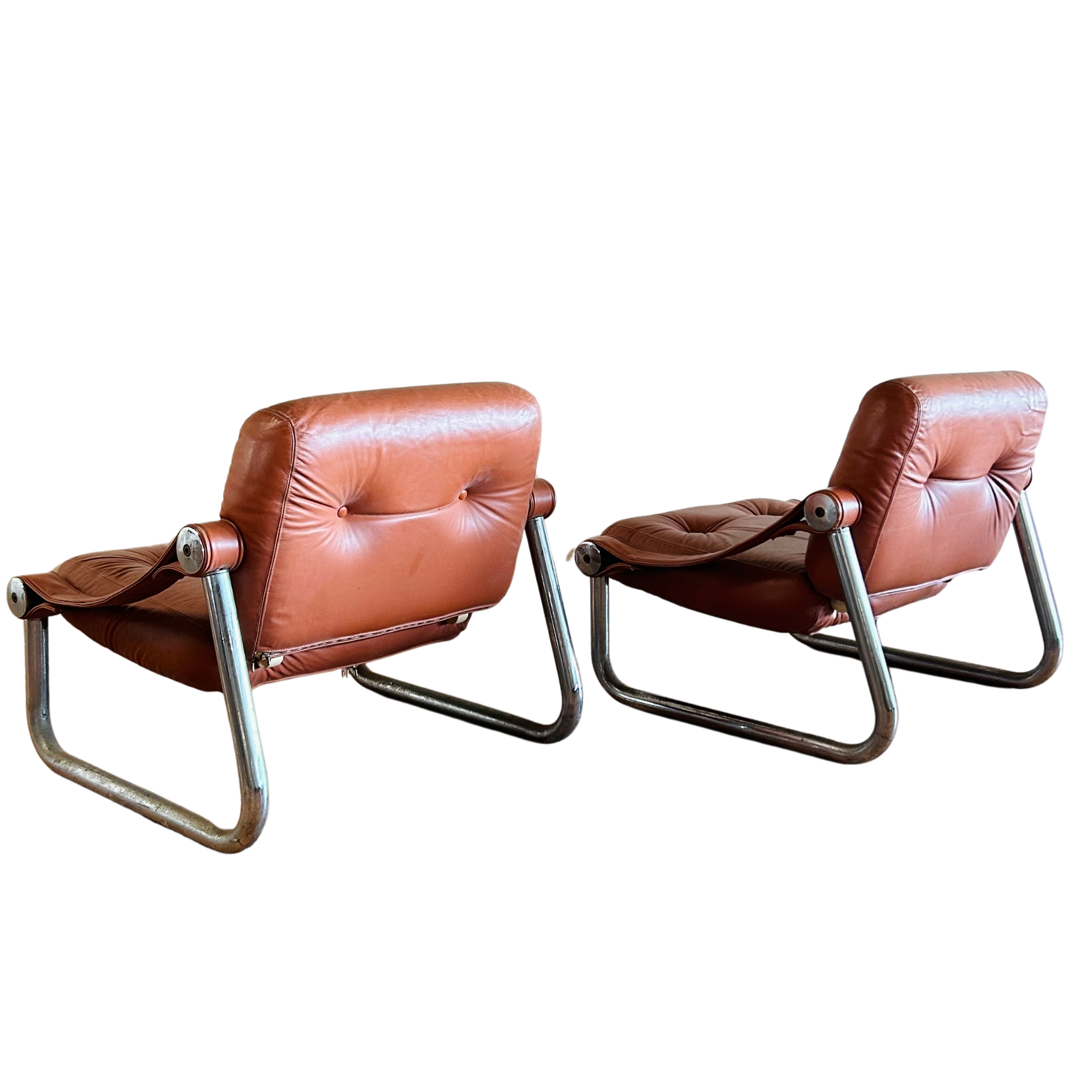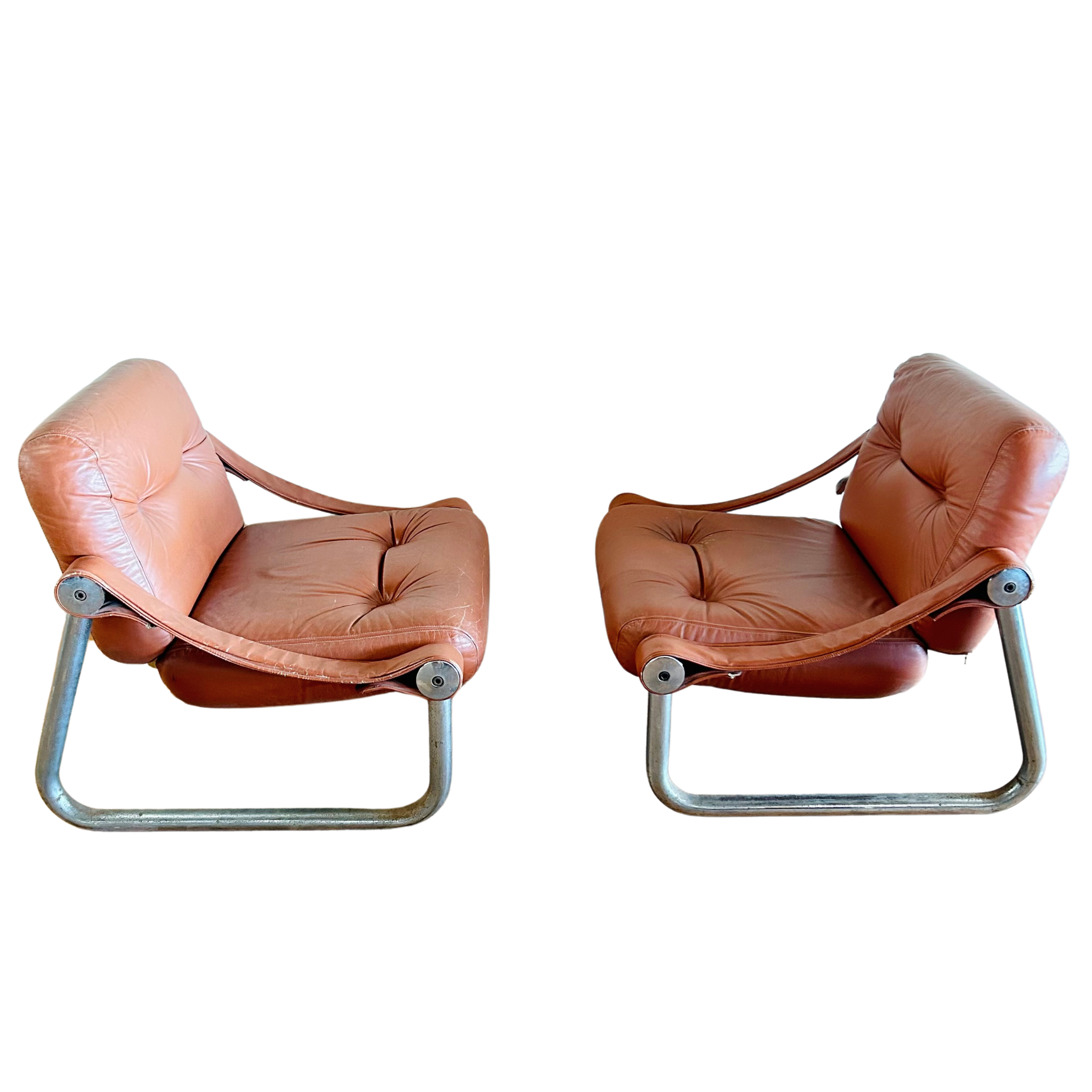 SALE- marked down from $2,450/ pair. 4 Chairs Total, Sold in Pairs. Pair of Italian armchairs with chrome frames and leather sling seats. The angled design offers a relaxed sit, while the visible hardware adds a subtle industrial touch. Streamlined, functional, and well worn in all the right ways.