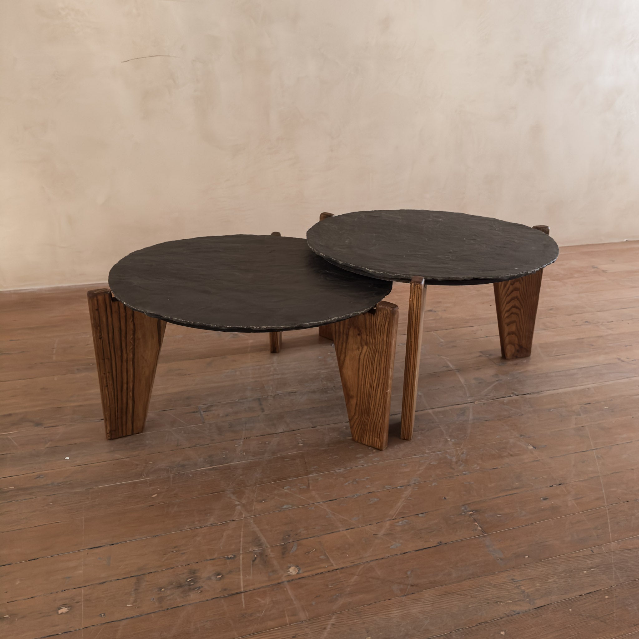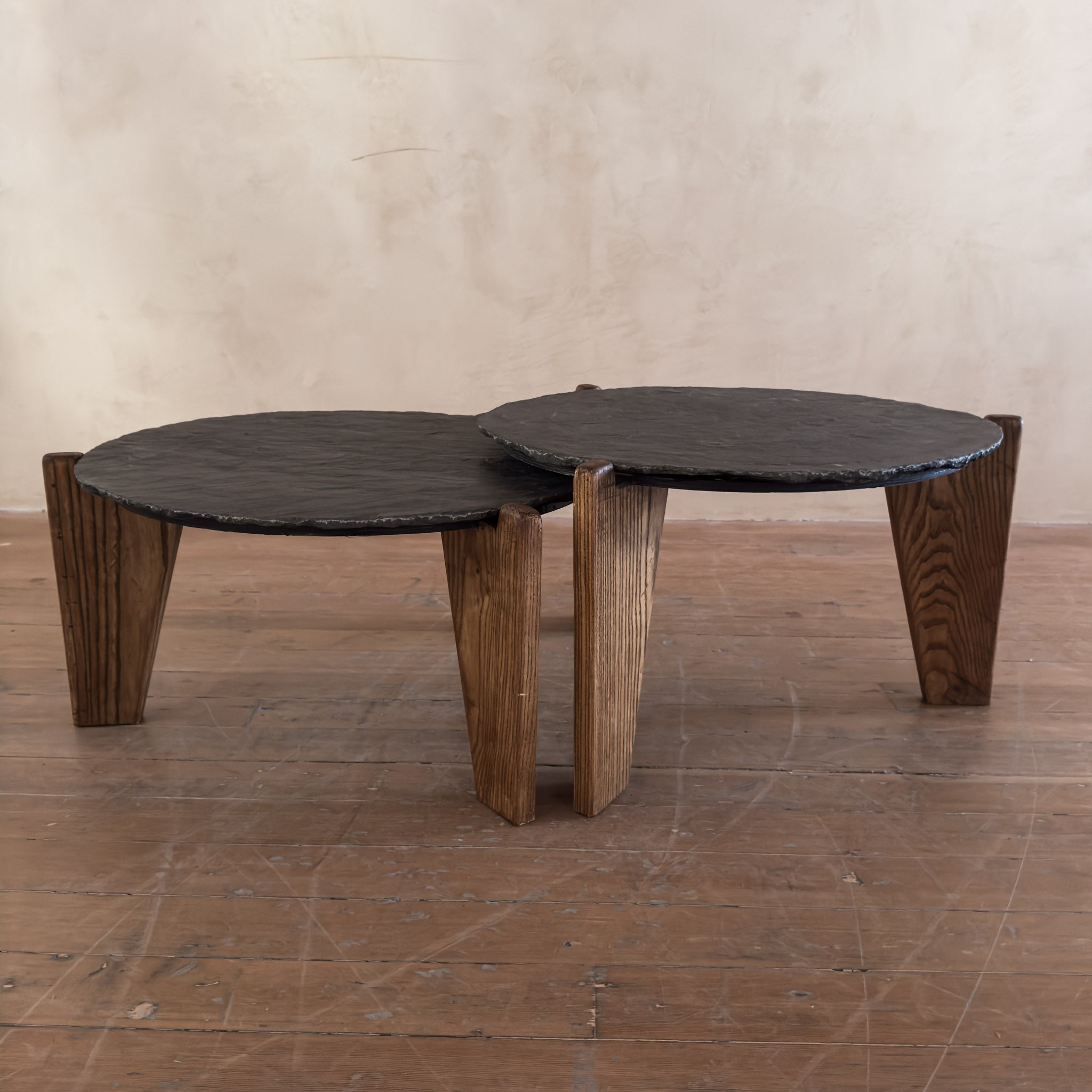 Each table features a slate top on solid oak legs. The slate has a rough, natural surface, and the oak bases use a simple three leg cut typical of French seventies workshop furniture.