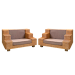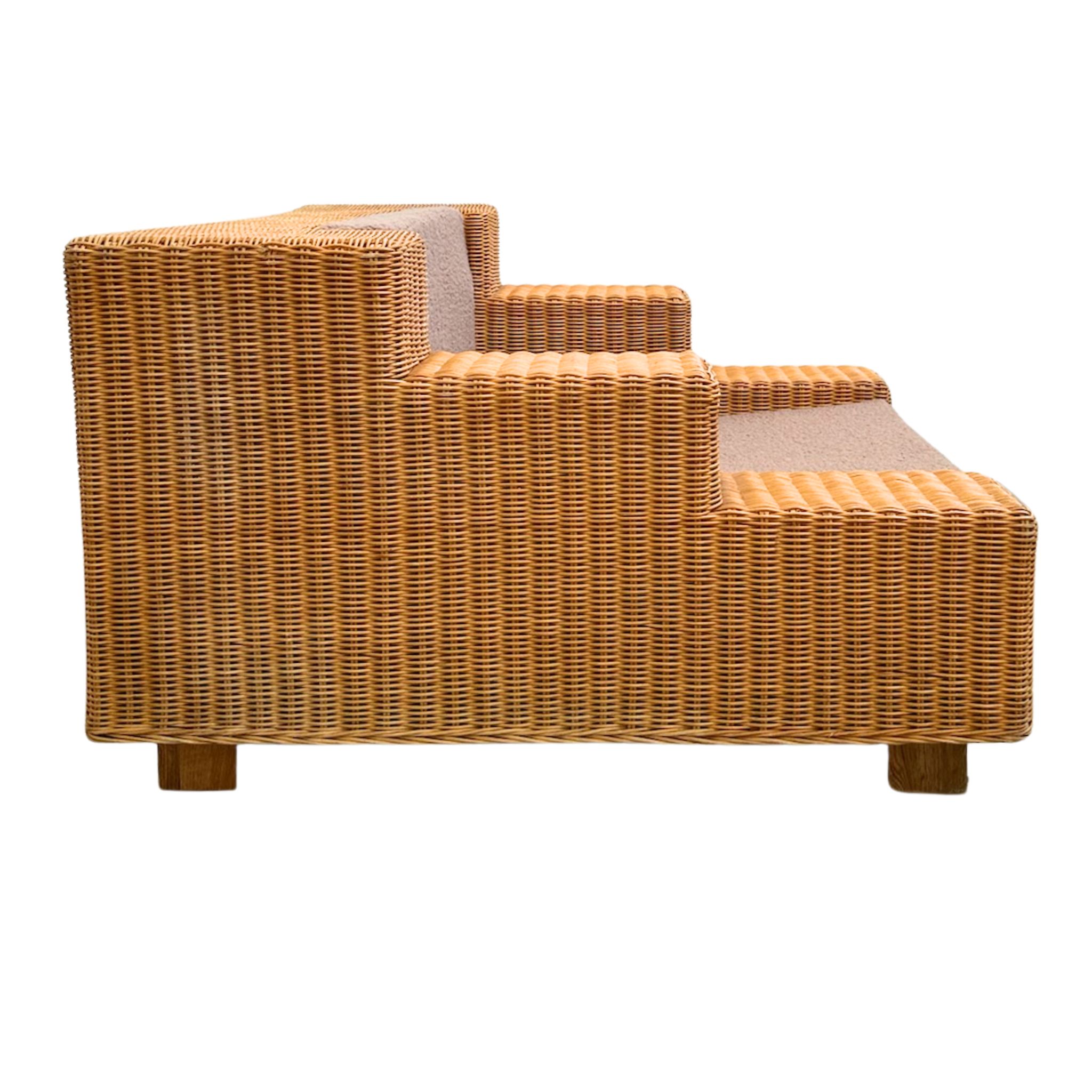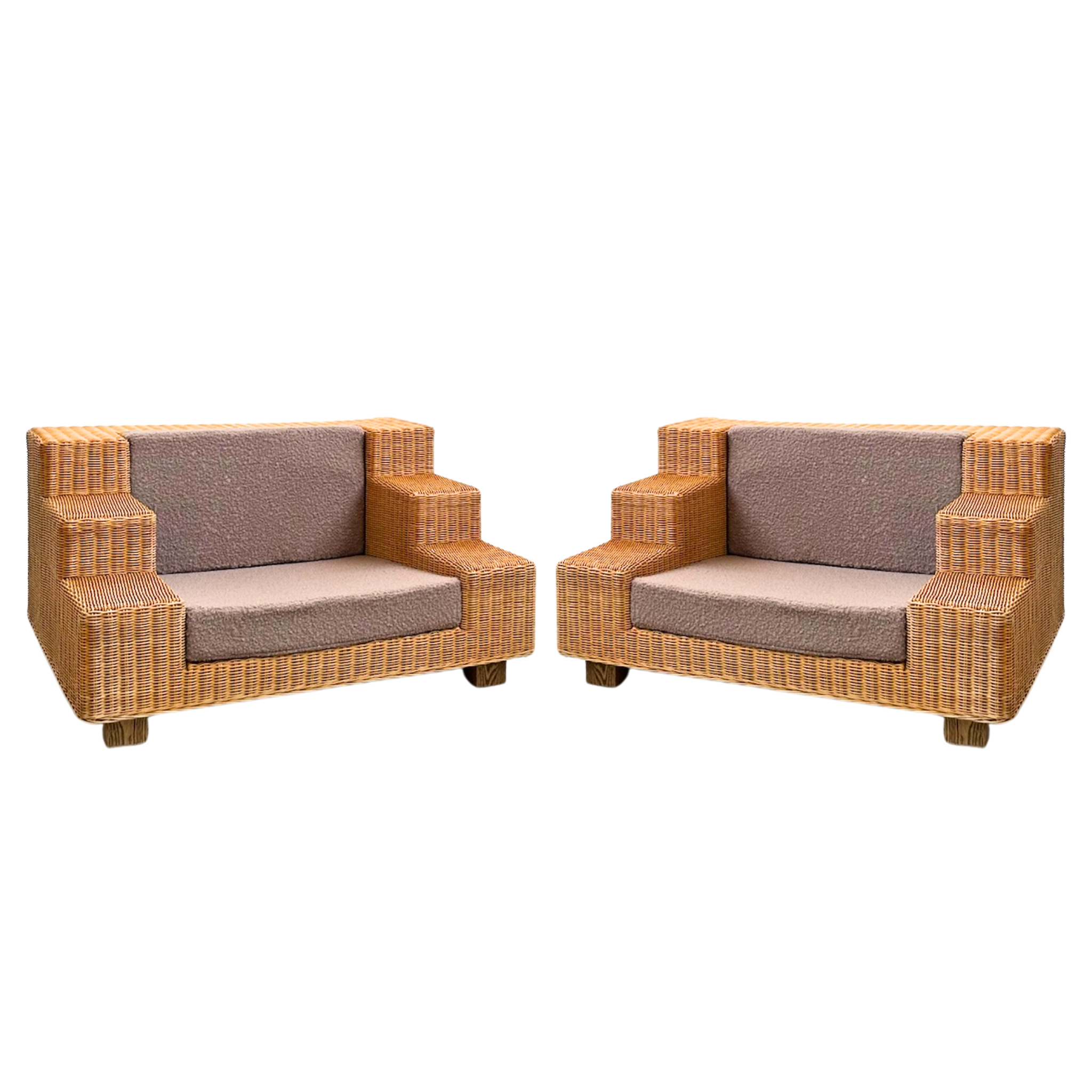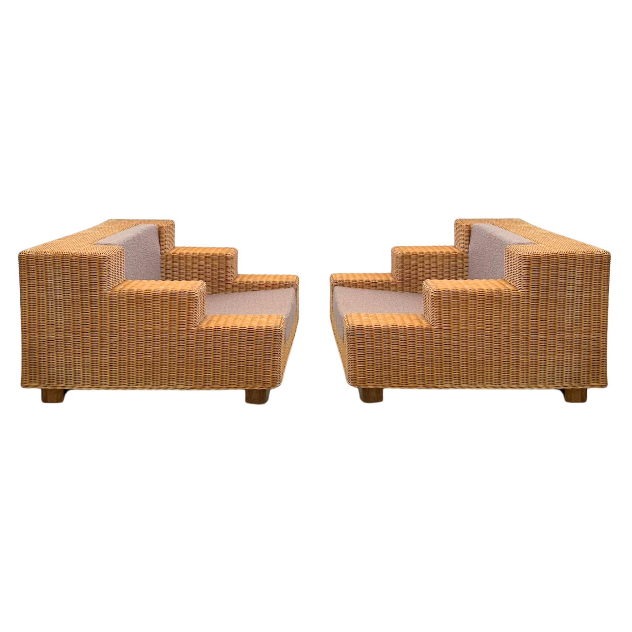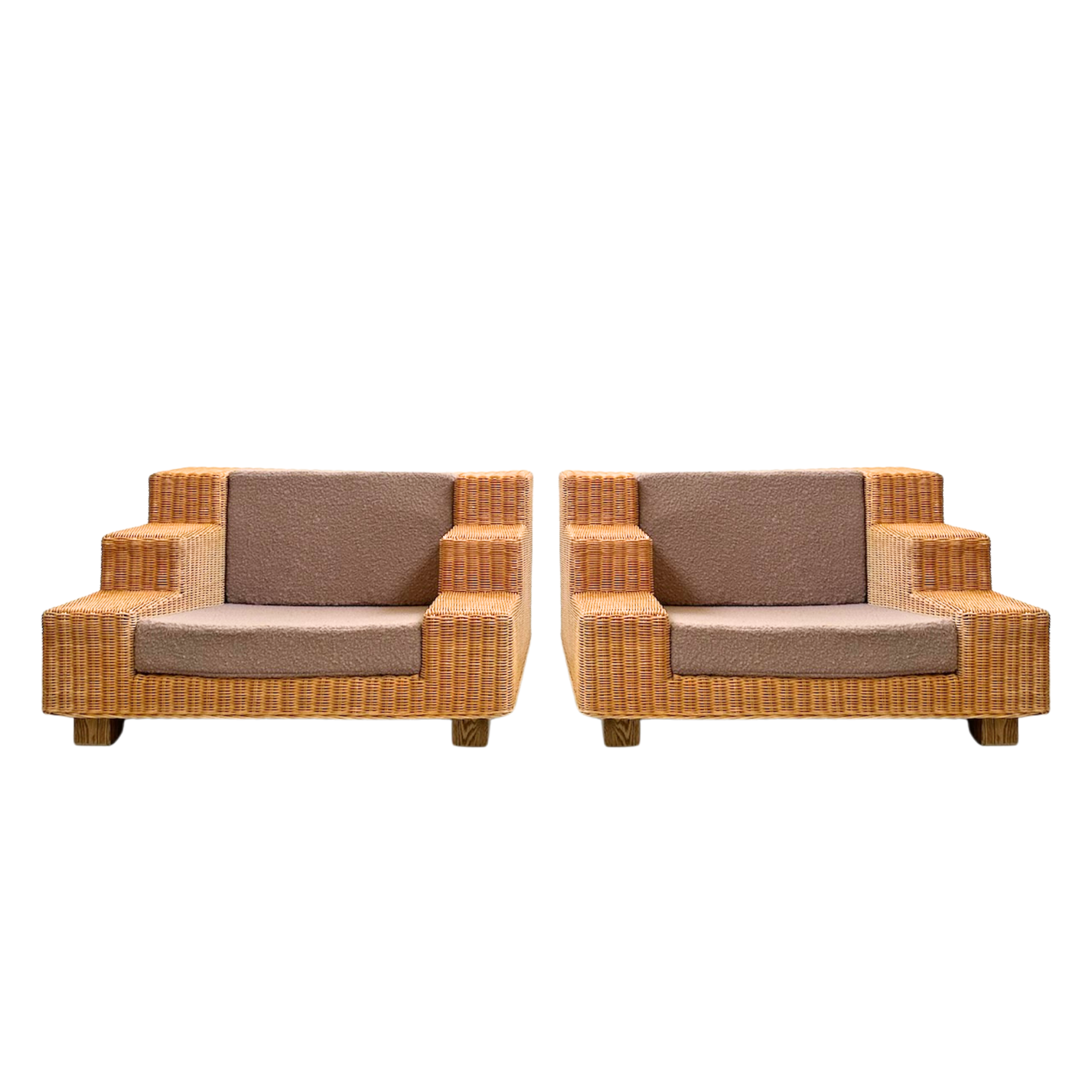 Oversized wicker lounge chairs with a tiered arm design and nubby wool cushions in warm taupe. The stepped frame gives a clean, geometric look.
