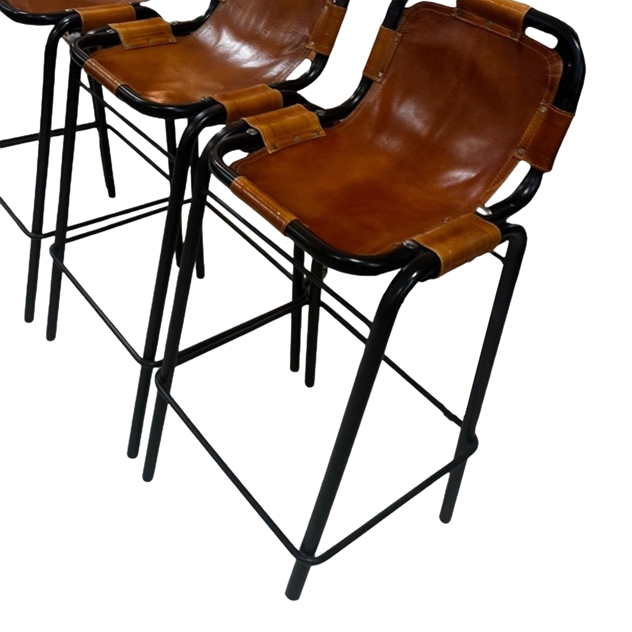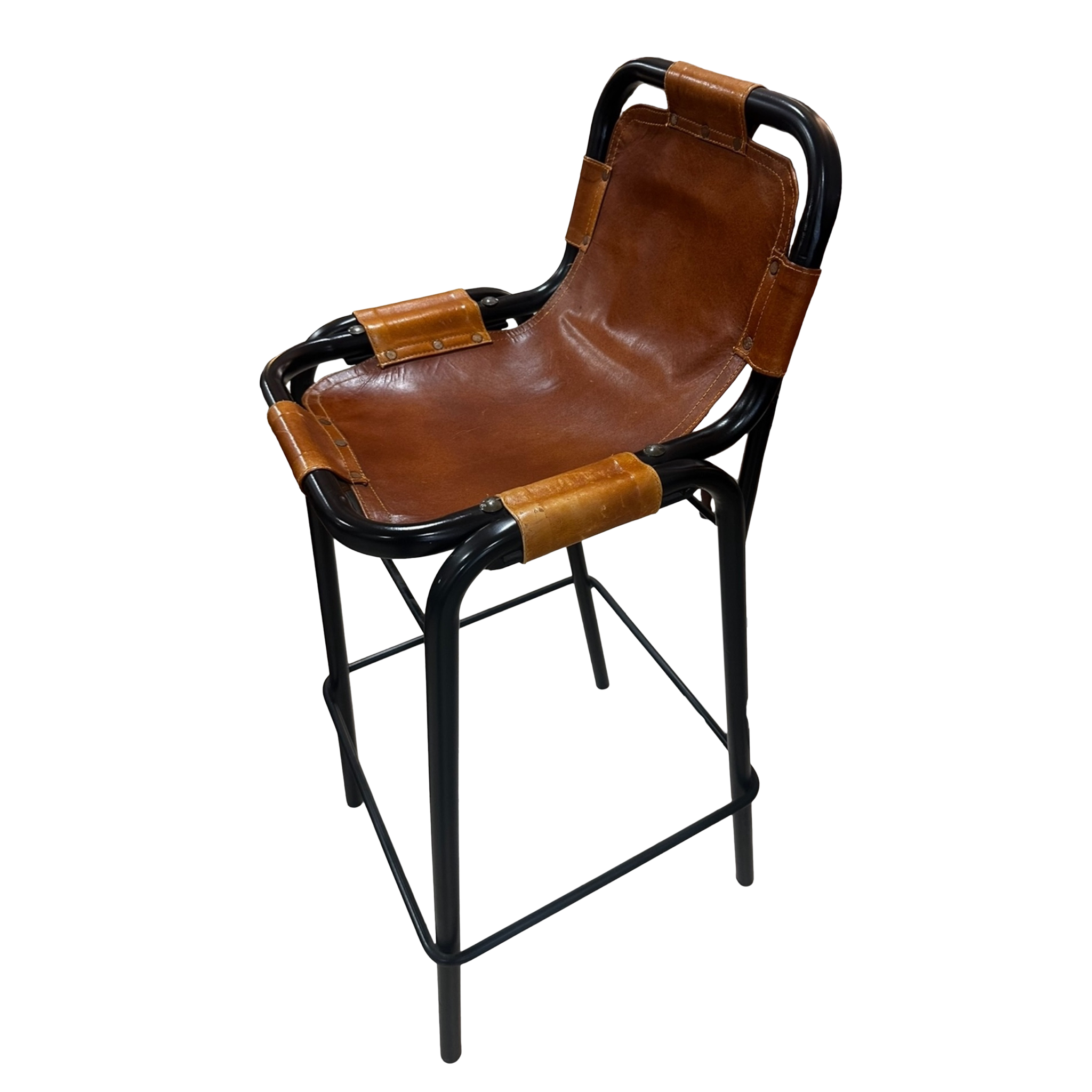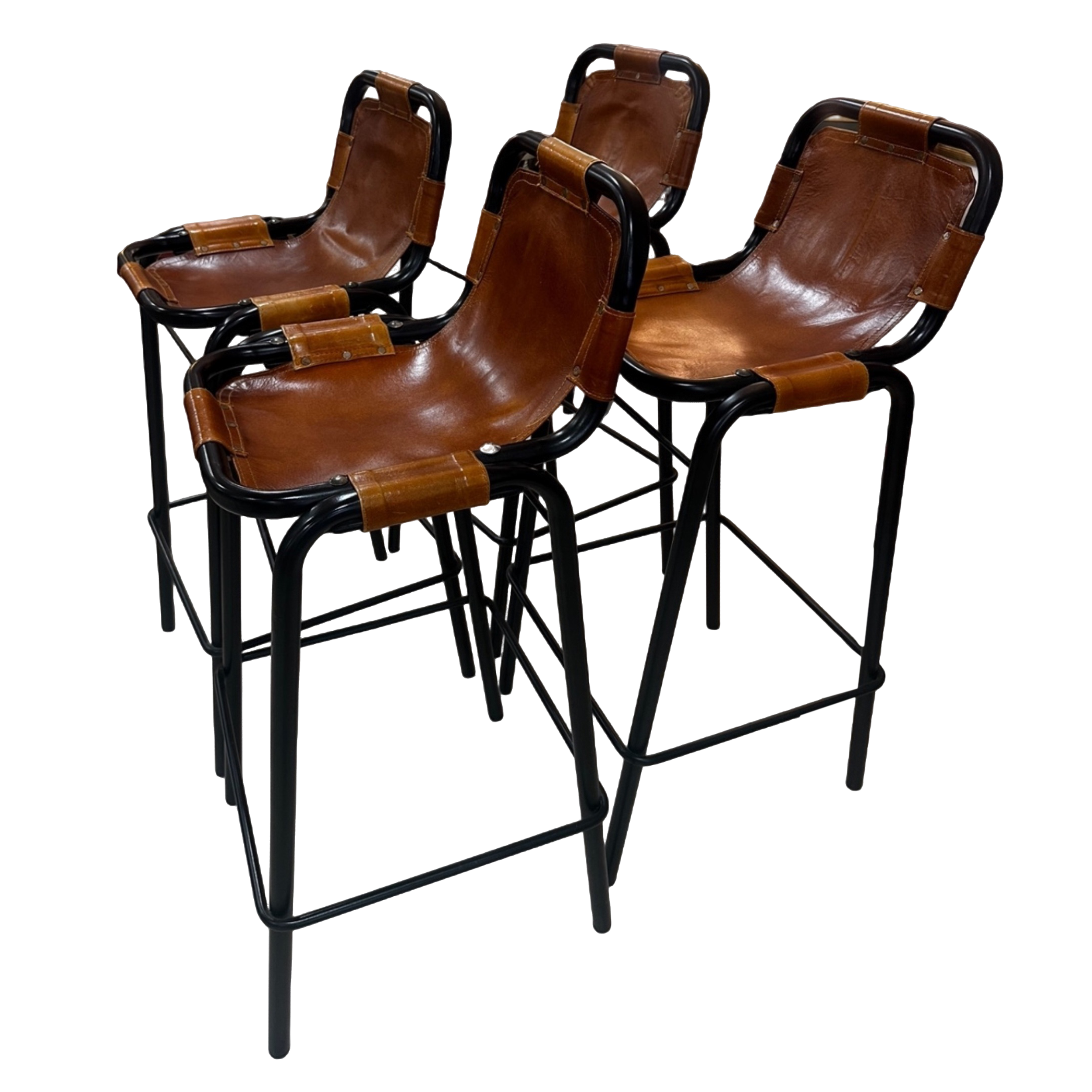 Set of four vintage barstools with black tubular frames and cognac leather sling seats. The leather is looped and hand stitched at each corner, forming a flexible seat that molds to the body. Sturdy, minimal, and built for wear.