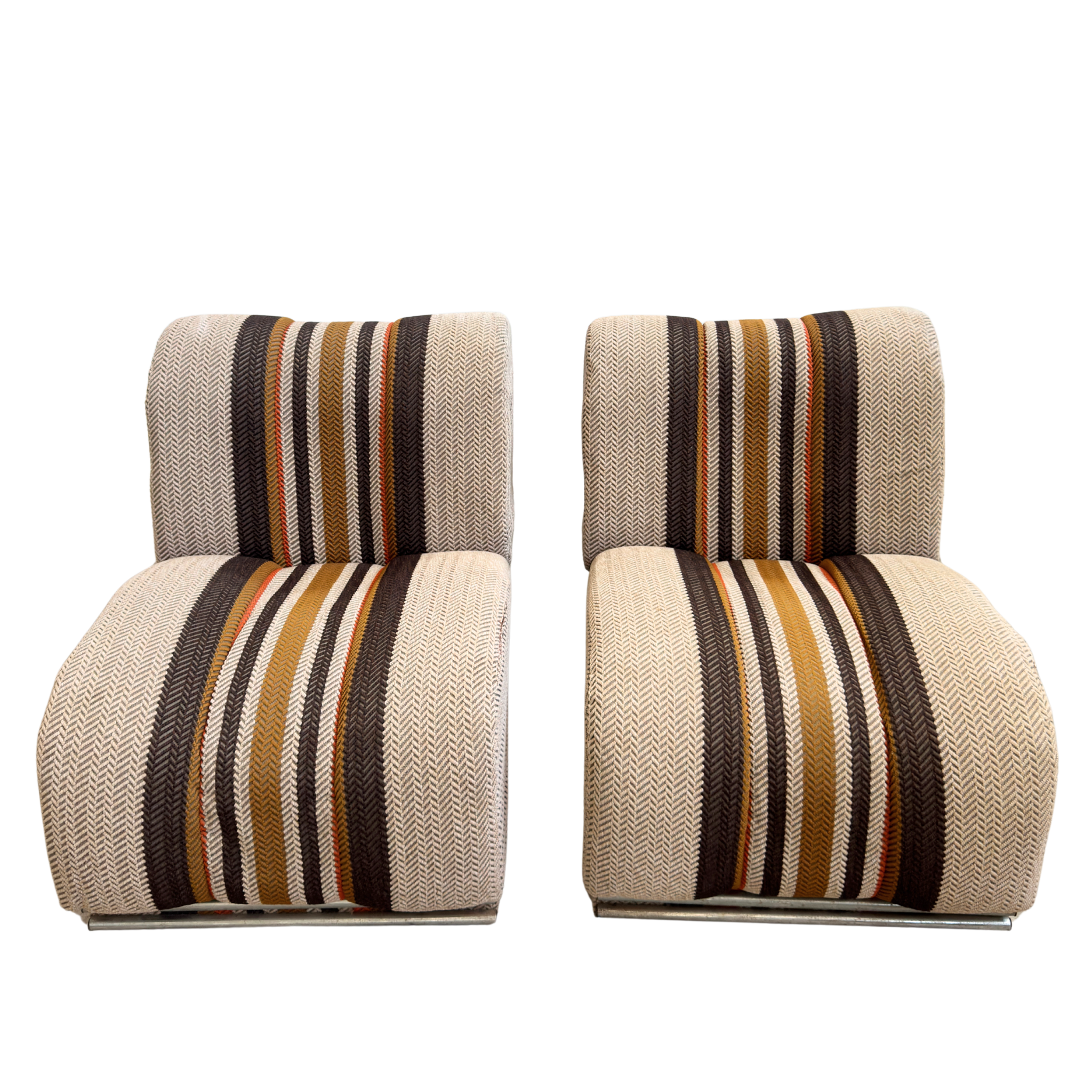 SALE- marked down from $1,800. One chair left. These stunning 70s modular chairs have sculpted forms and chrome sled bases. The original herringbone fabric is a stand out, featuring bold sunset toned stripes in ochre, rust, and brown. Both texture and color are remarkably well preserved.