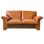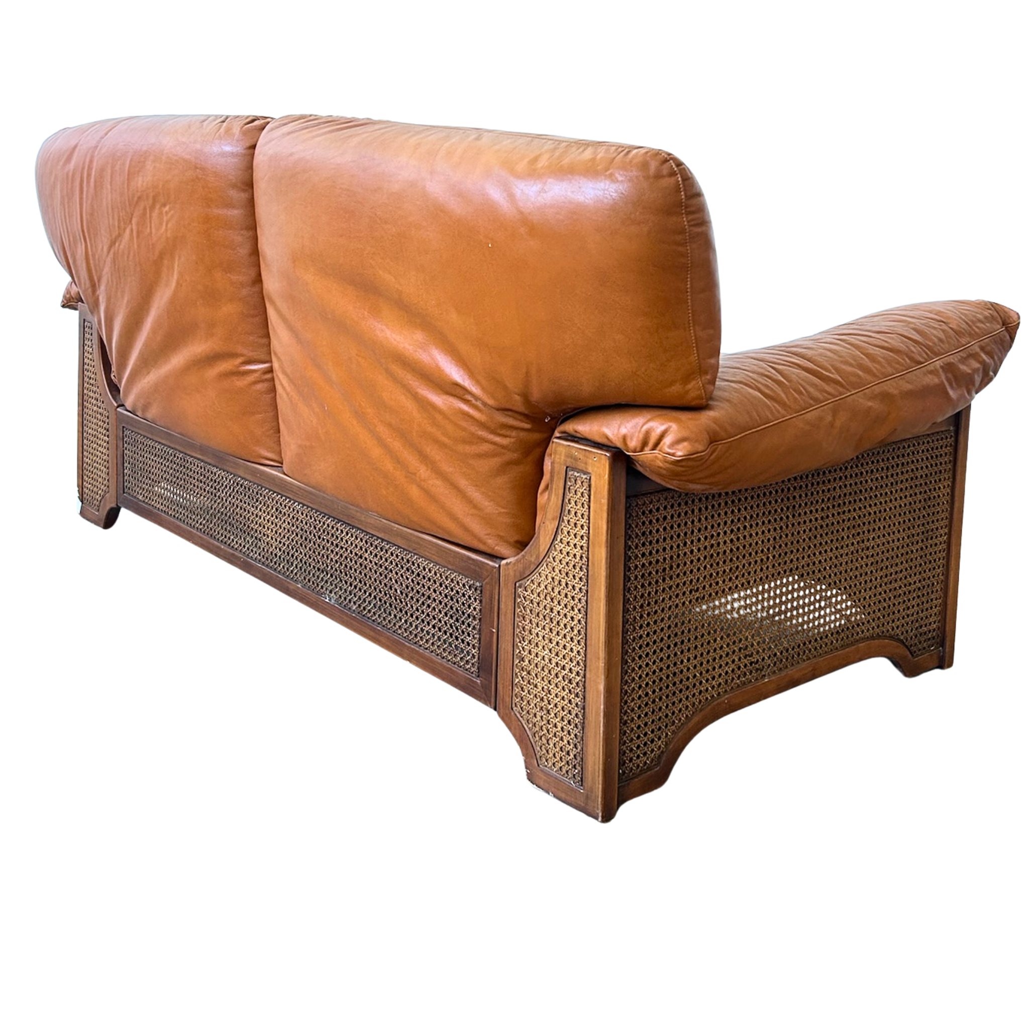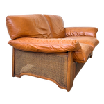 SALE- marked down from $4,200. A mix of softness and structure, this loveseat pairs overstuffed toffee leather cushions with a carved wood frame inset with woven cane.