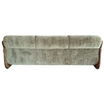 Matching pair of Lounge Chairs available, sold separately. Vintage Spanish sofa with a solid oak frame and plush, rounded cushions. Newly reupholstered in textured sage green fabric with subtle tufting. The exposed wood structure adds weight and warmth.
