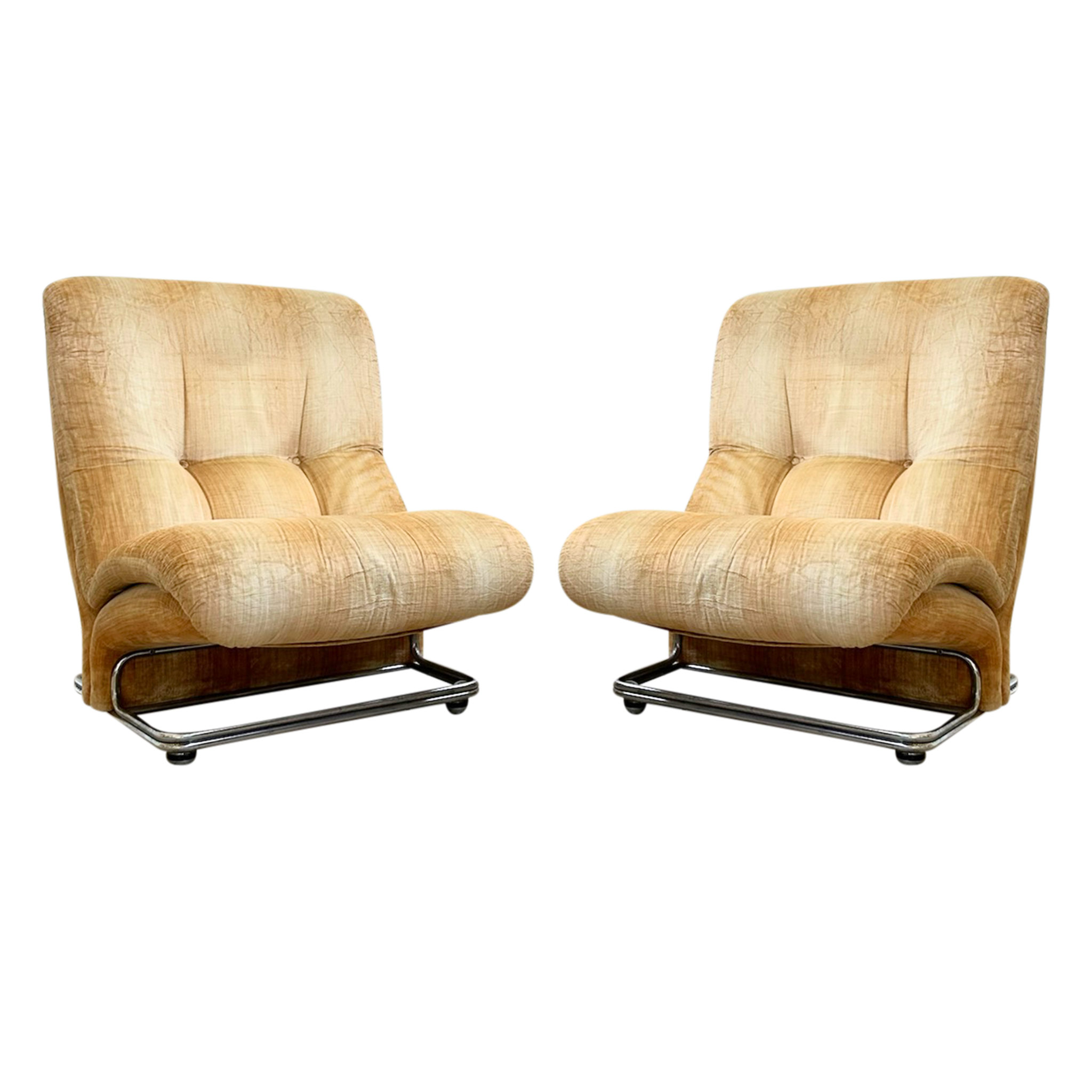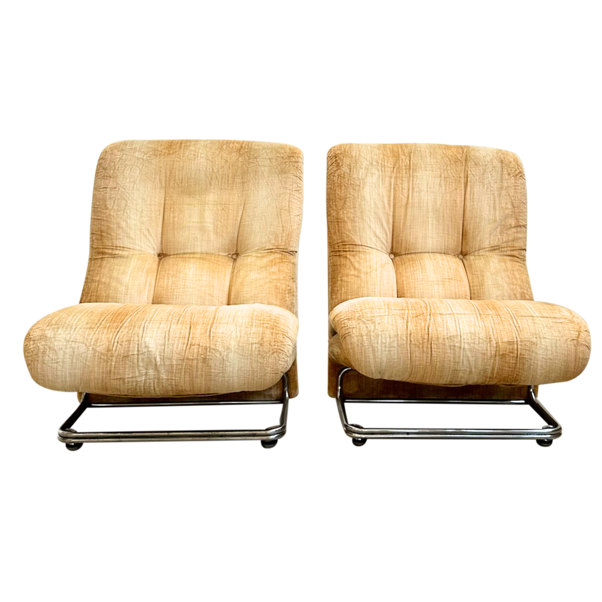 Pair of Honey Velvet Chrome Cantilever Lounge Chairs, 1970s