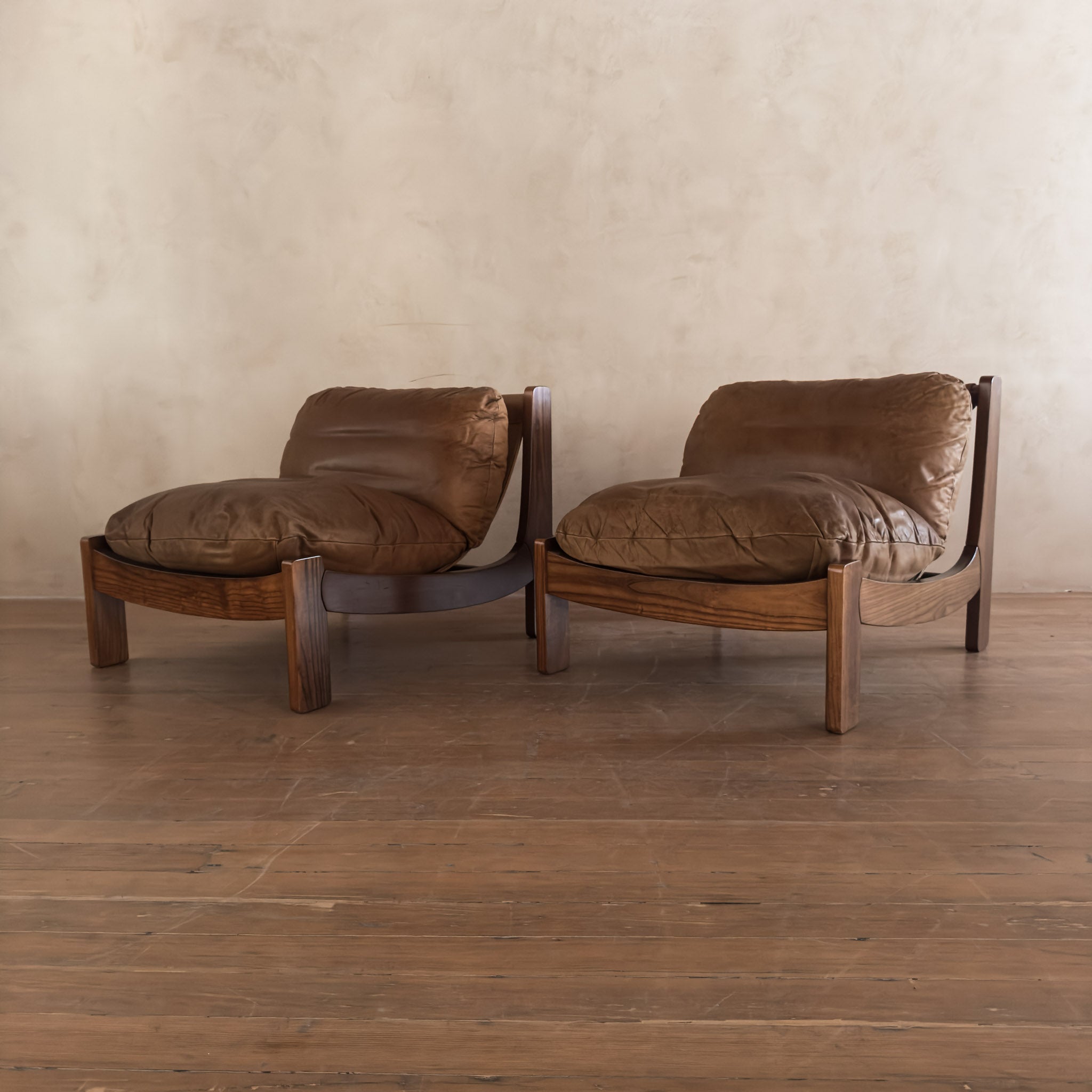 Pair of Wood Frame Toffee Leather Lounge Chairs, 1970s