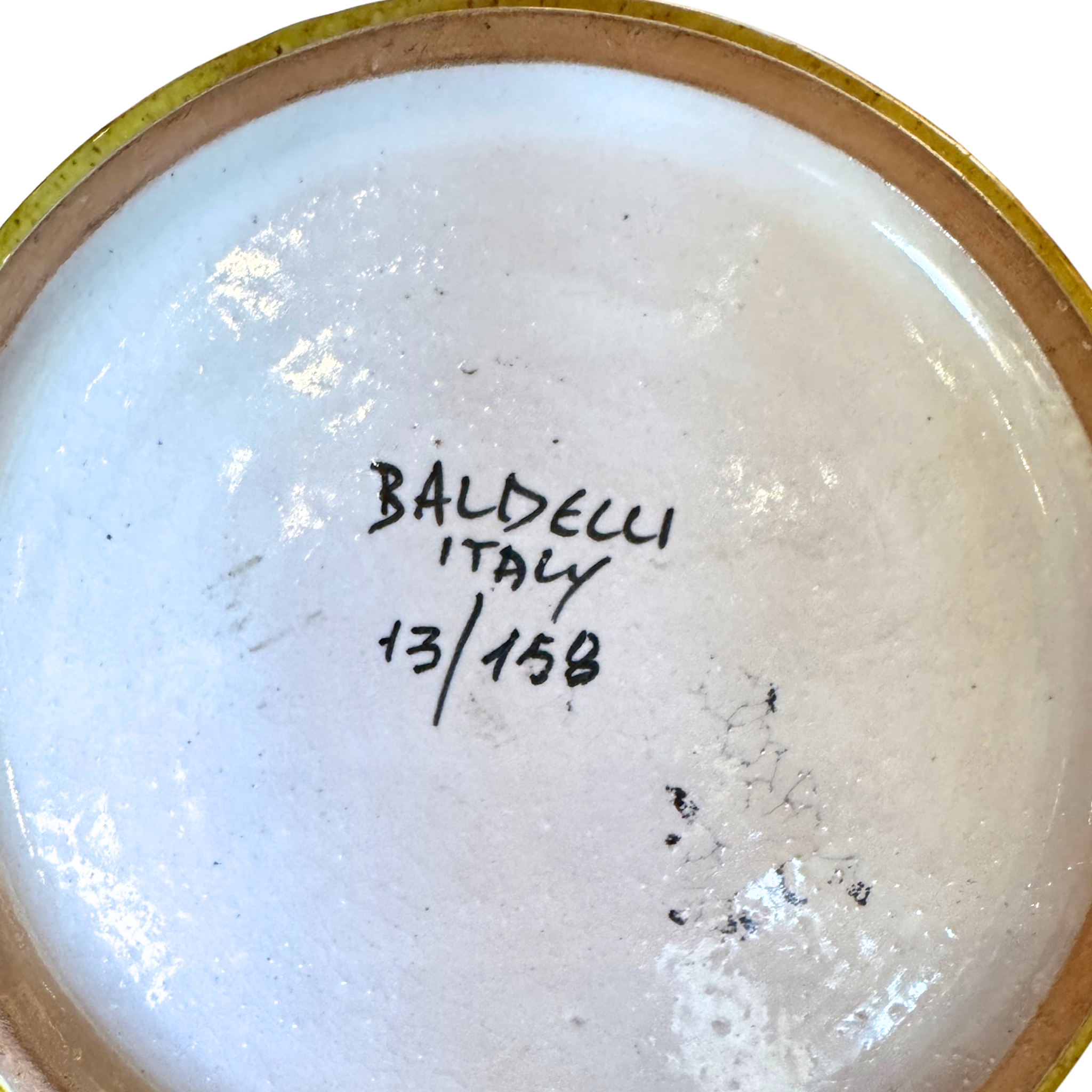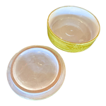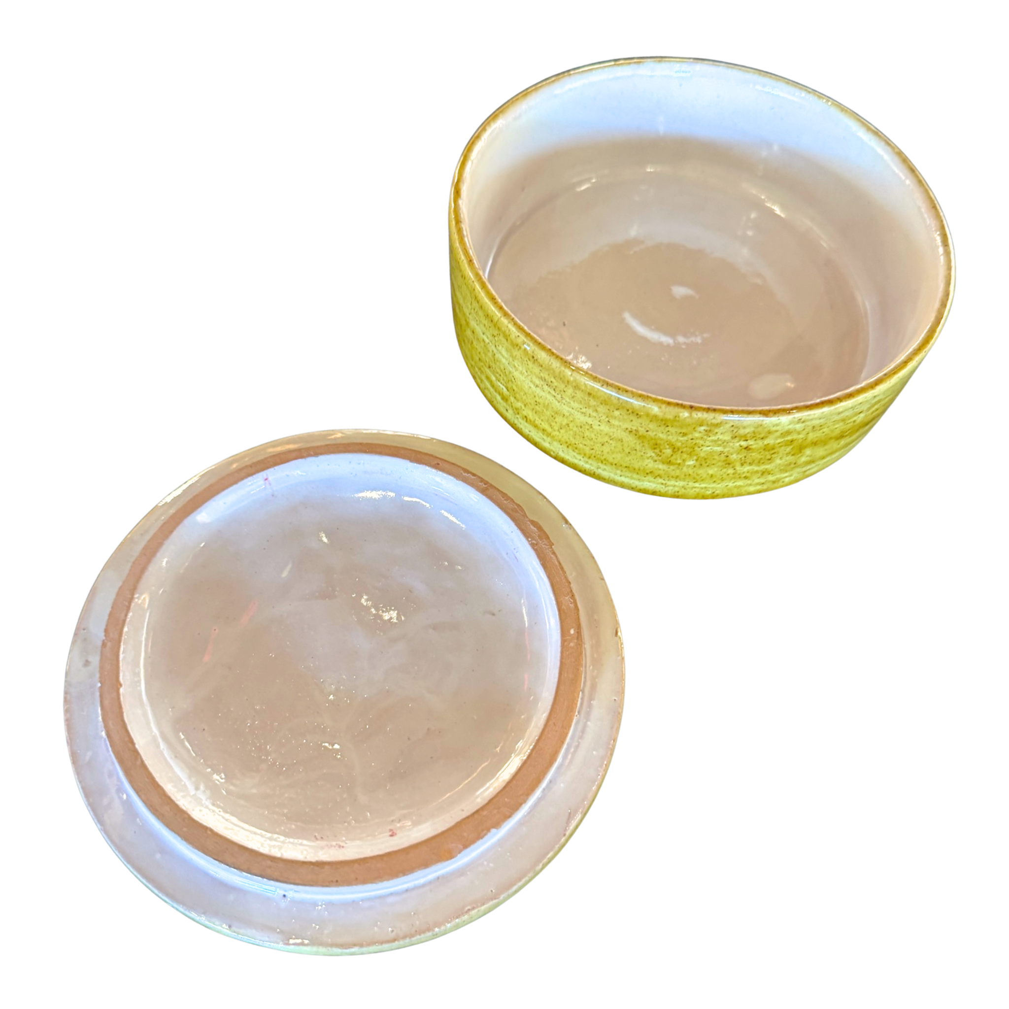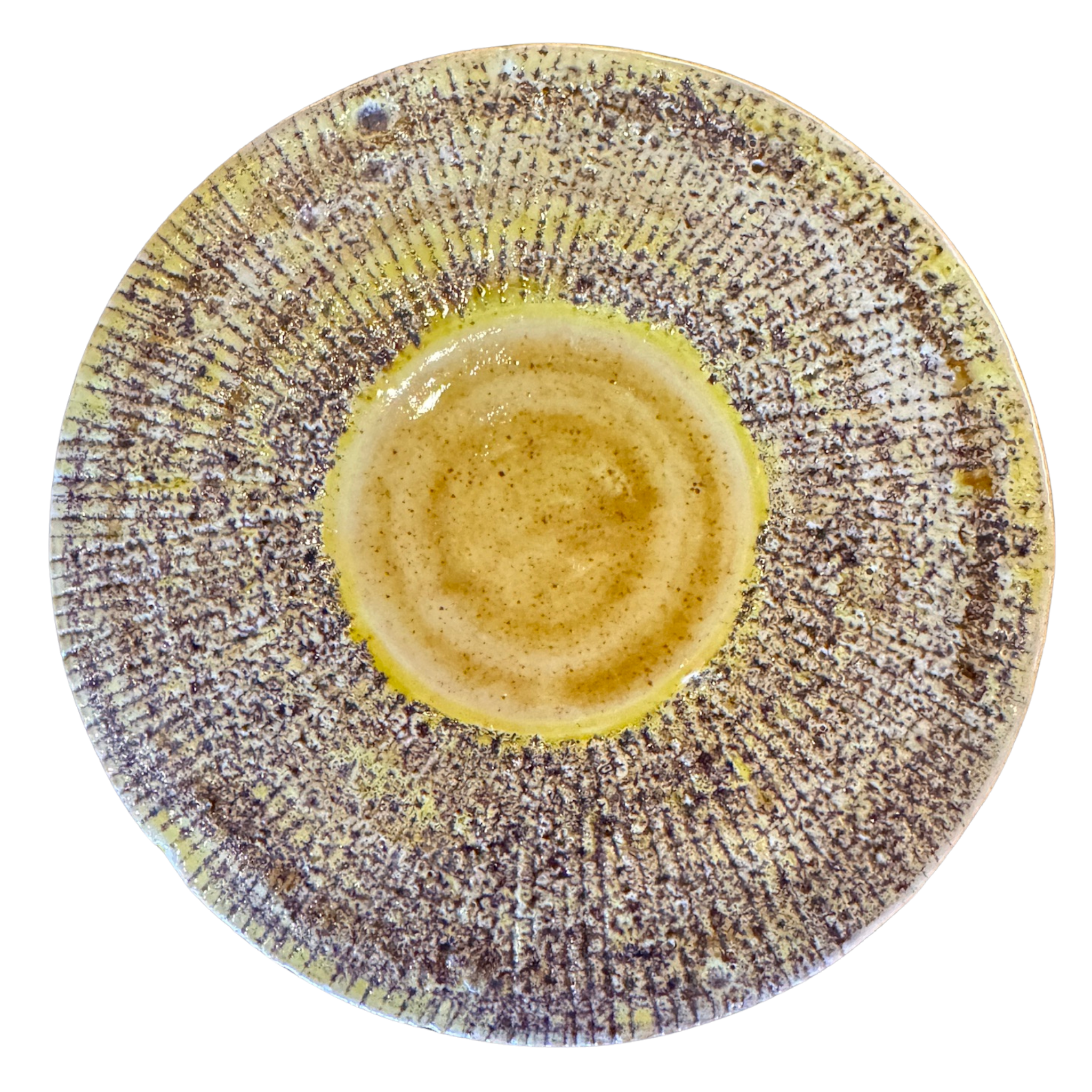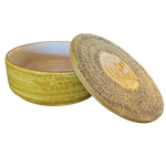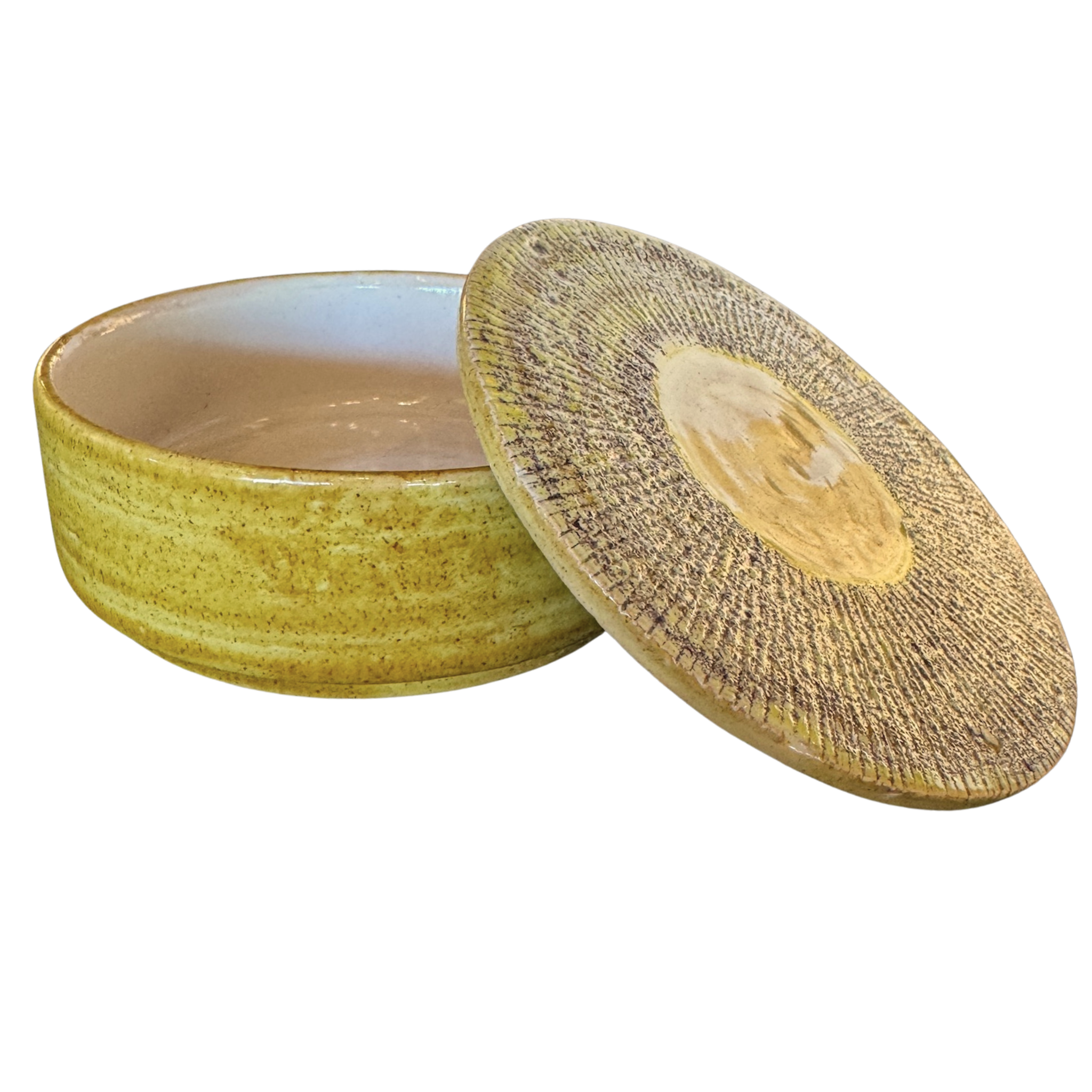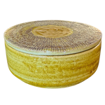 Hand thrown stoneware jar with domed lid, finished in a golden ochre glaze accented by speckled and radiating brown detailing.