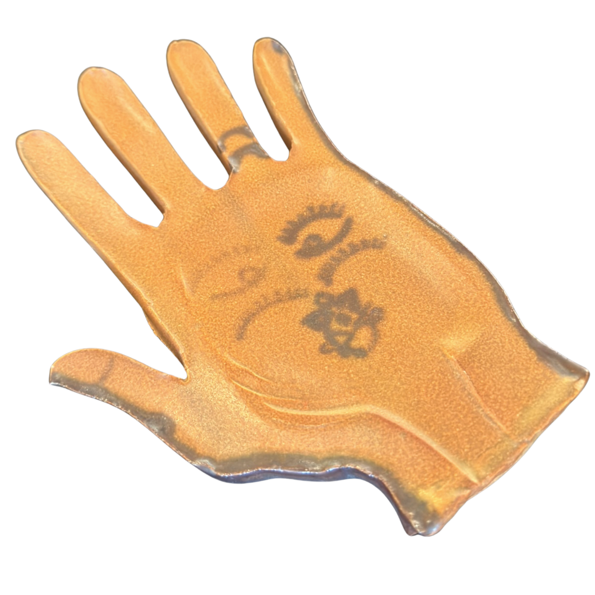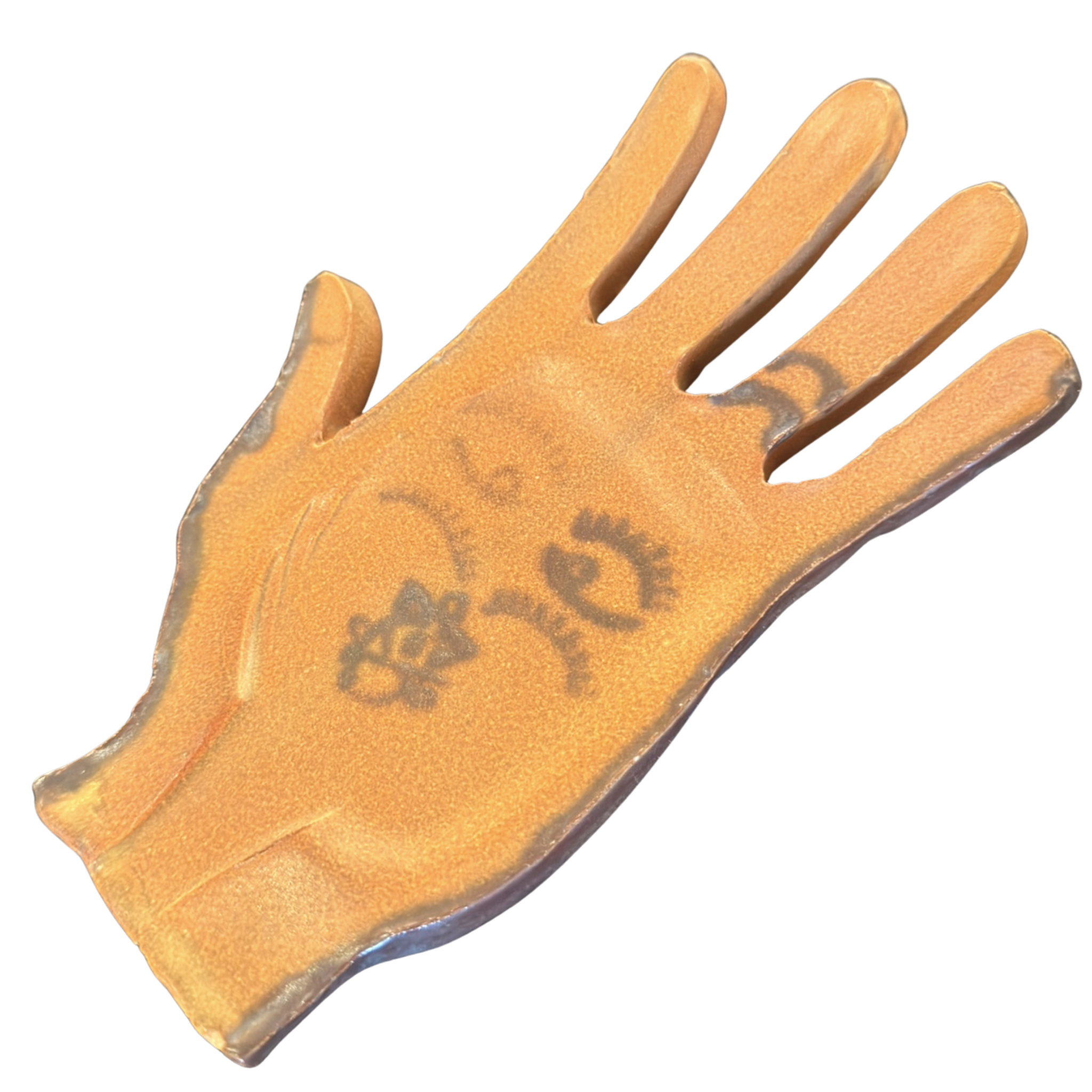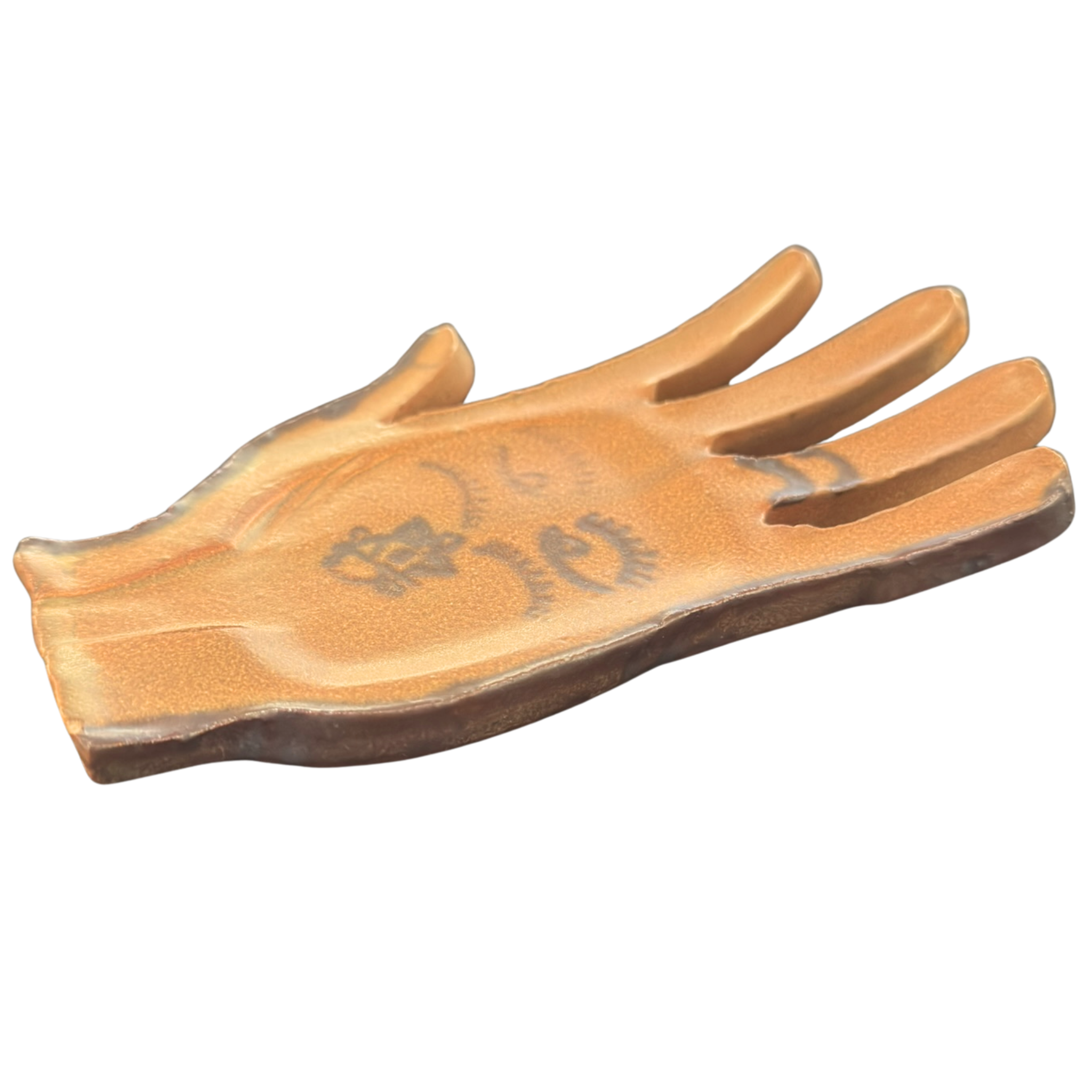 Flat ceramic catchall shaped like an open hand, finished in a warm brown glaze with darker edges. Simple black linework features two eyes, a ring, and a small flower motif on the palm.