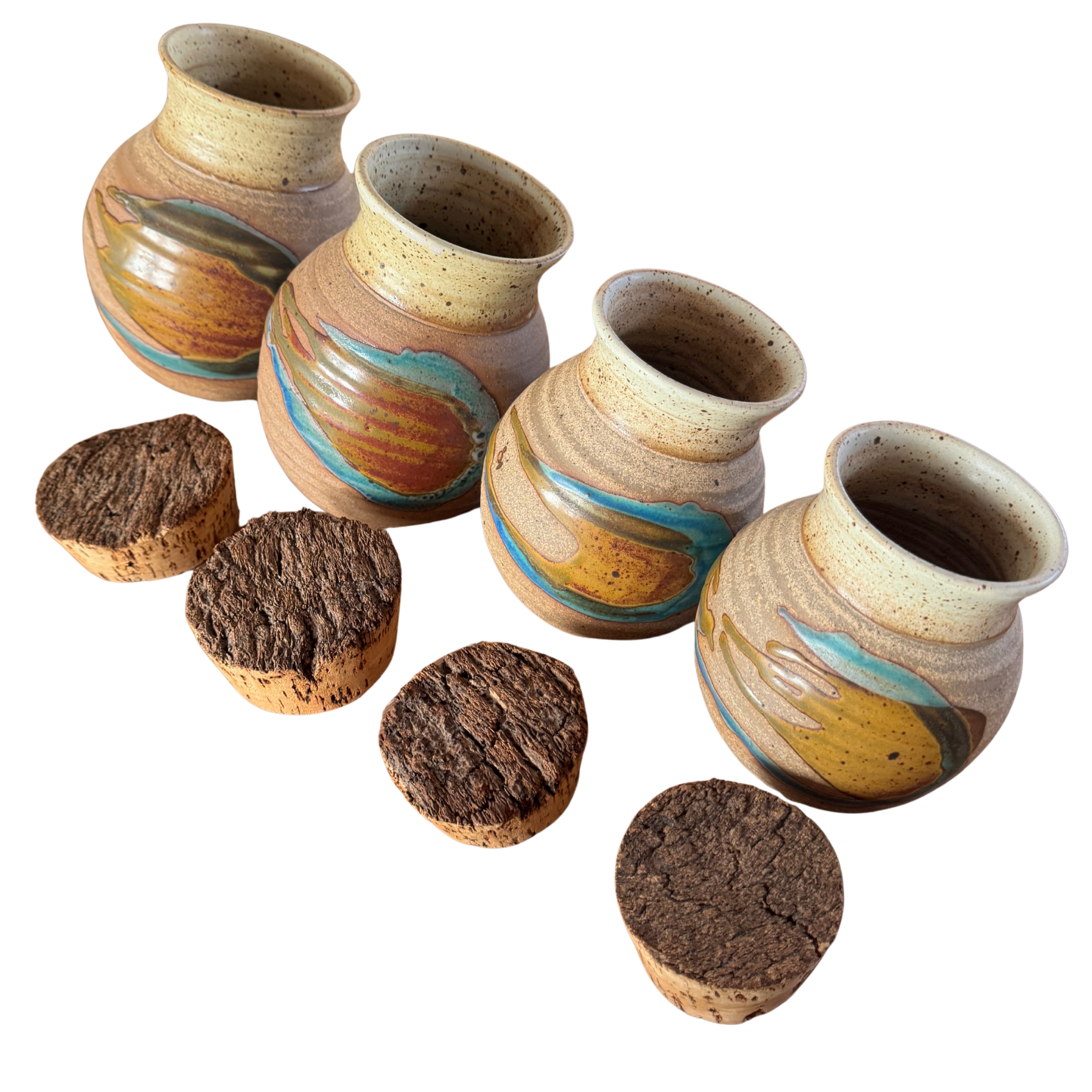Set of Four Cork Lidded Studio Pottery Canisters