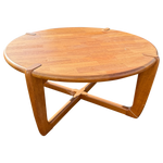 This piece is available for presale. Estimated arrival is mid to late January. A round teak coffee table with a block patterned top and sculpted legs that meet the edge of the apron. The joinery tabs at the rim are a clear seventies Scandinavian detail, practical and decorative at once.