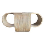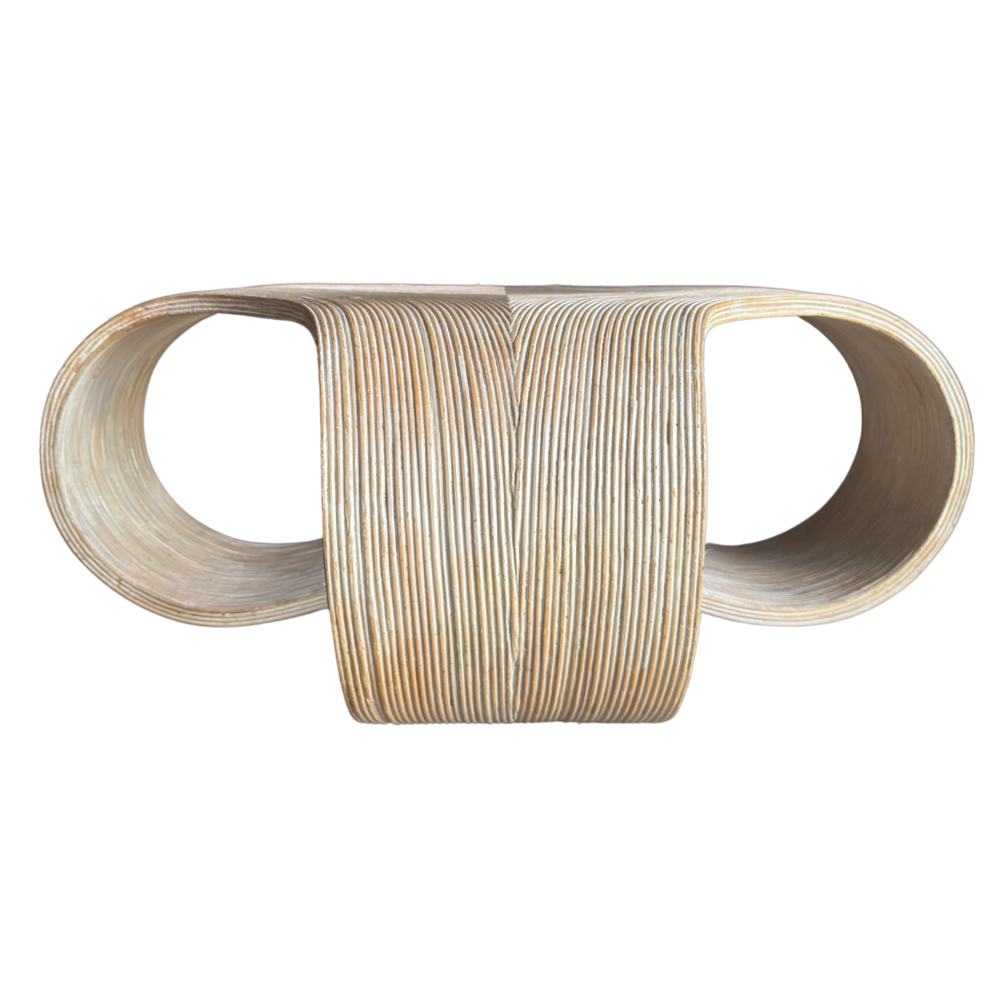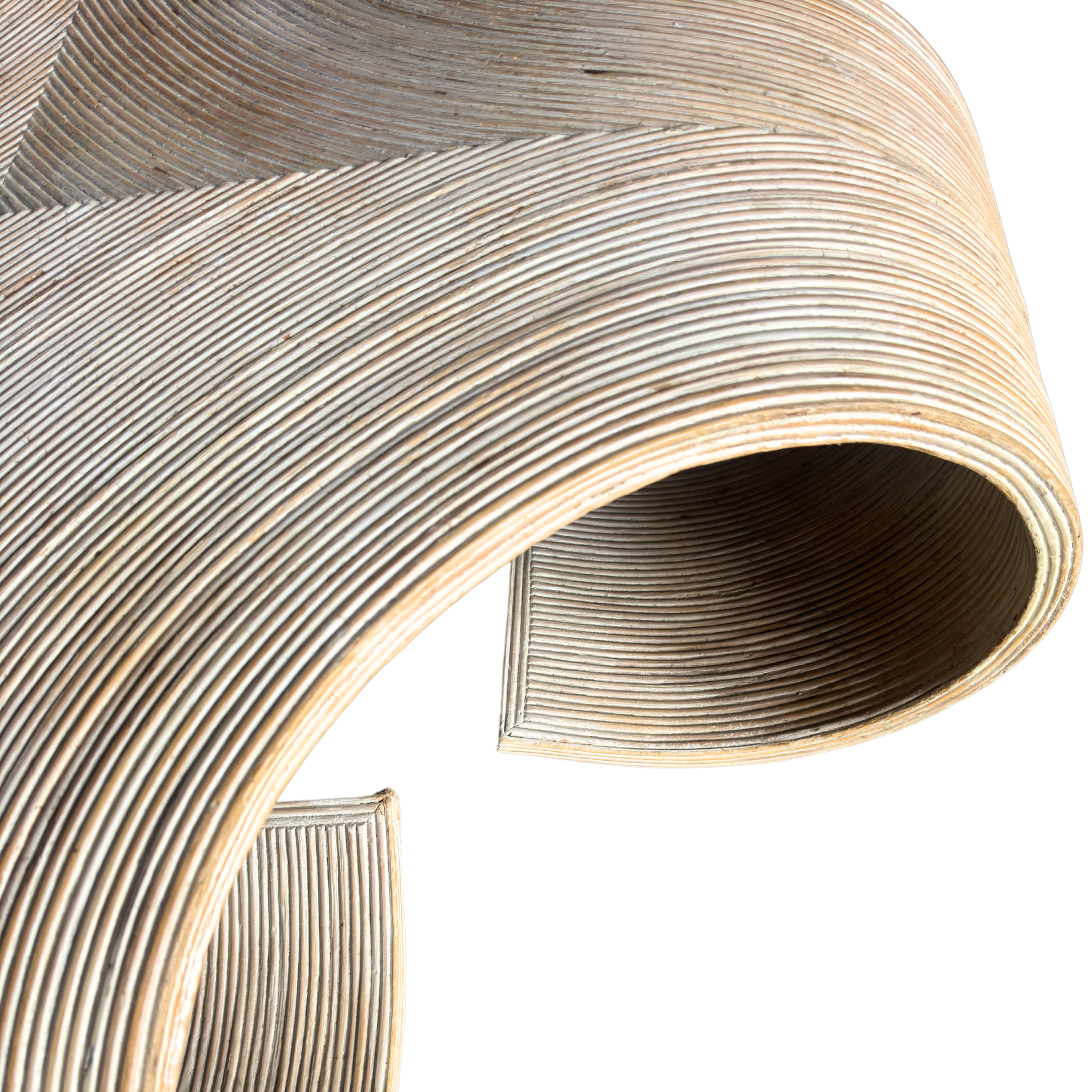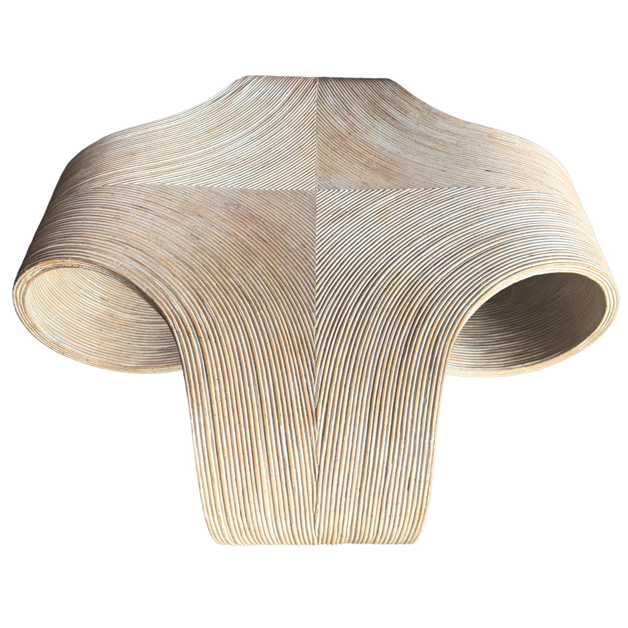 A sculptural 1970s Italian coffee table made from tightly wrapped pencil bamboo. The form curves into wide scrolled legs with an open base. Pale natural finish with subtle tonal variation throughout.