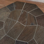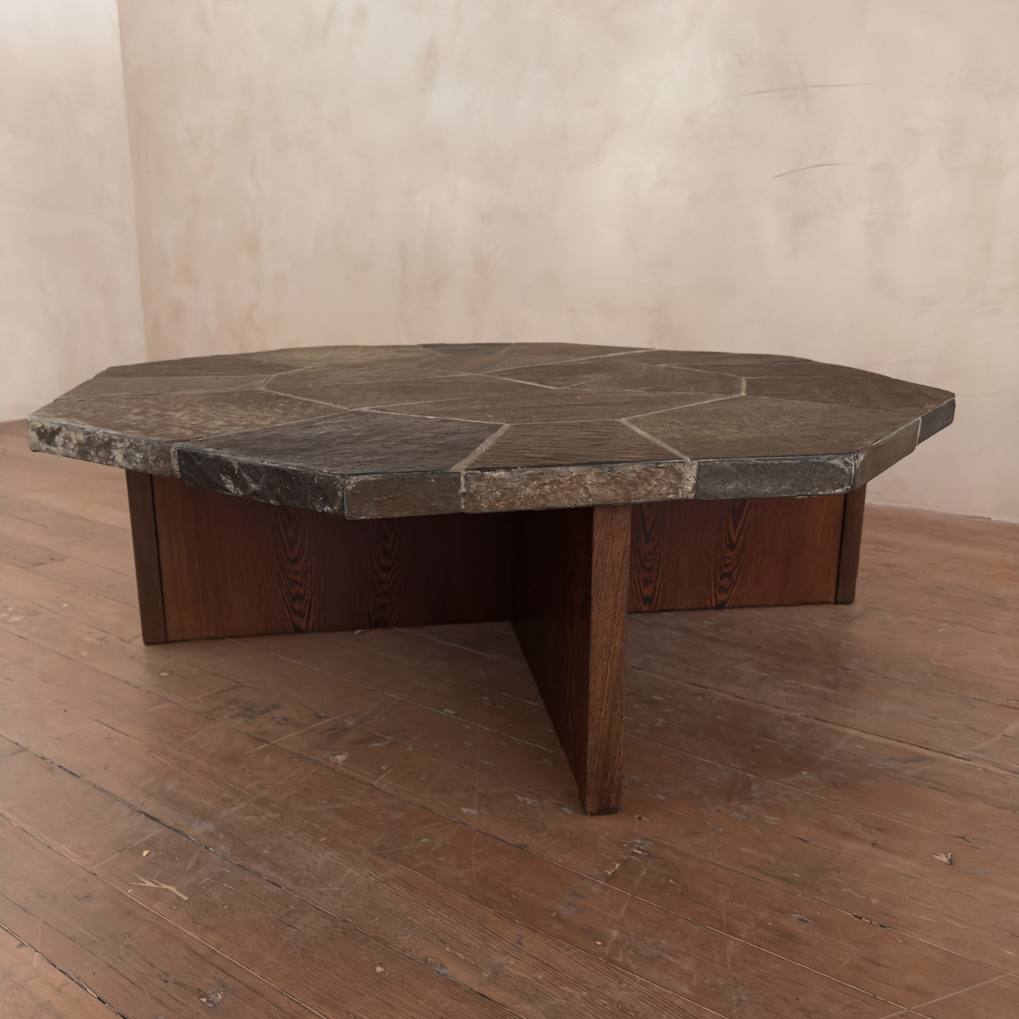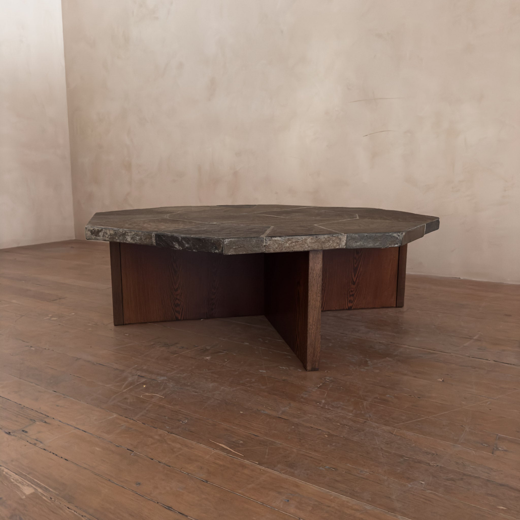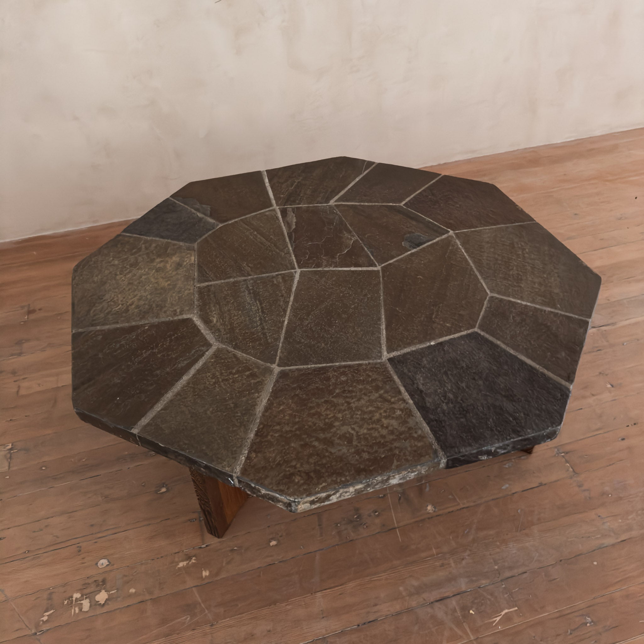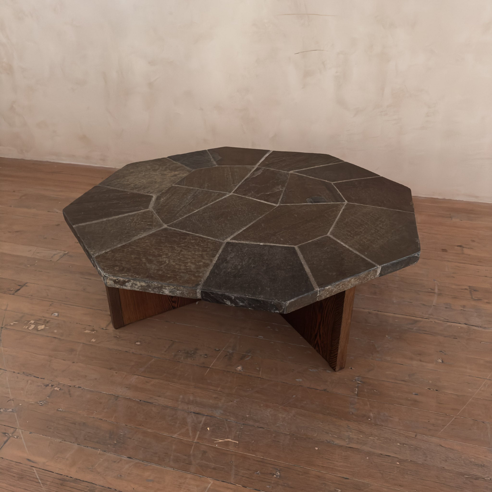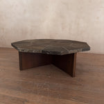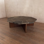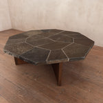 Octagonal coffee table with a weighty stone tile top set in a radial pattern. The surface shows natural mineral variation in muted browns and greys.
