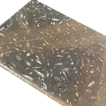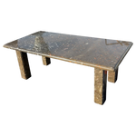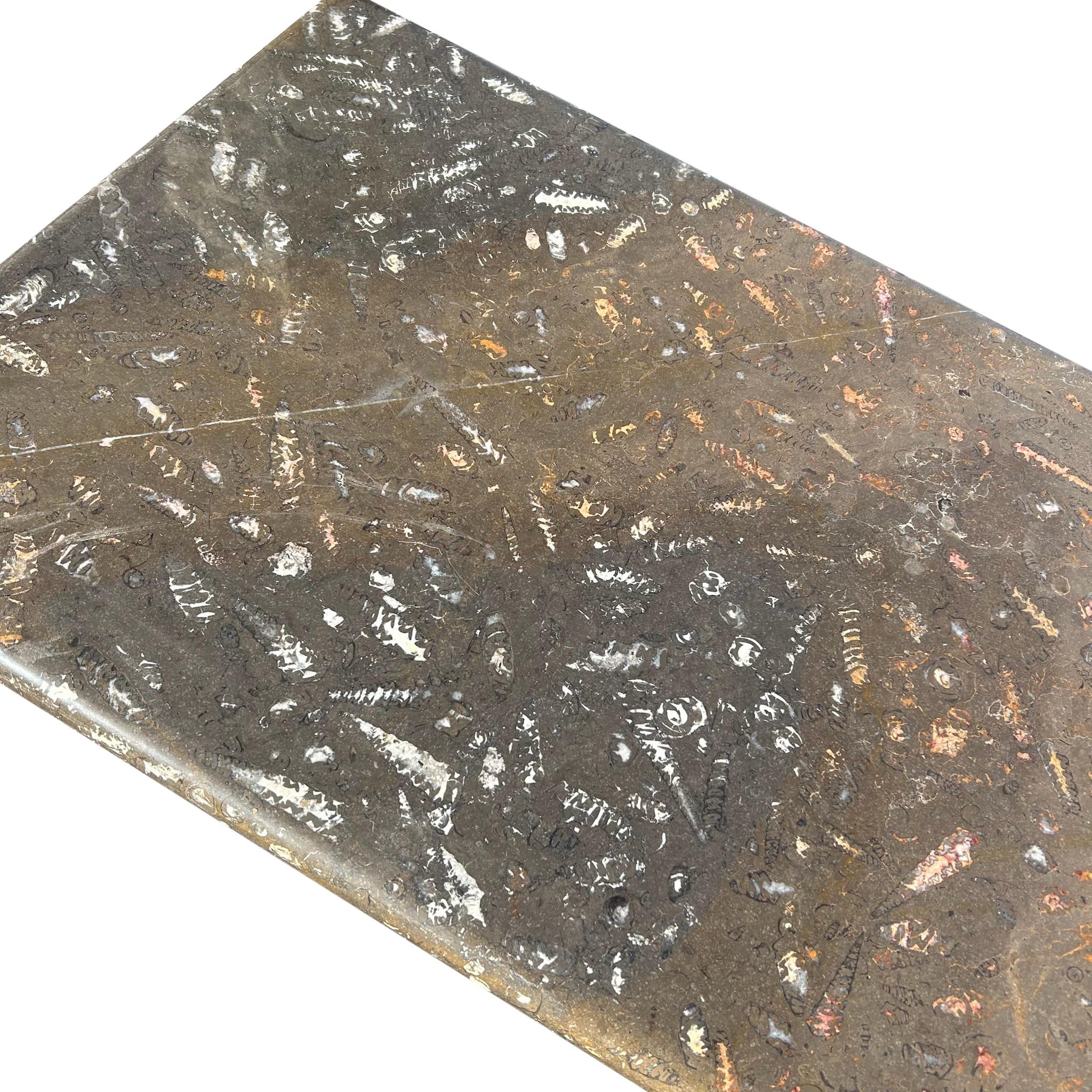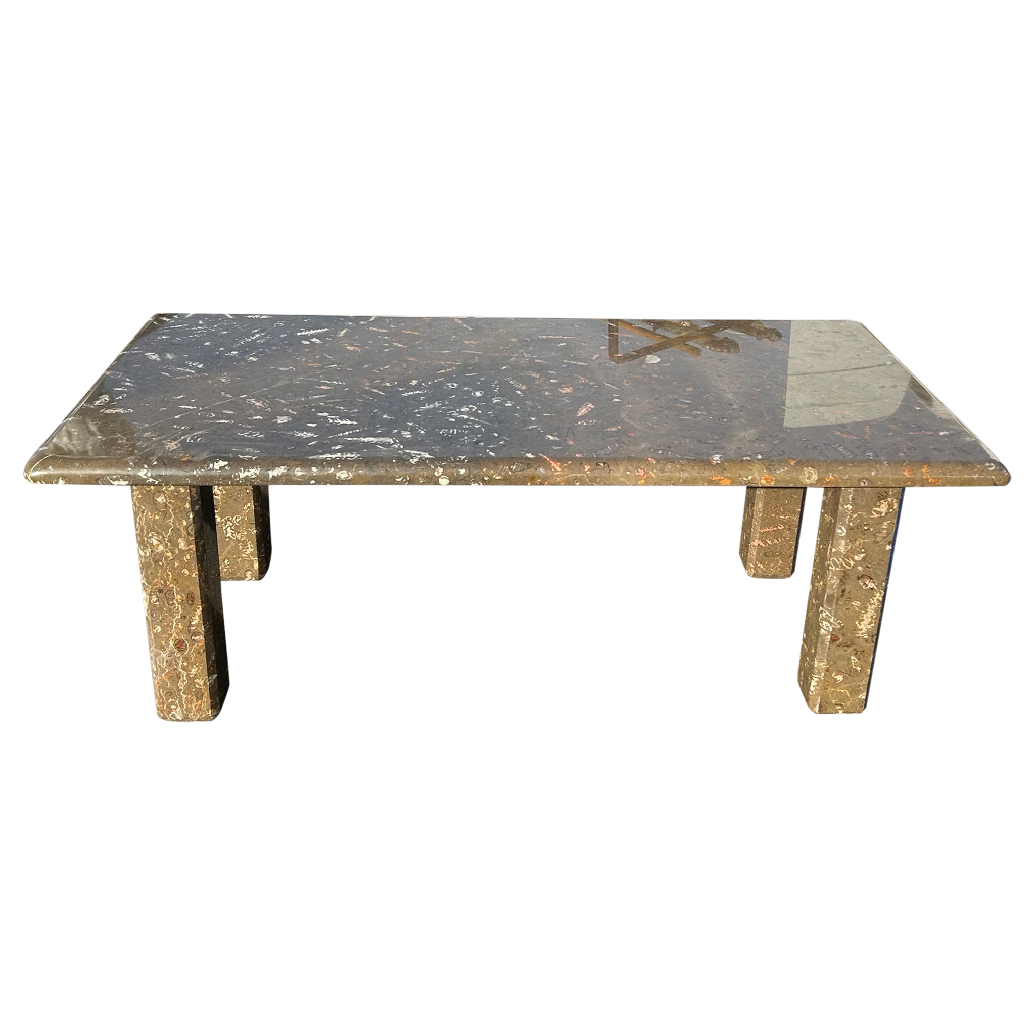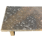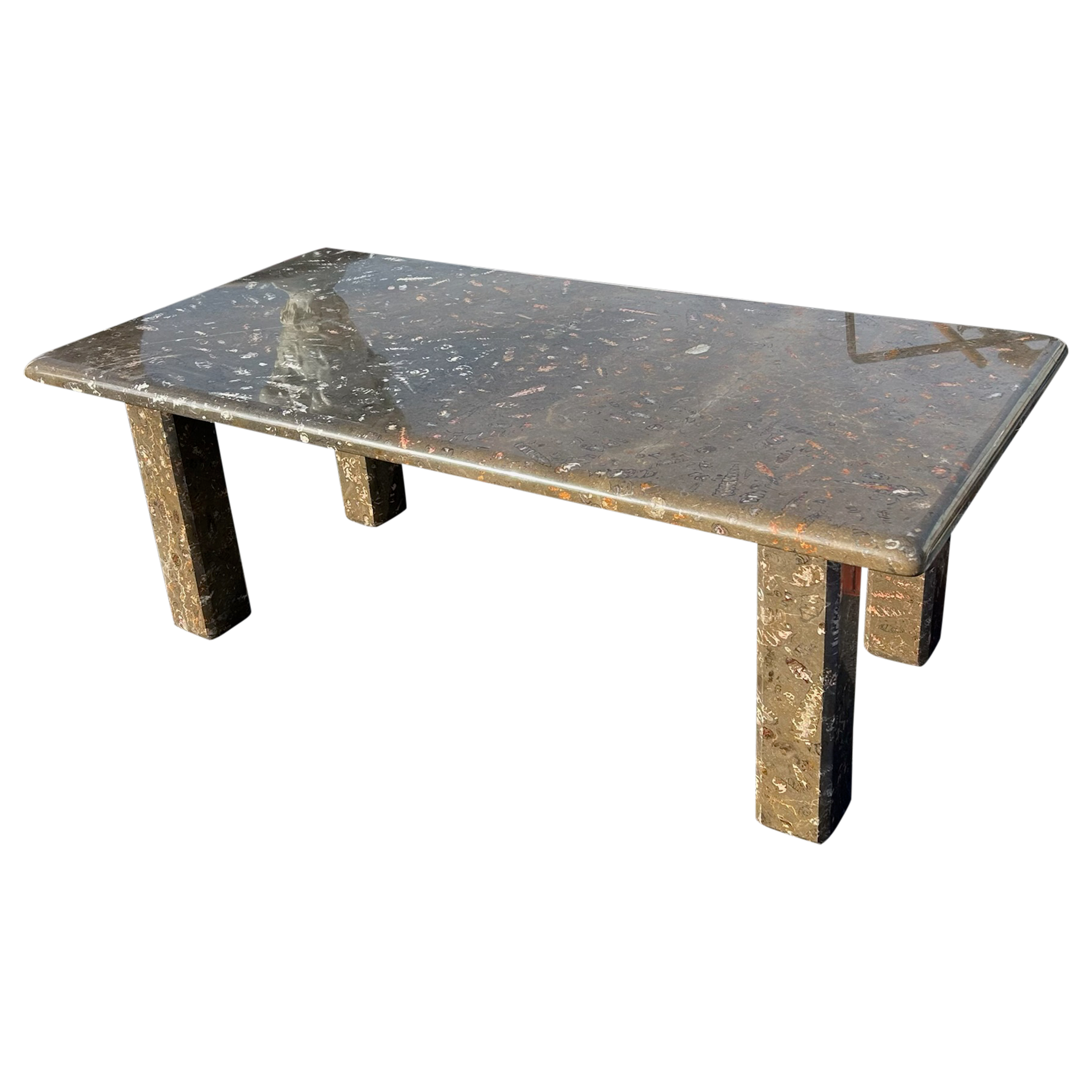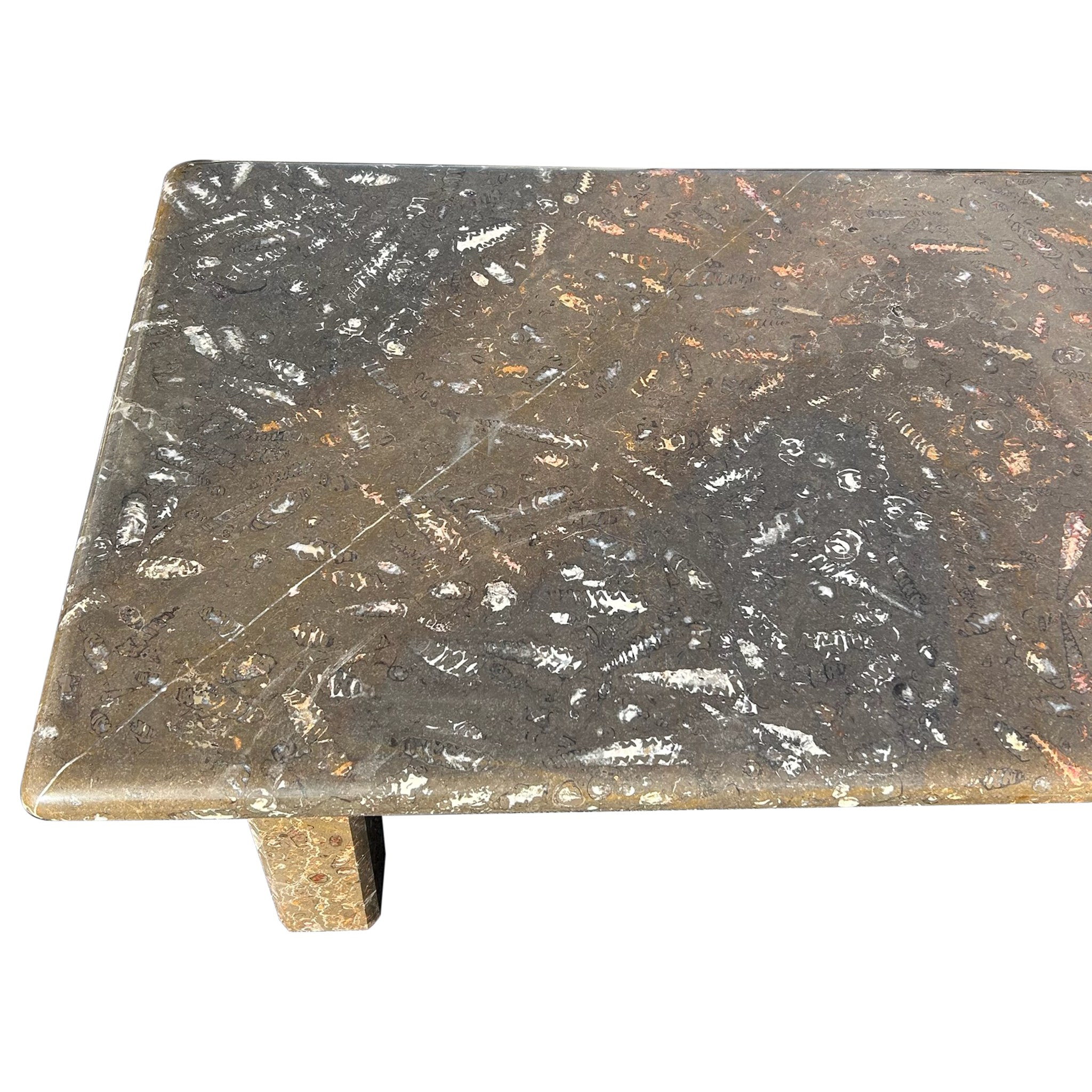 This piece is available for presale. Estimated arrival is mid to late January. Rectangular coffee table made from fossil limestone with scattered shell fragments throughout the surface. The stone has a muted grey tone with lighter fossil markings that break up the field. Block legs in the same material keep it simple and weighty.