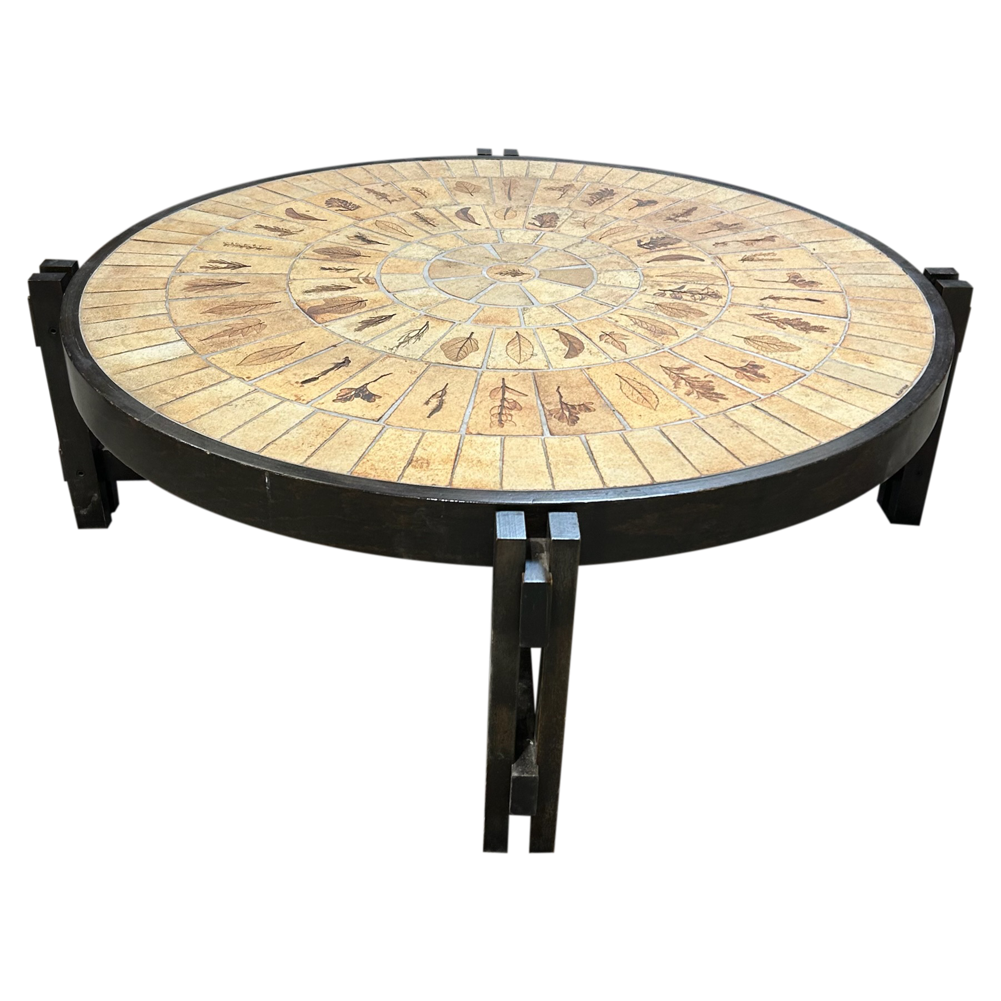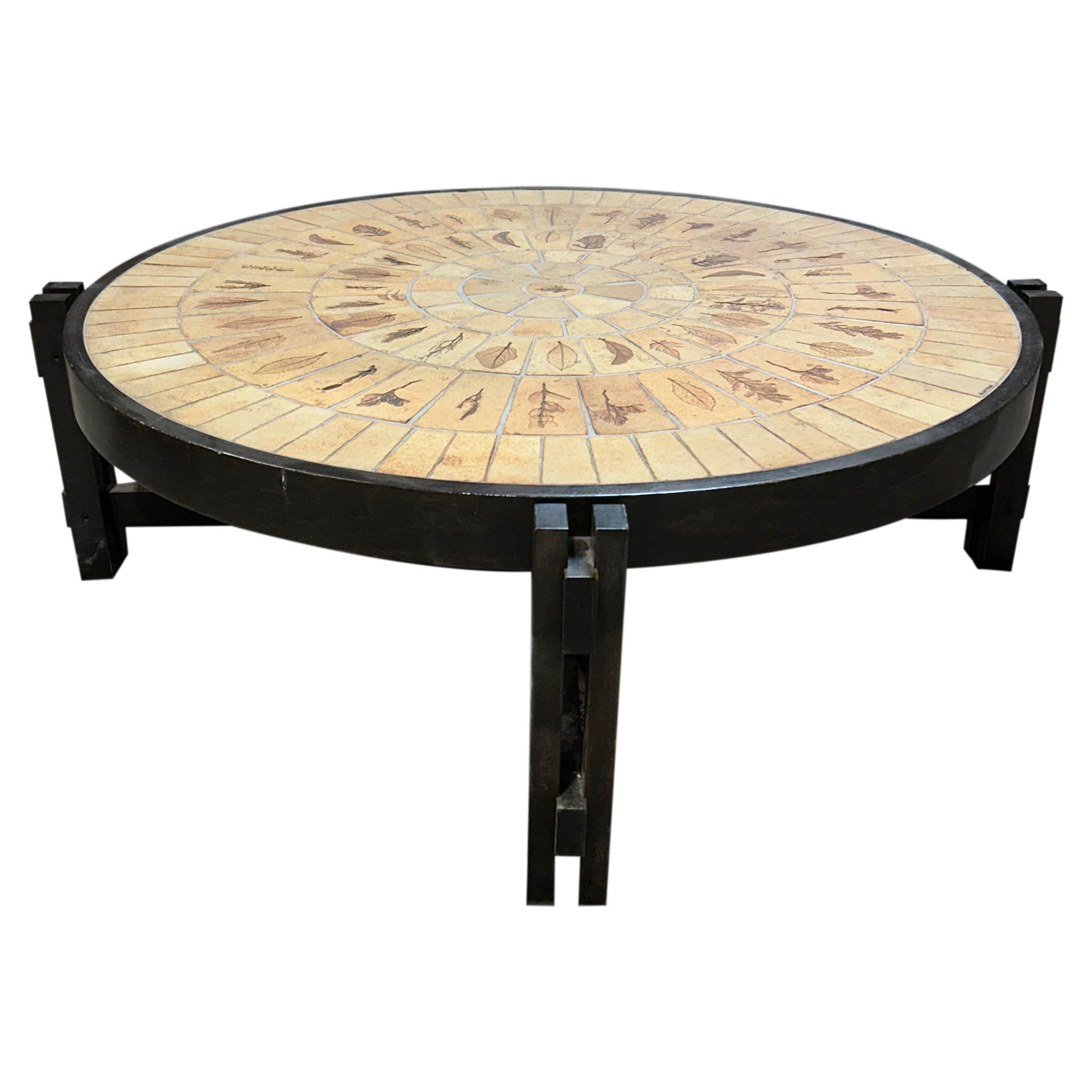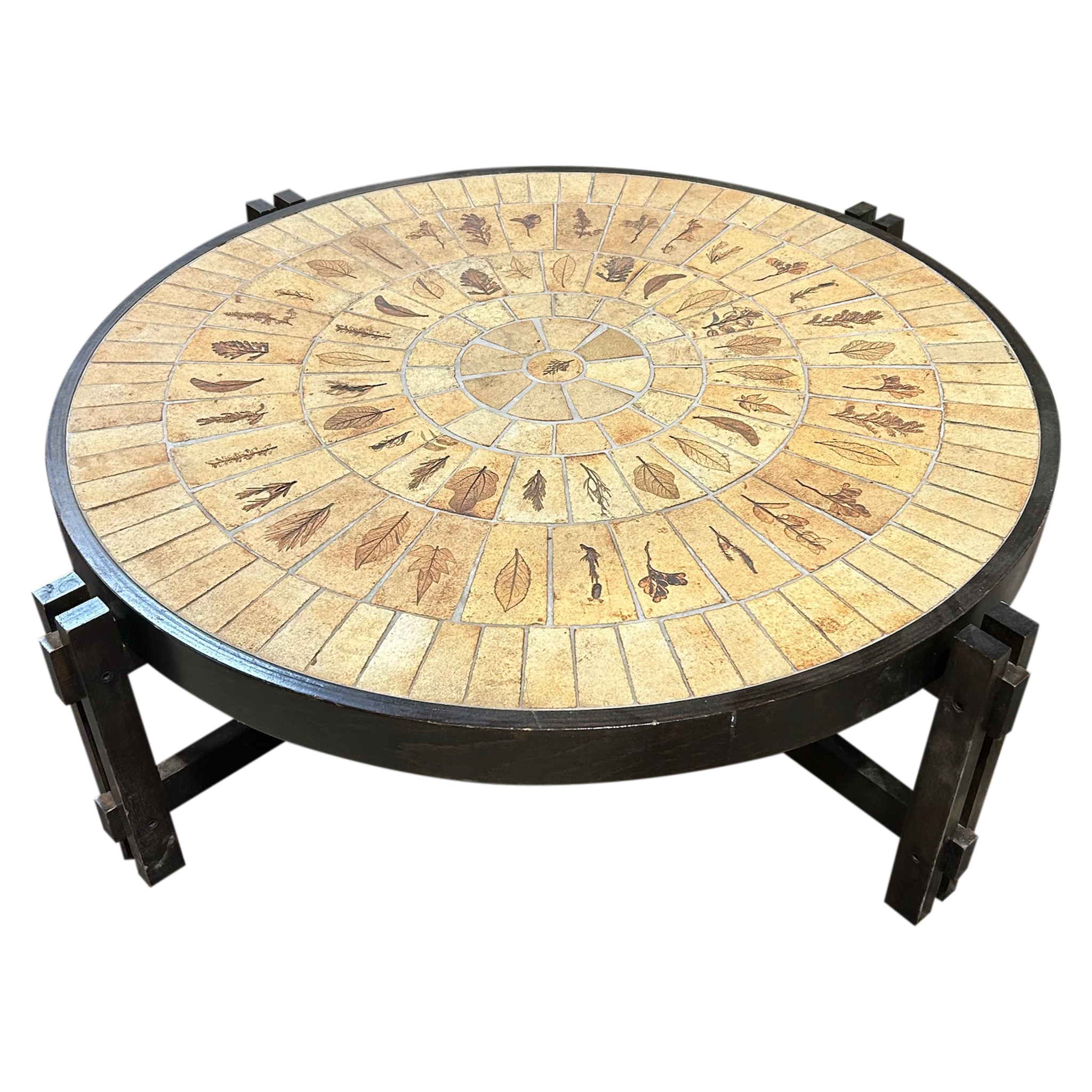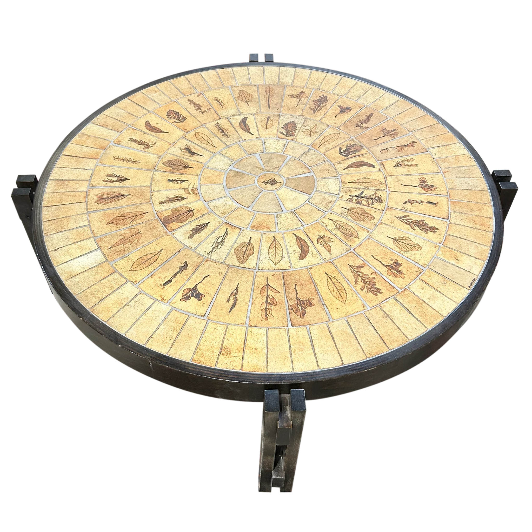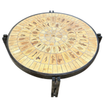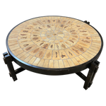 This piece is available for presale. Estimated arrival is mid to late January. Round ceramic top composed of Capron’s hand etched figural tiles, arranged in a radiating pattern with warm tan and brown glazes. Produced in Vallauris around 1960, the table sits on a dark stained wood base with a straightforward build that keeps the focus on the ceramic work.