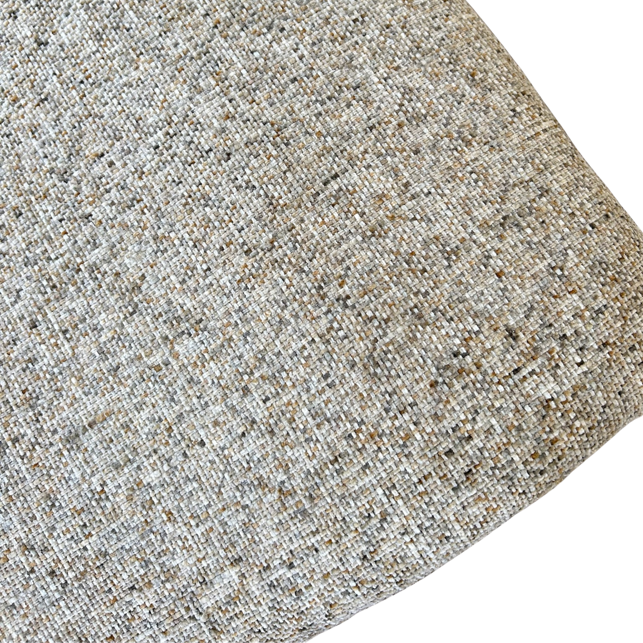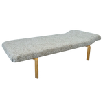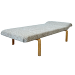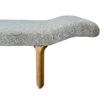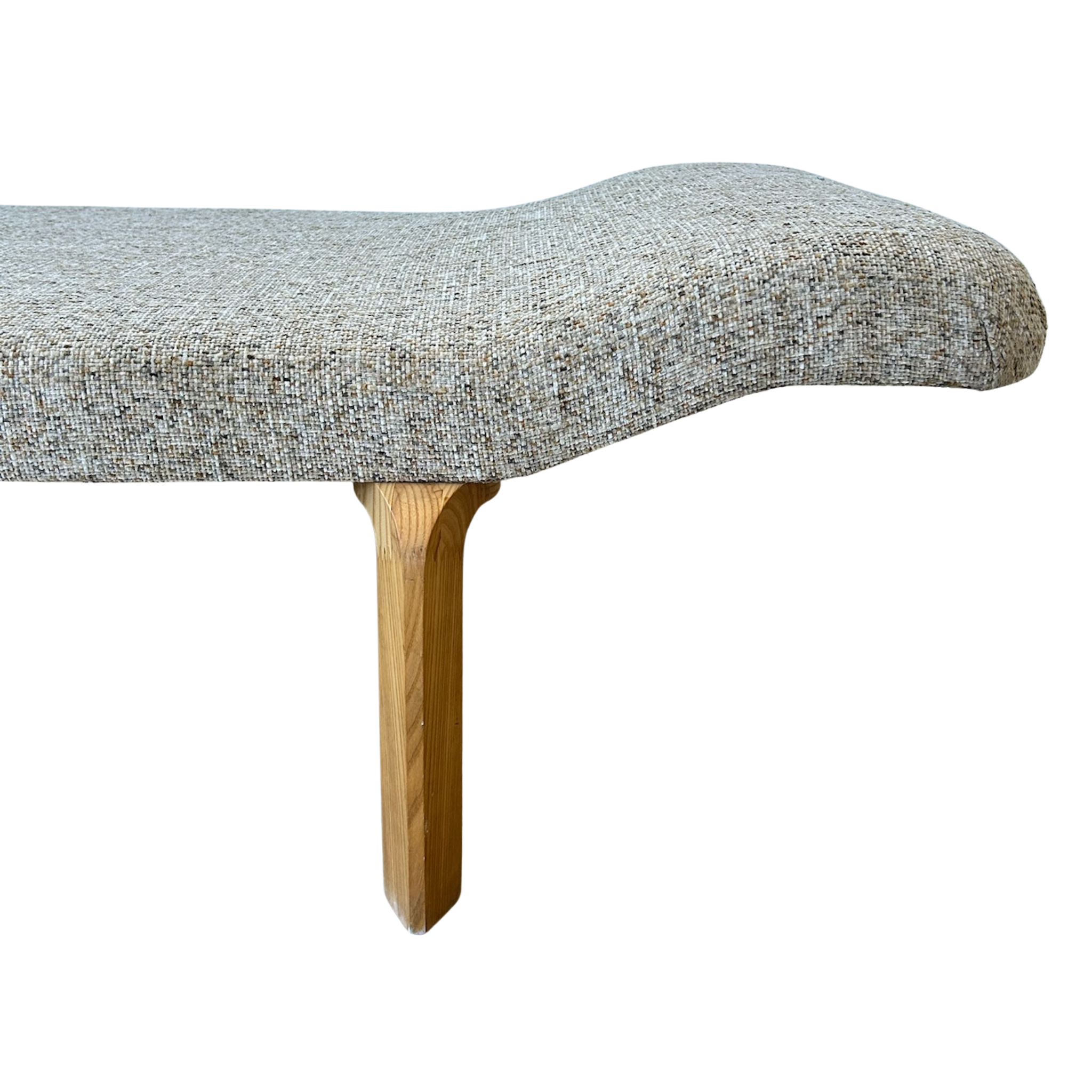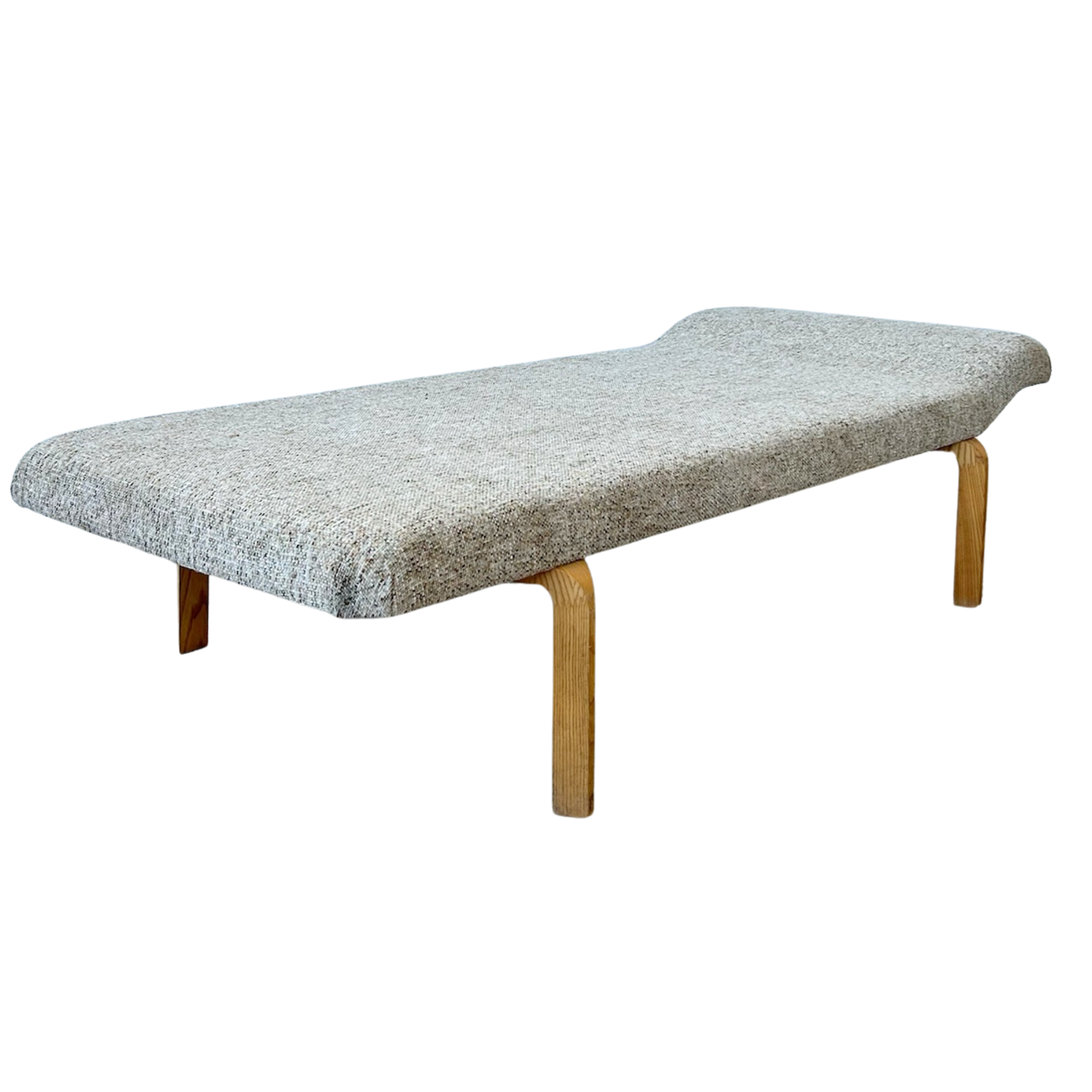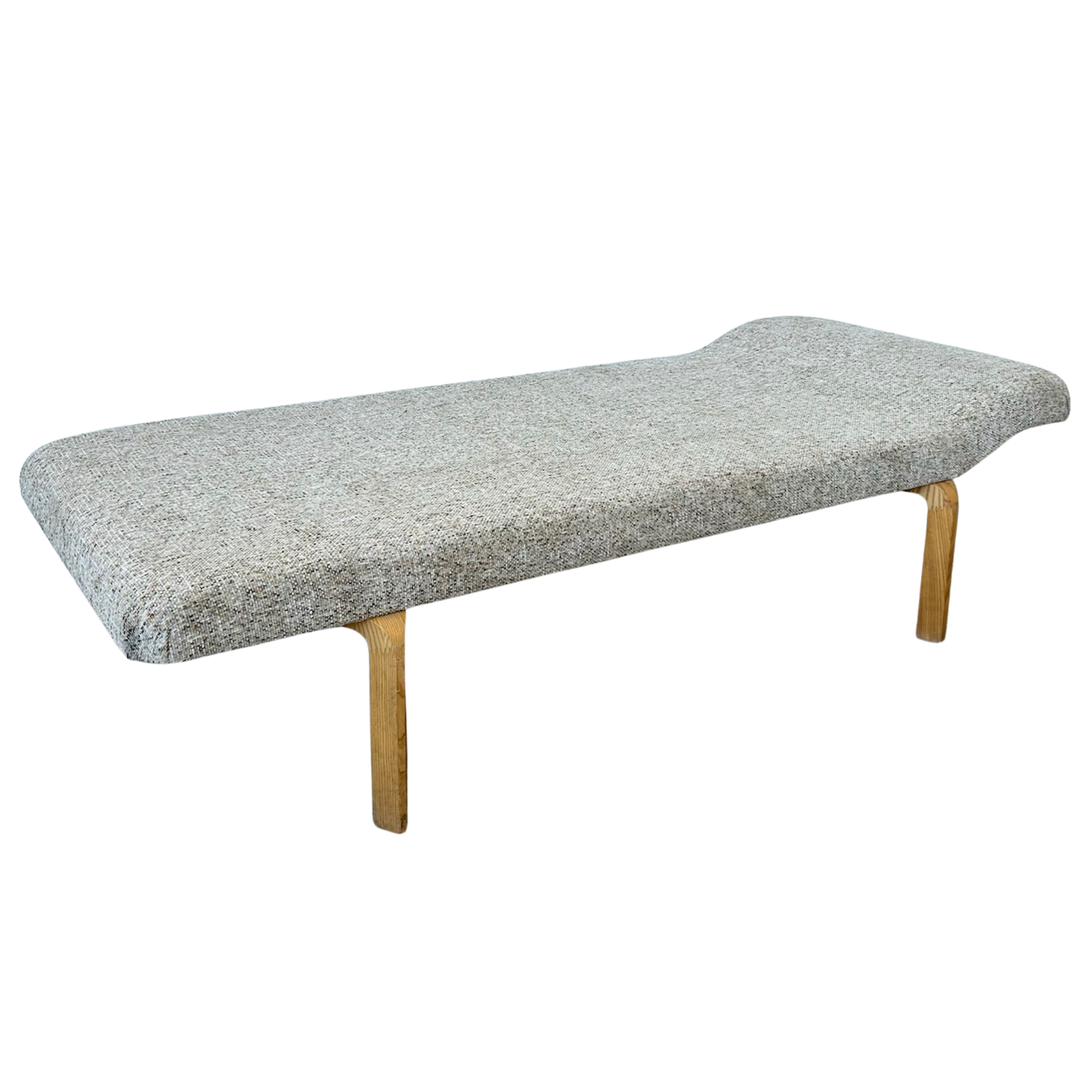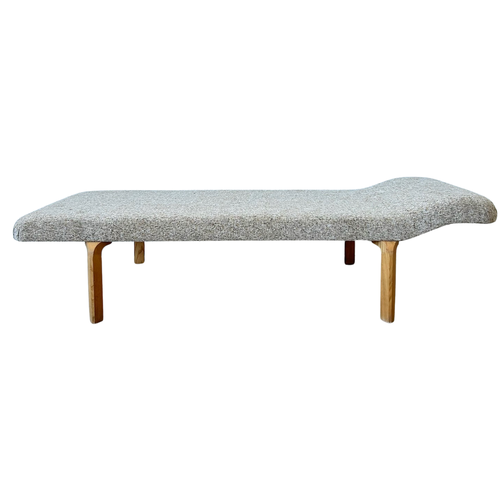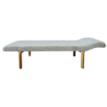 SALE- marked down from $2,950. Sculpted for simplicity, this Mid Century Scandinavian daybed features a single arc form rise at one end and solid oak legs with soft inward angles. Upholstered in textured pale neutral fabric, the piece balances minimalist proportions with an organic silhouette.