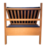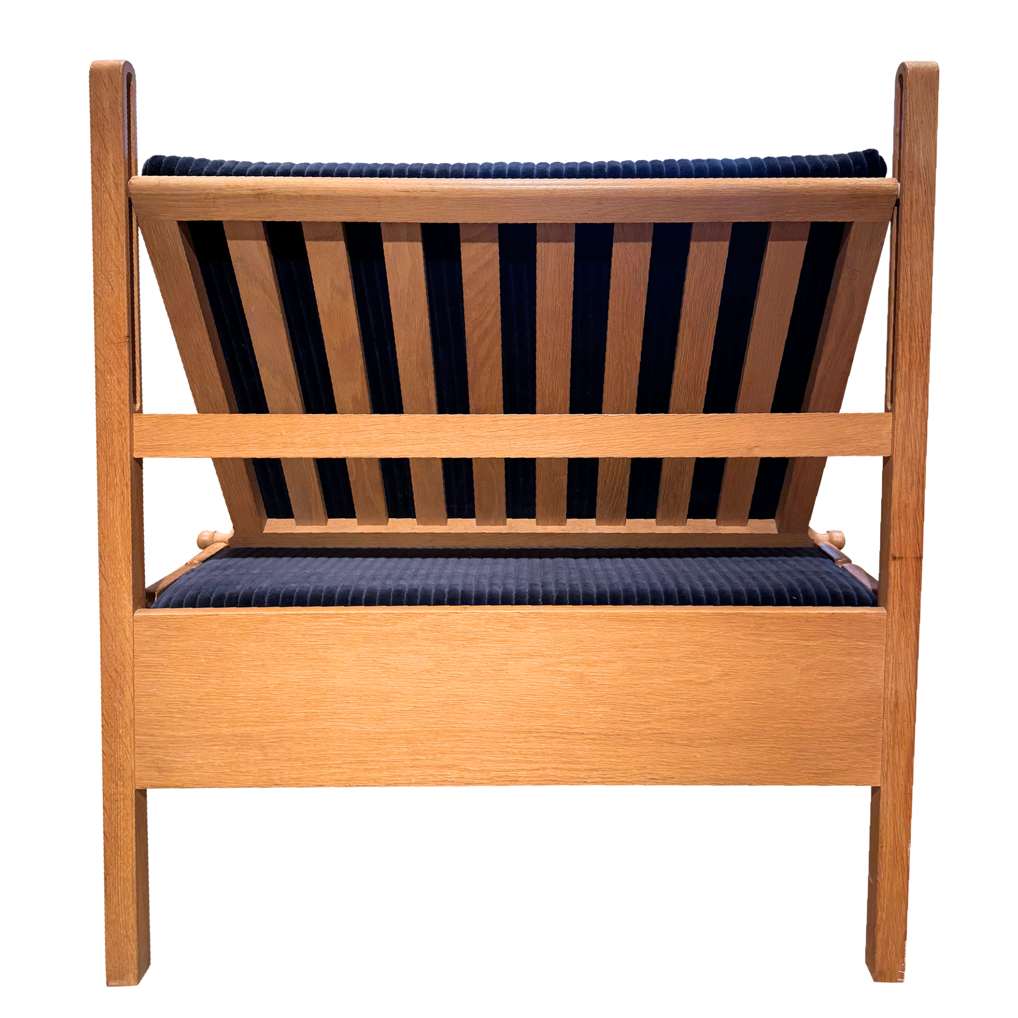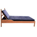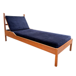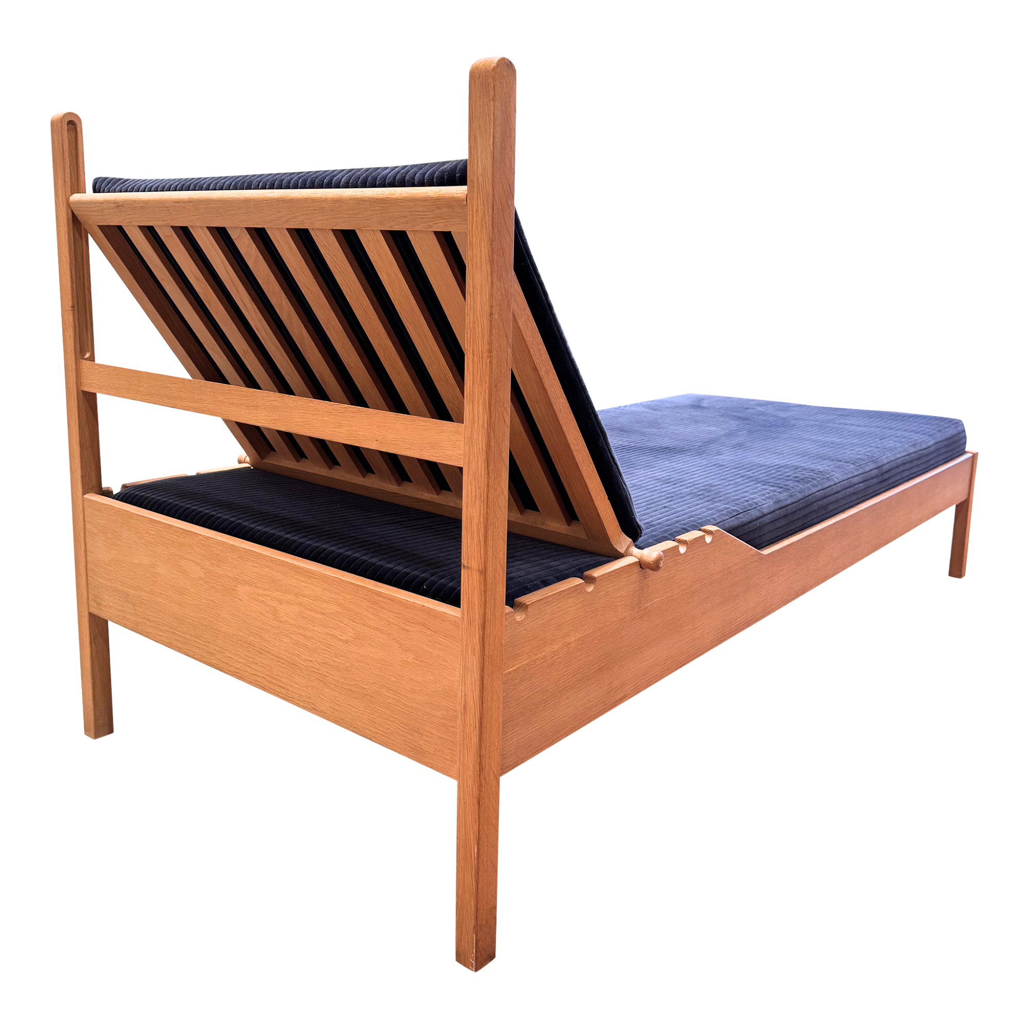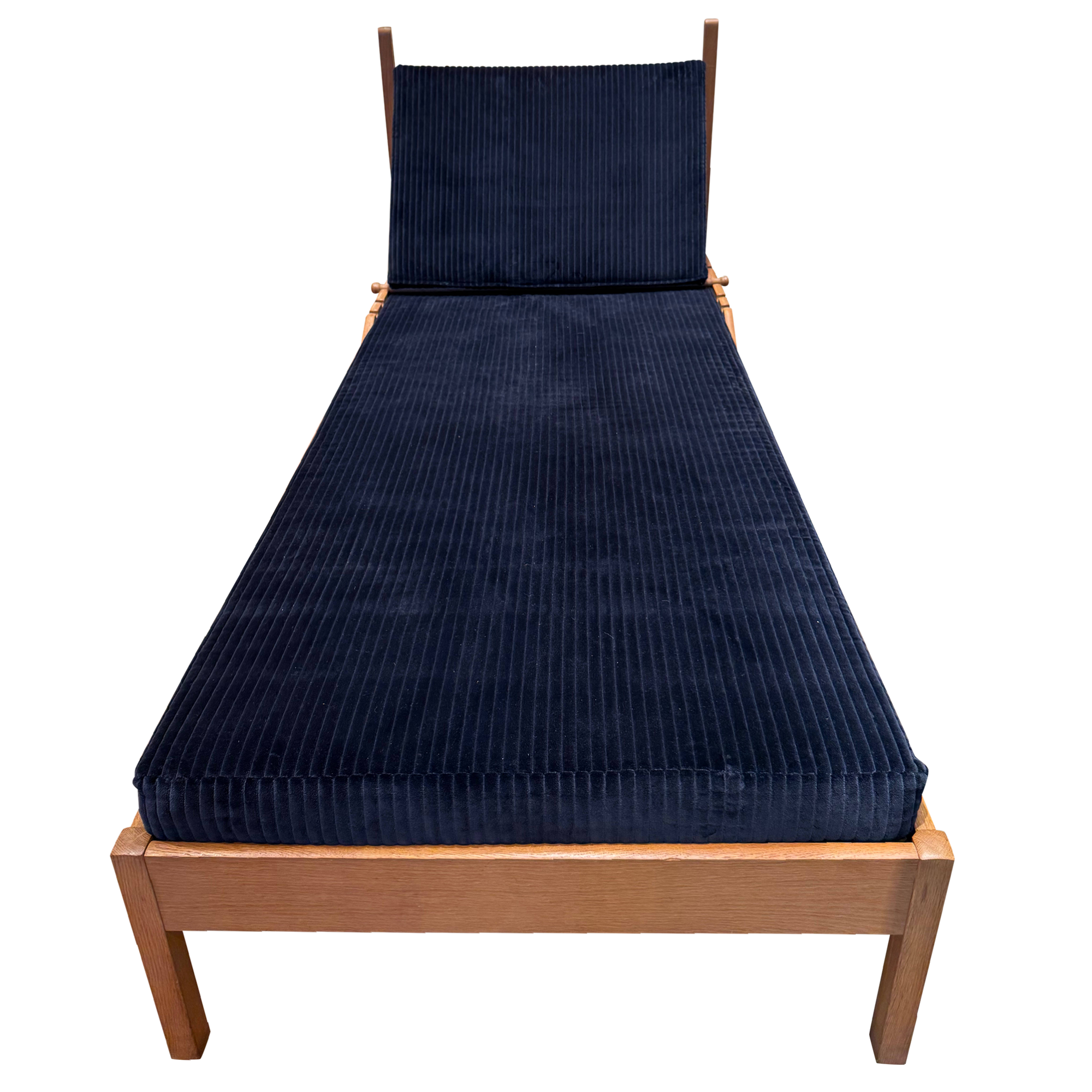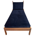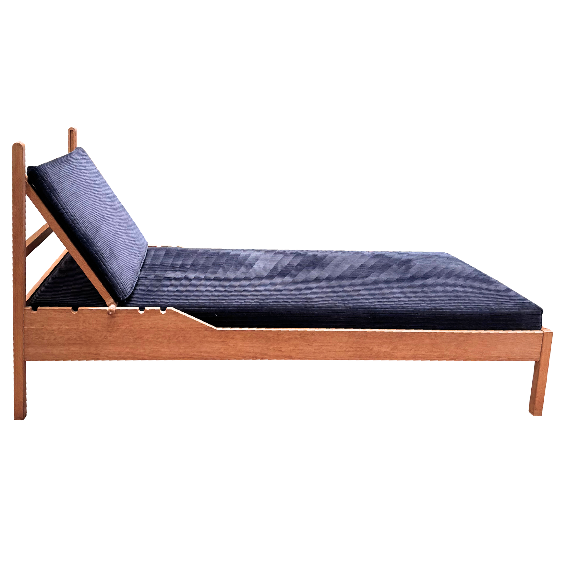 An oak daybed with a straight frame and deep blue corduroy cushions. The back rests on adjustable supports, allowing it to move from upright to reclined with a simple shift.