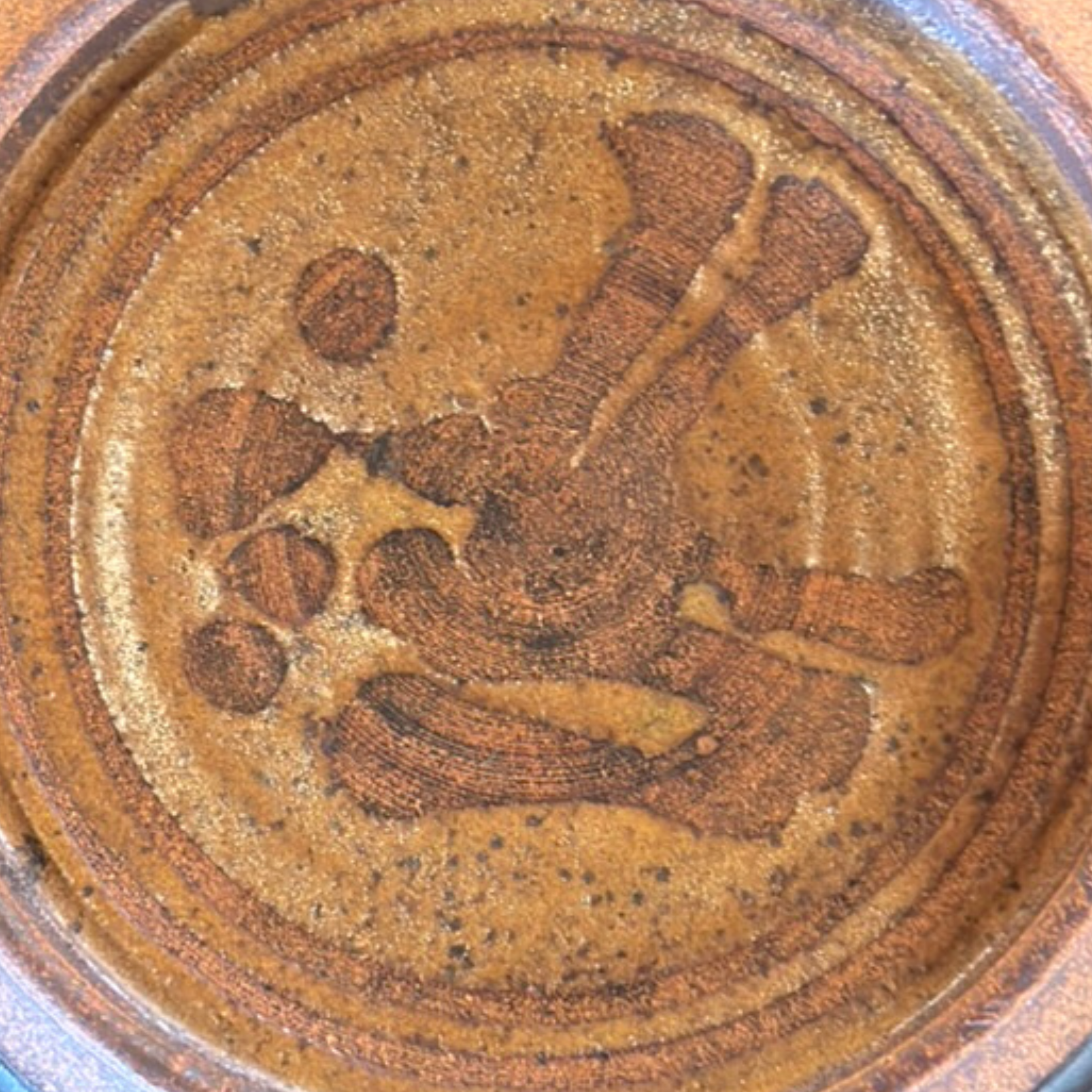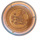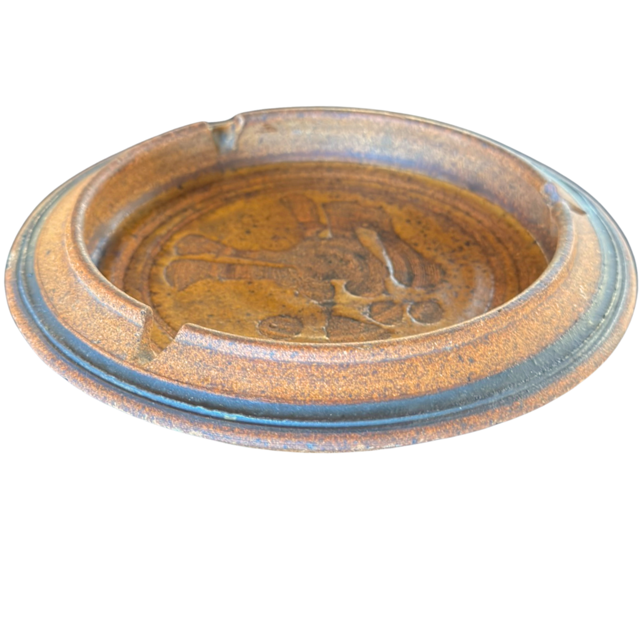 Round stoneware ashtray featuring a warm brown and ochre glaze, with an abstract figural motif at the center. Incised grooves along the rim create defined rests, combining functional design with an earthy, handmade aesthetic.