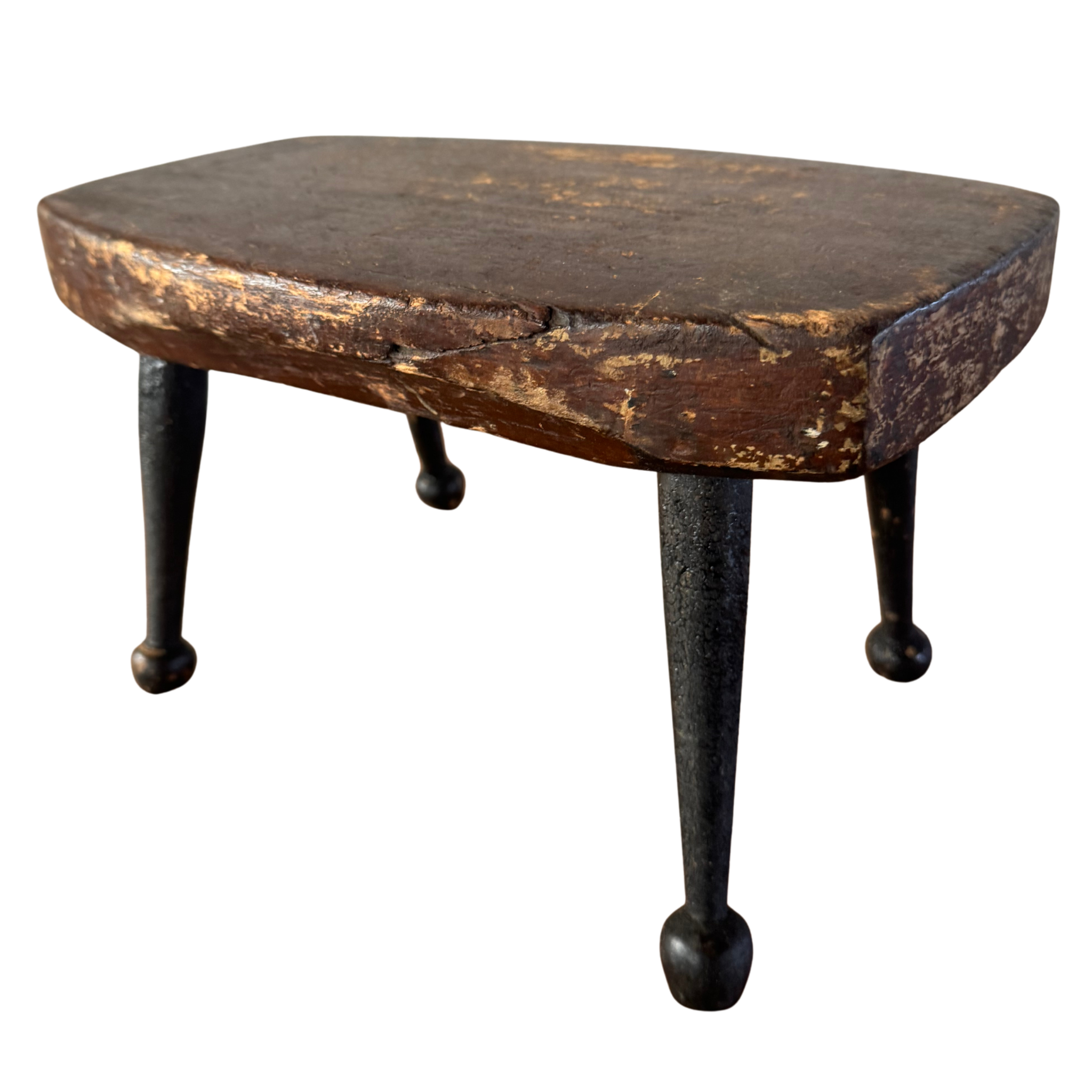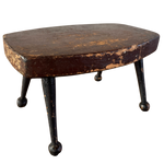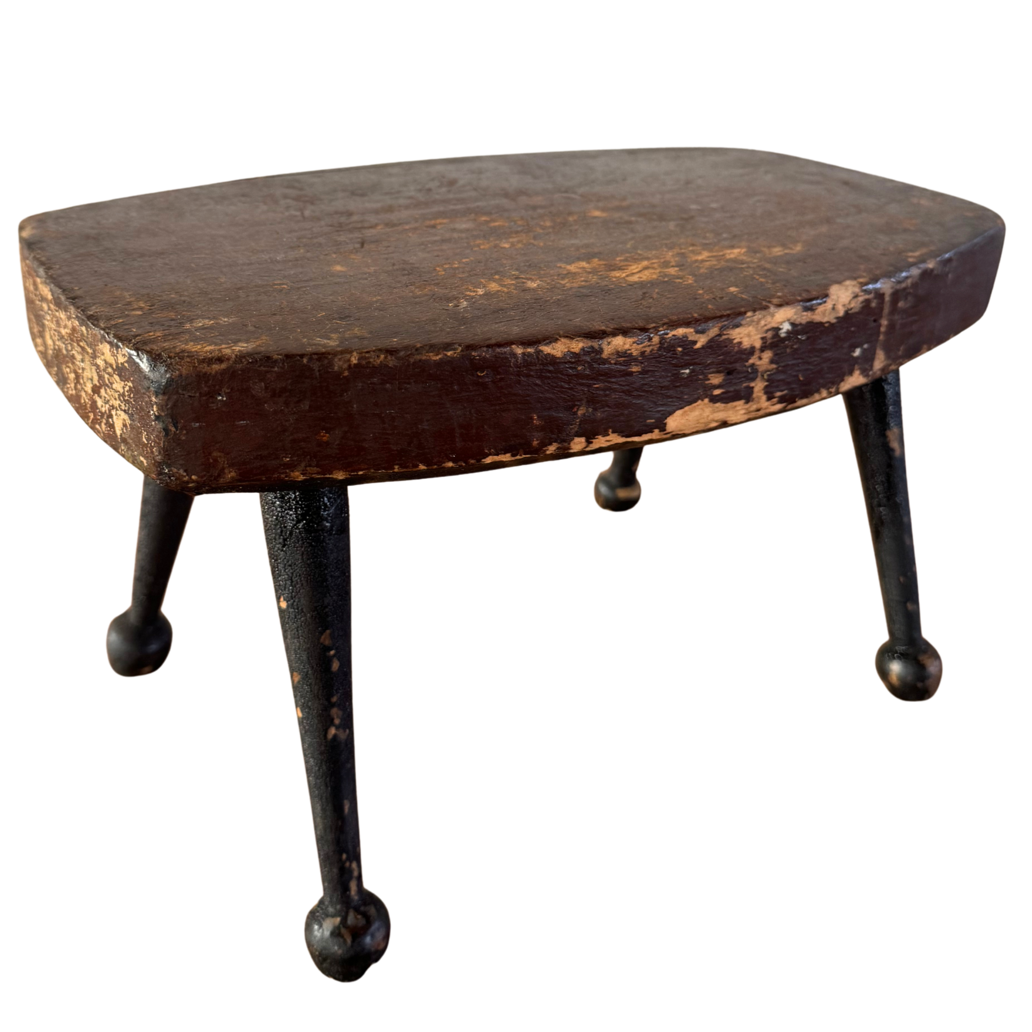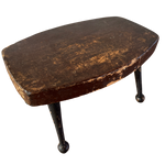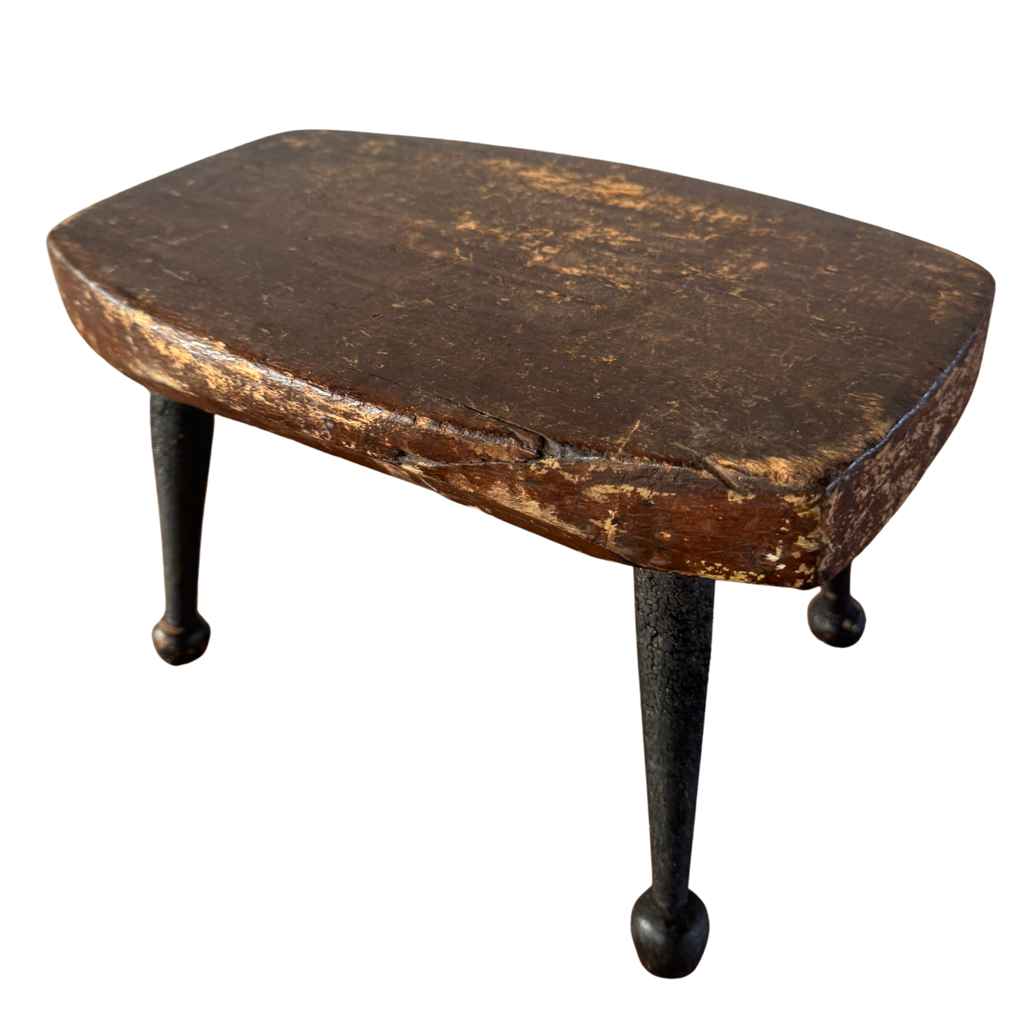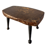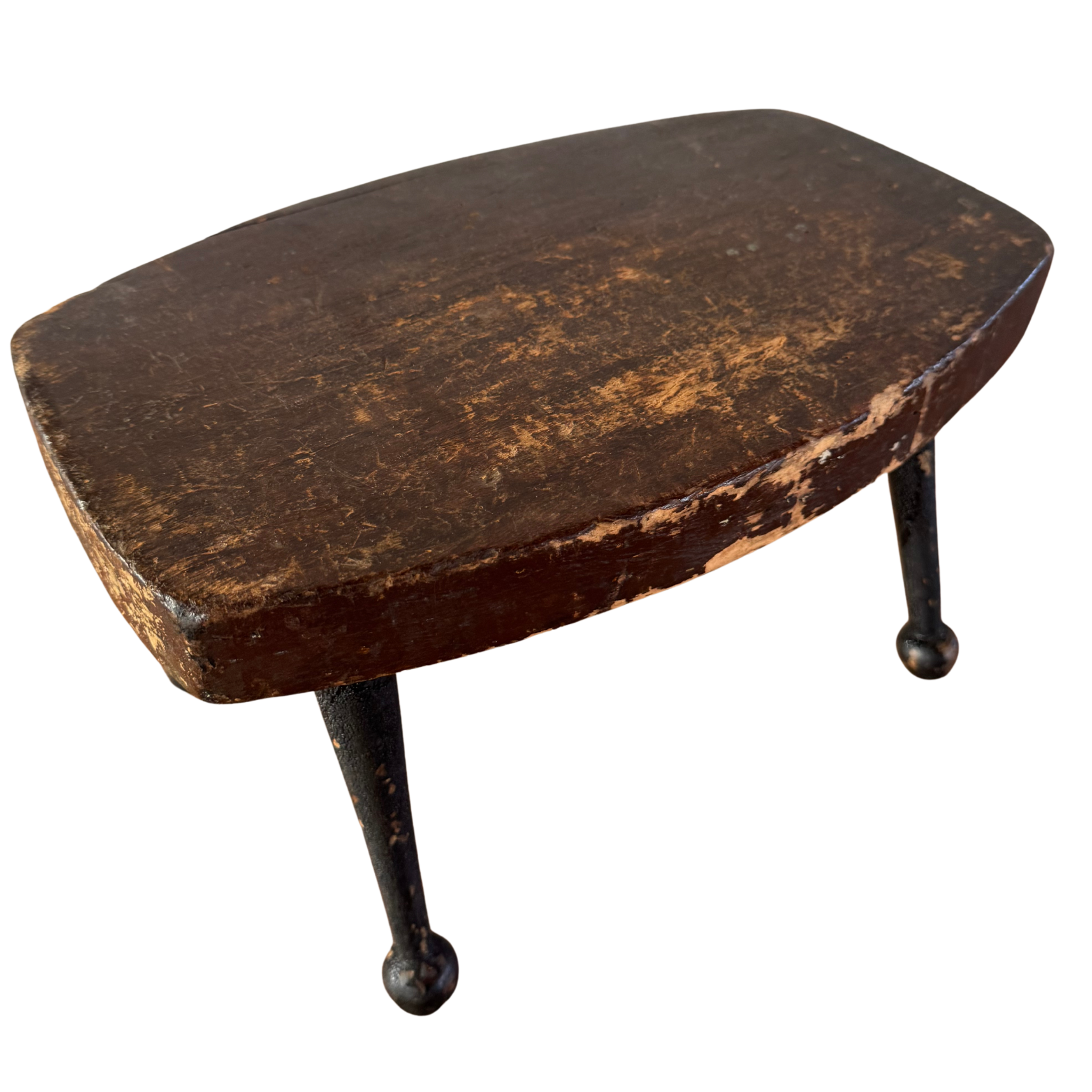 Antique cricket bench with a worn wood seat and iron legs. Compact, sturdy, and shaped by use.
