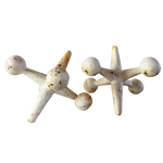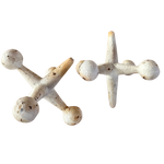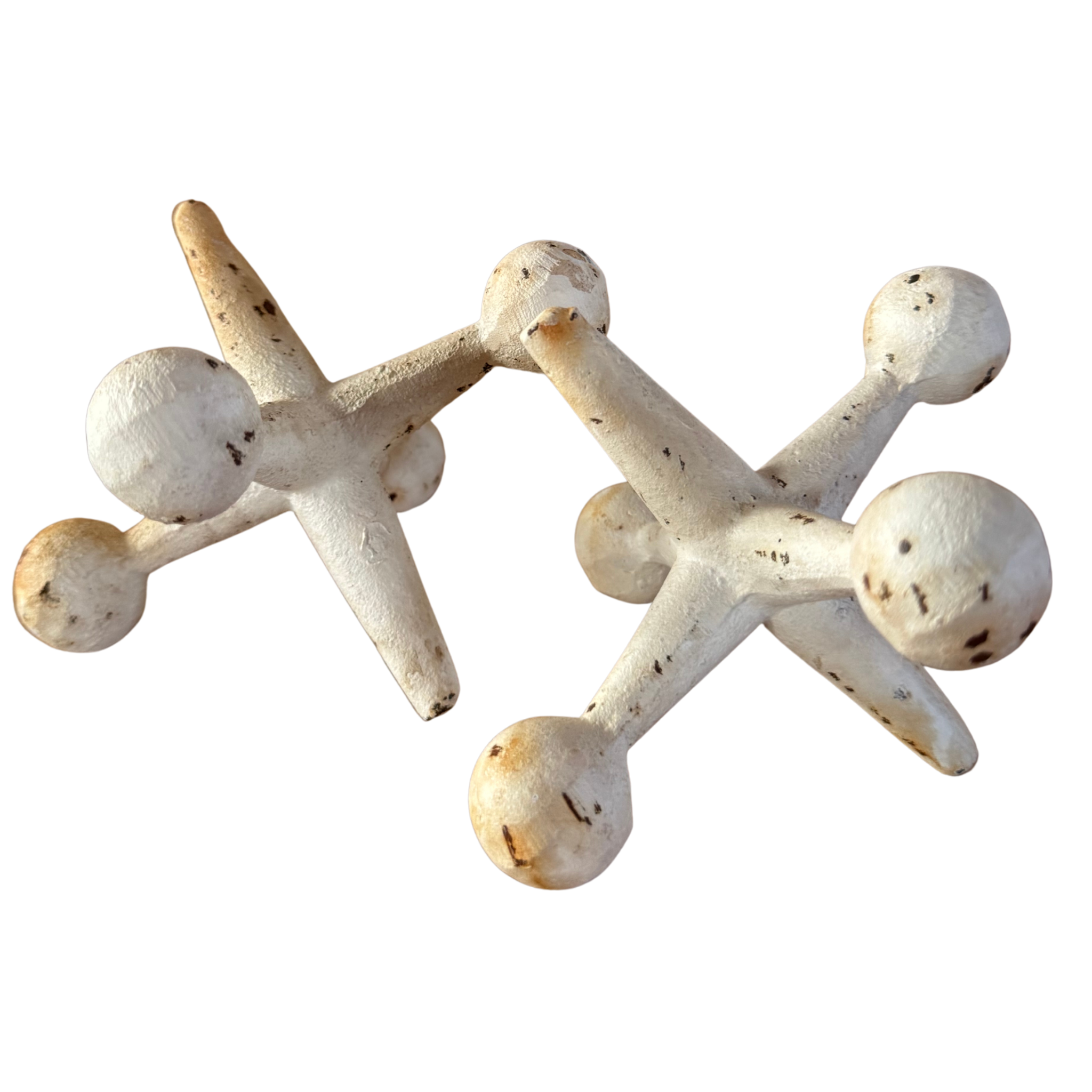 Pair of oversized cast iron jacks with a matte ivory finish and scattered oxidation throughout. Their playful, geometric form and weighty construction make them sculptural accents with a nod to midcentury design.