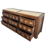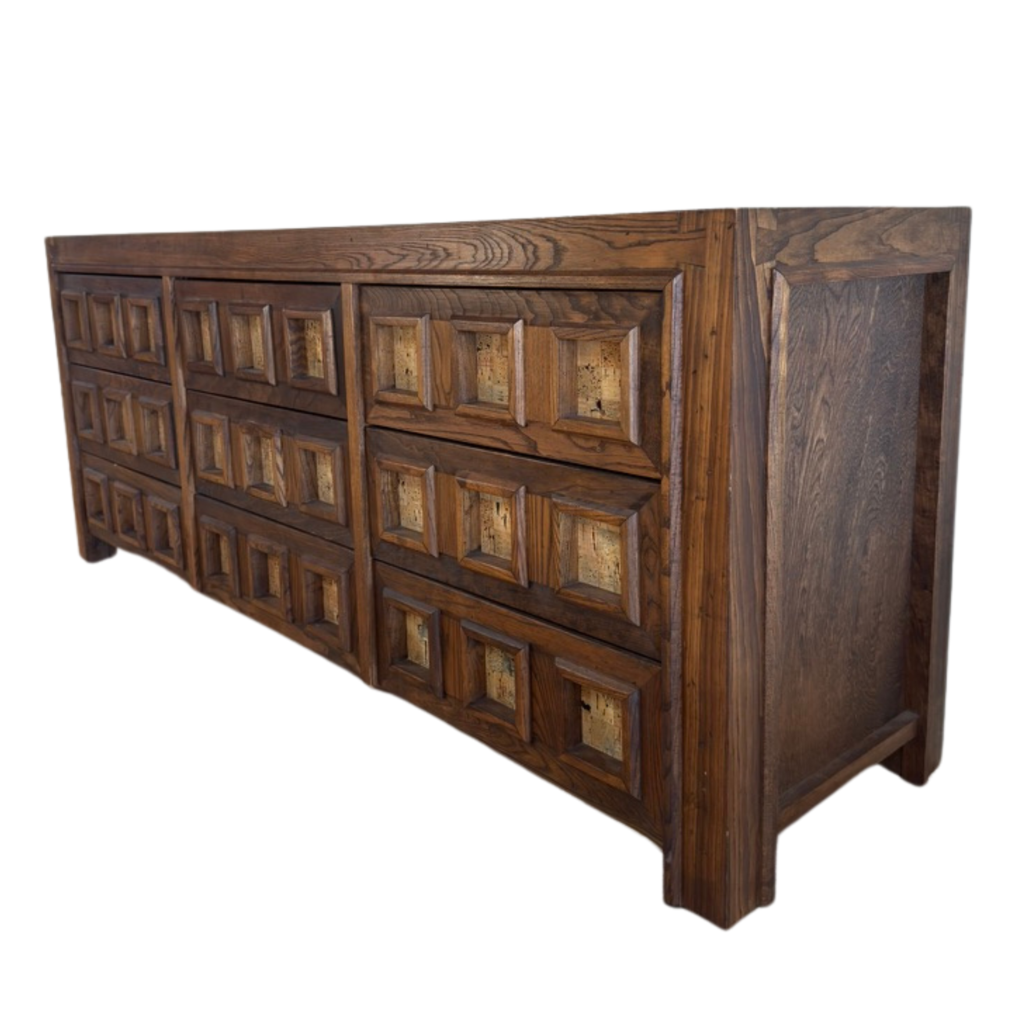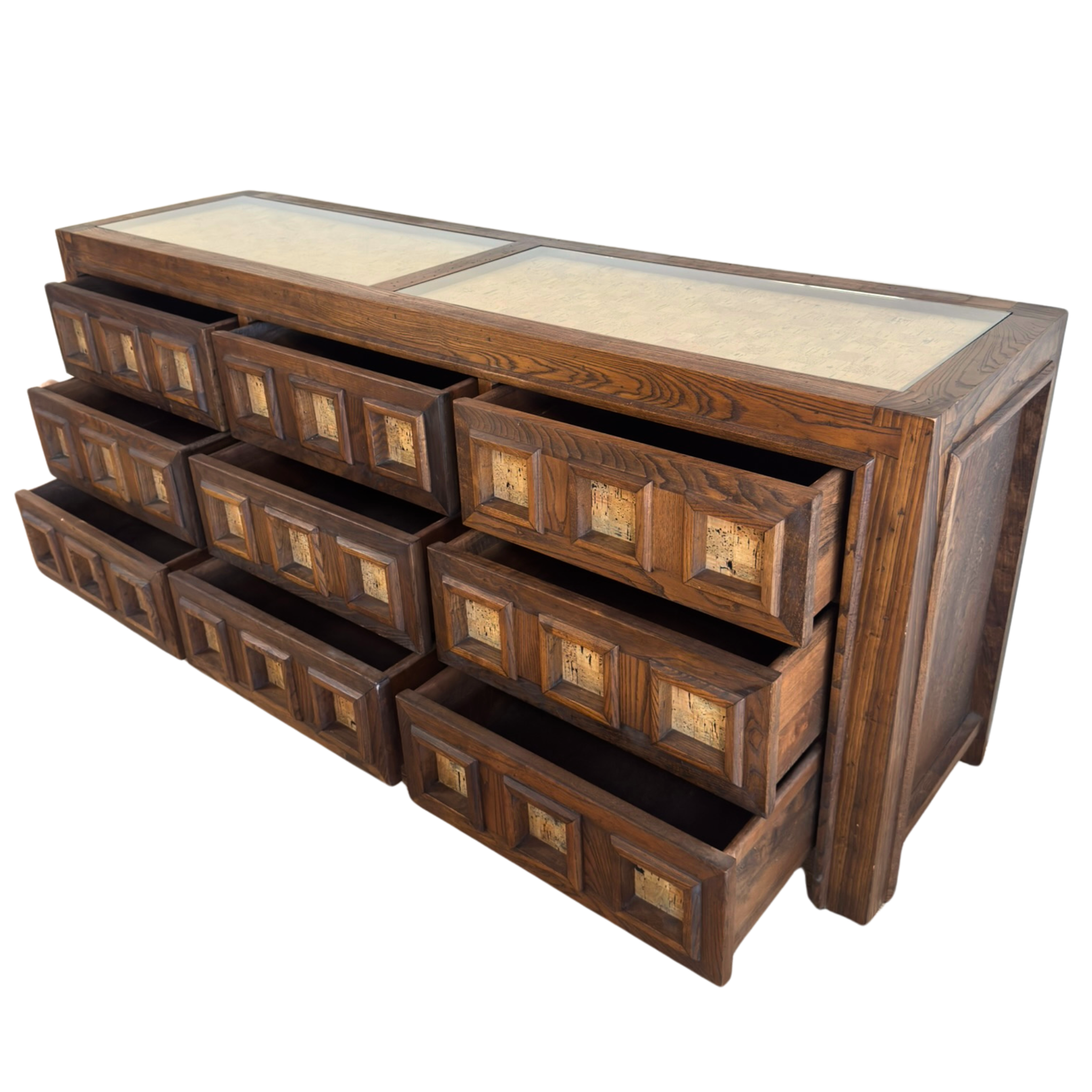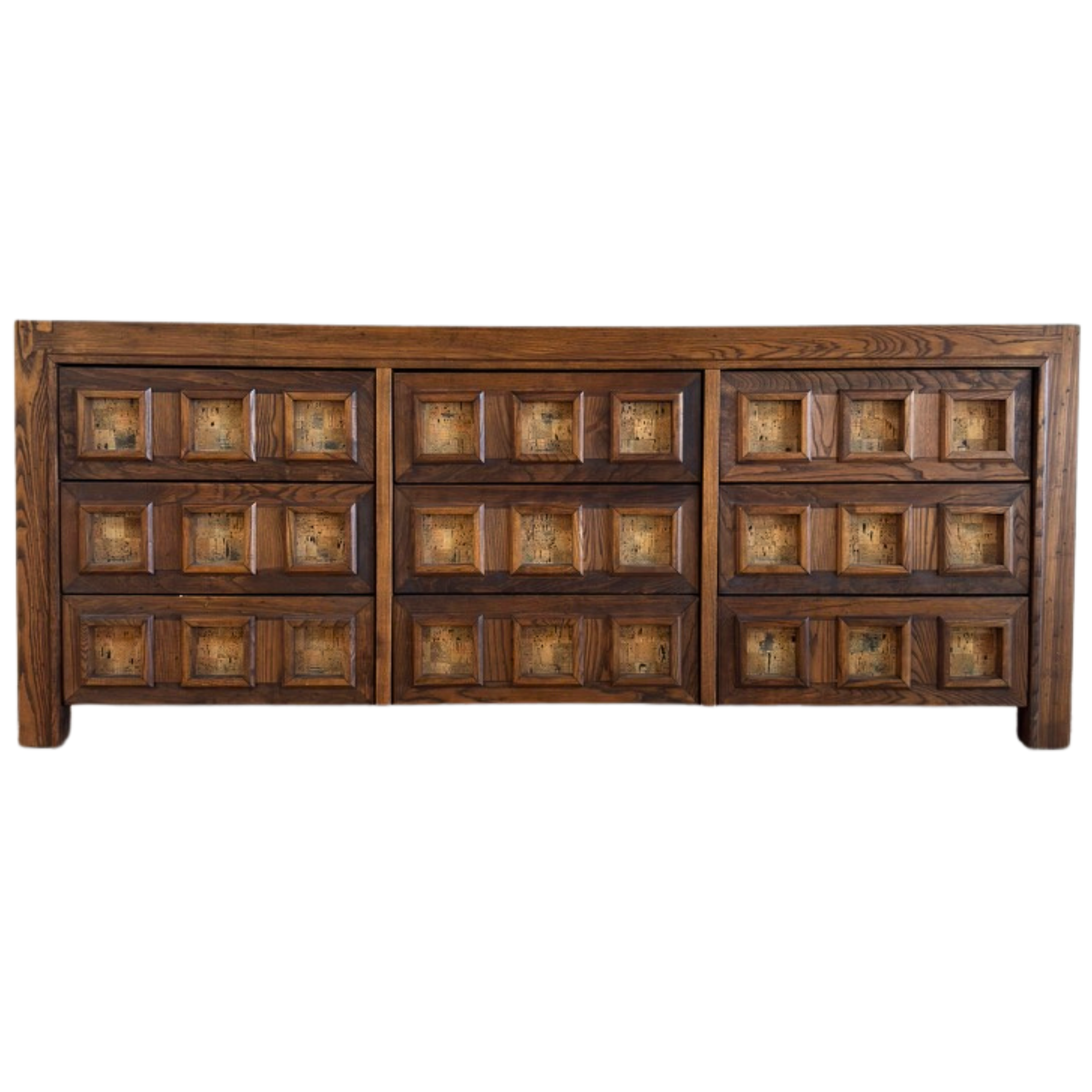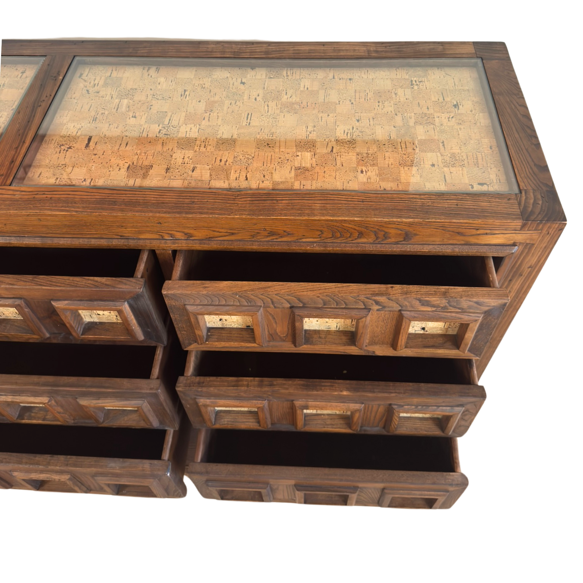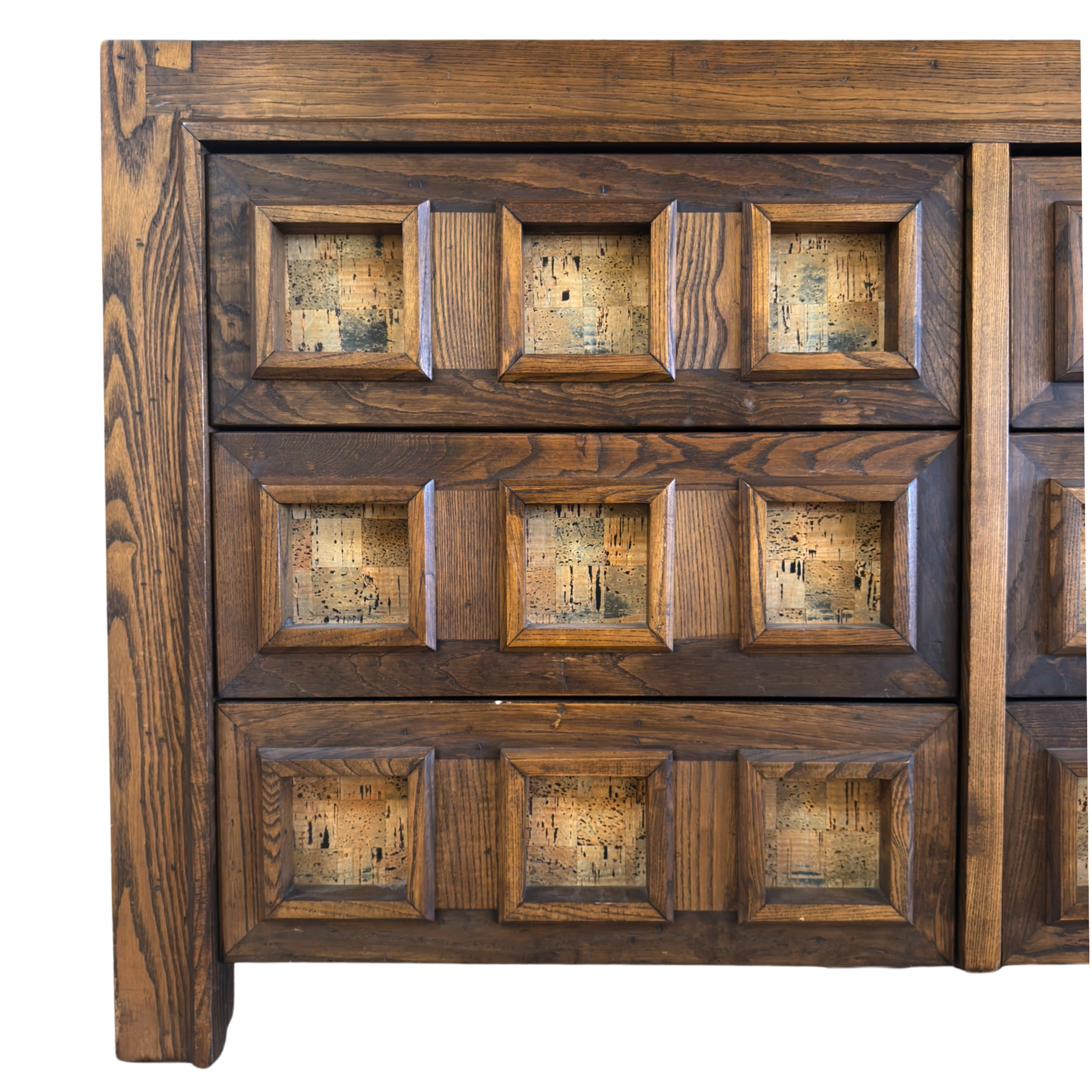 Matching pair of nightstands available, sold separately. Geometric oak dresser with carved cube fronts and cork insets. The deep grain and natural variation in the cork bring texture and contrast to the structured form. Solid and functional with a graphic edge.