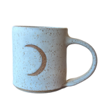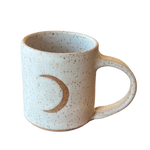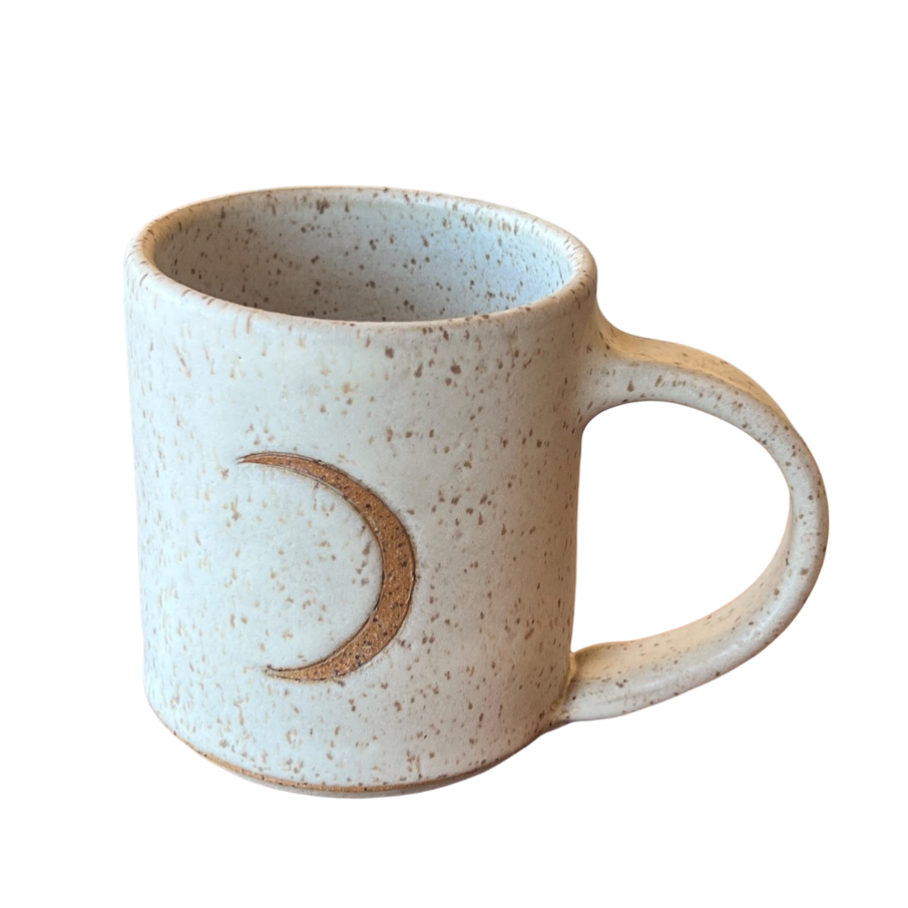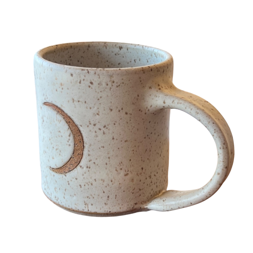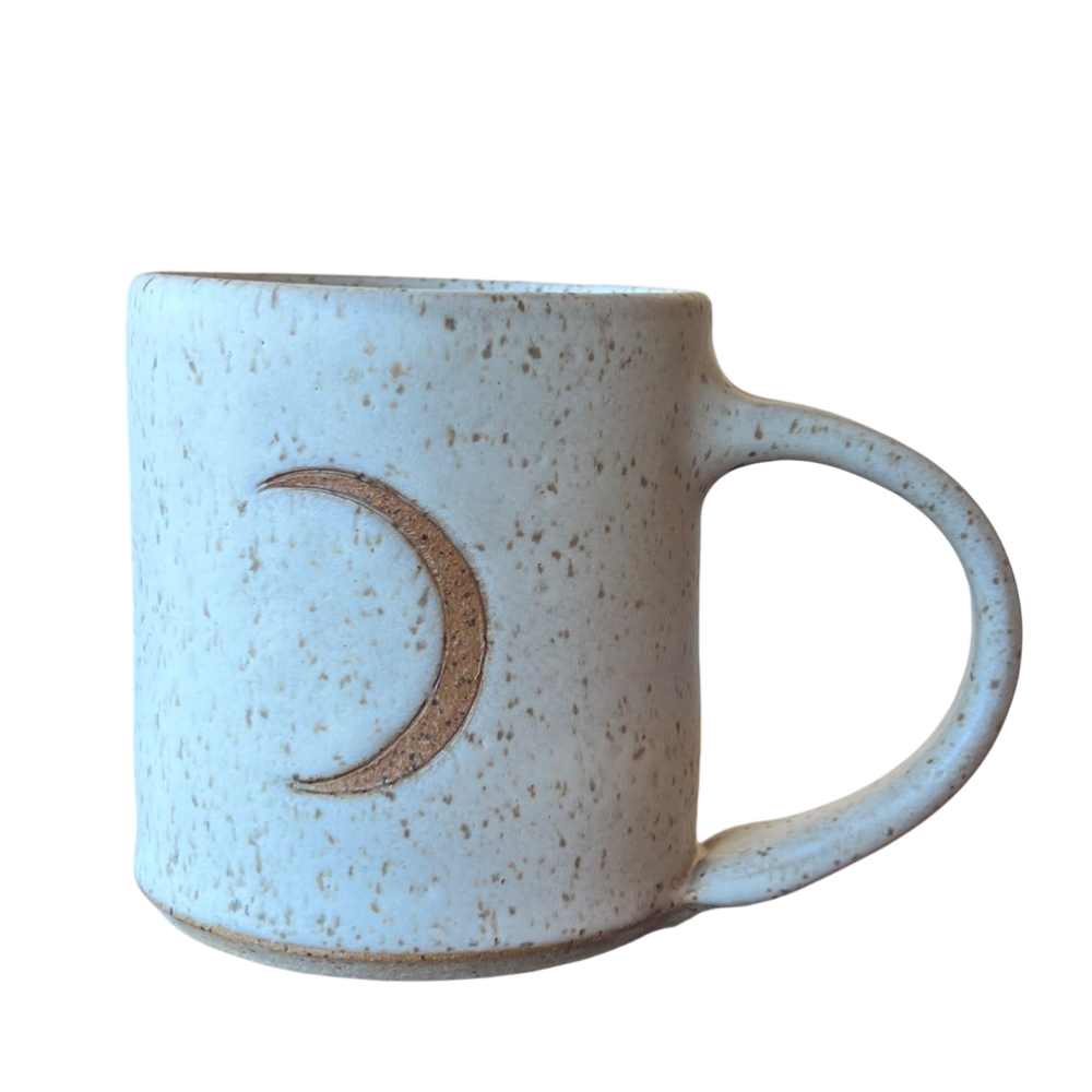 Handmade speckled stoneware mug. Dishwasher + Microwavable safe. Holds 14 oz. Hand carved + painted in food safe matte glaze with raw moon.