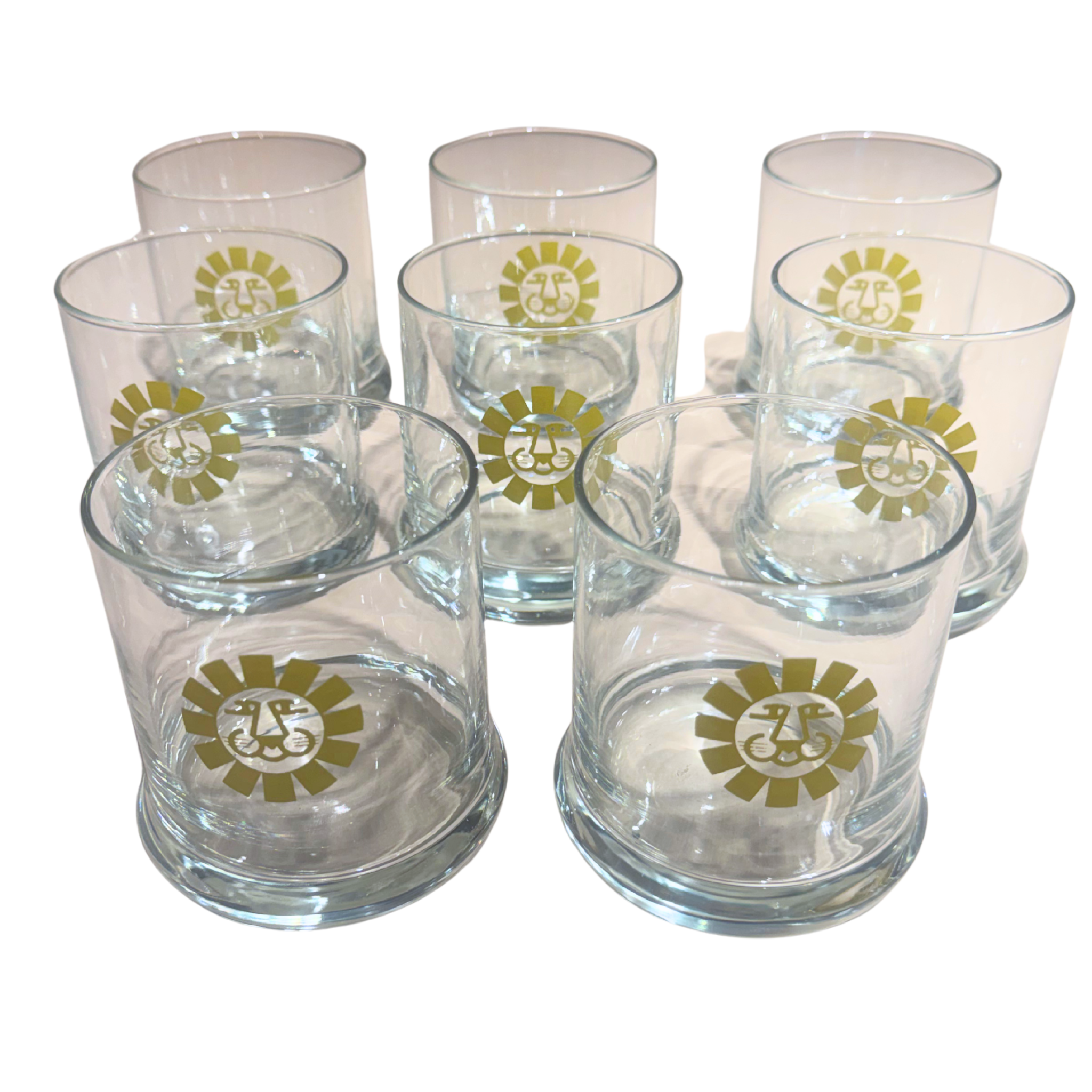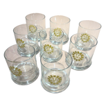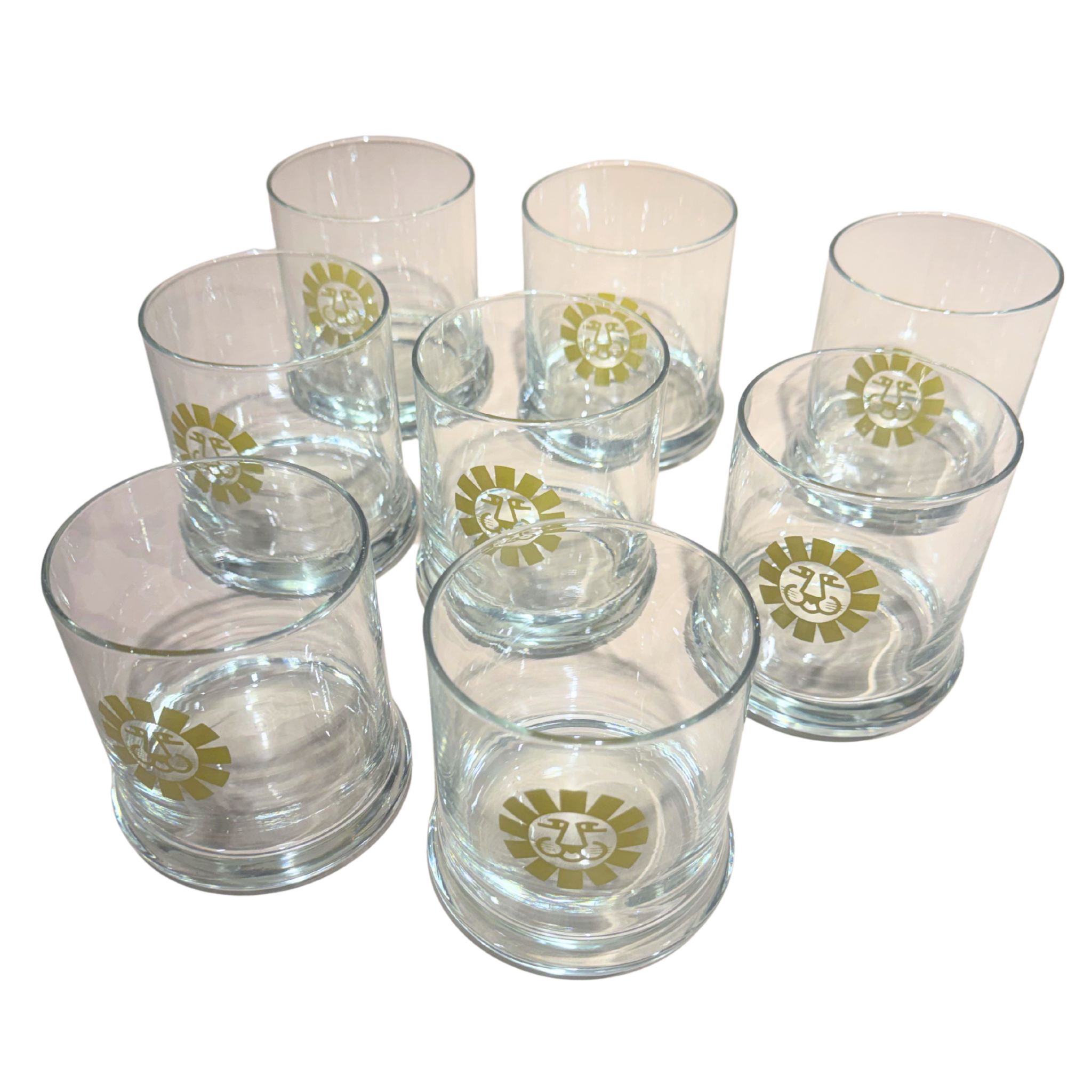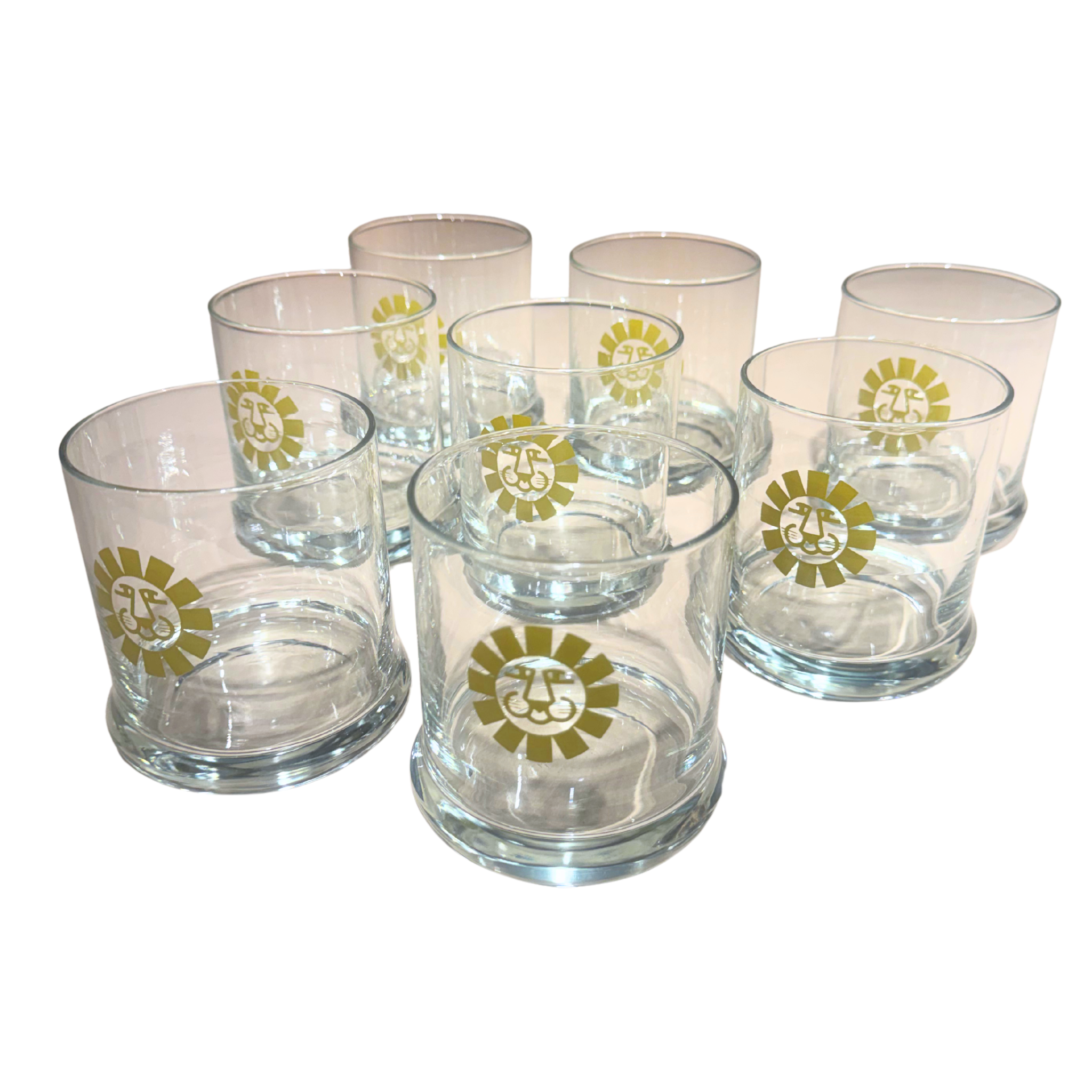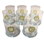 Clear vintage tumblers featuring a stylized yellow sun motif. Straight sided with a thick base and bright graphic detail that adds a bit of charm to the table.