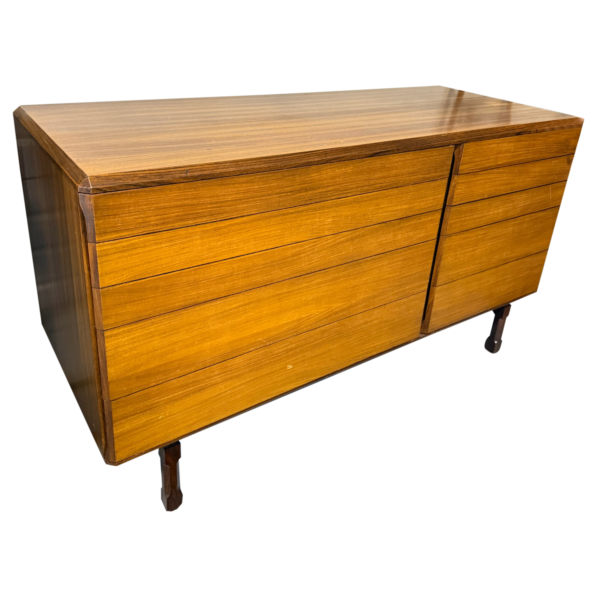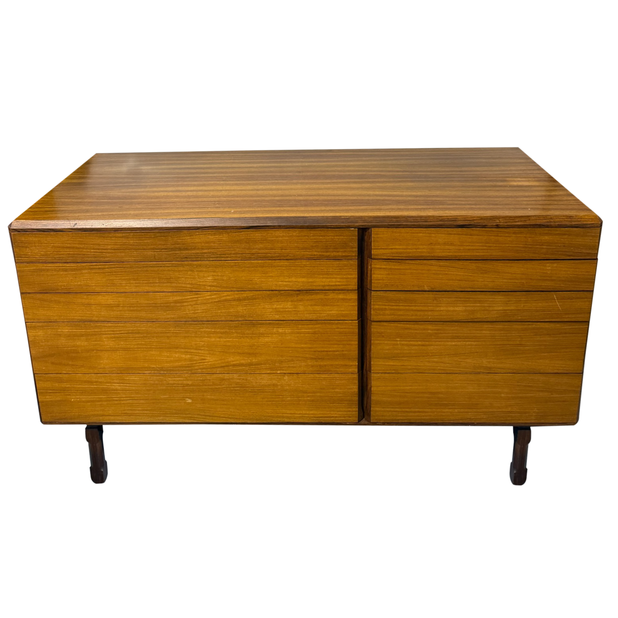 This piece is available for presale. Estimated arrival is February 20th. A low mid century teak cabinet with two drawer stacks on narrow legs. The front is plain and linear with long grain and simple recessed pulls.