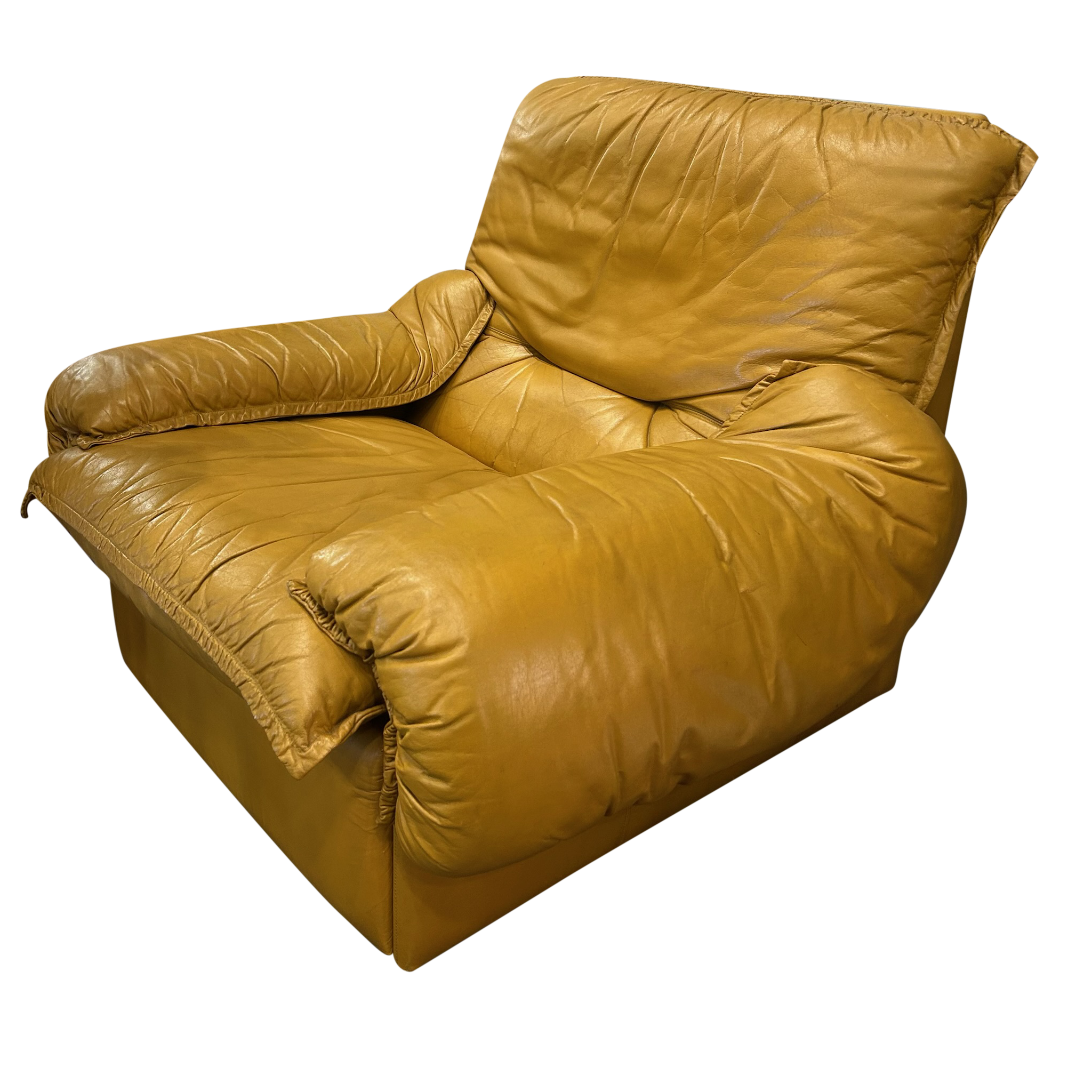 This piece is available for presale. Estimated arrival is February 20th. Soft butterscotch leather with natural creasing and a relaxed, lived in surface. The chairs sit wide and low, with thick cushioning that settles into an easy, unforced shape. Ultra comfortable without sacrificing style.