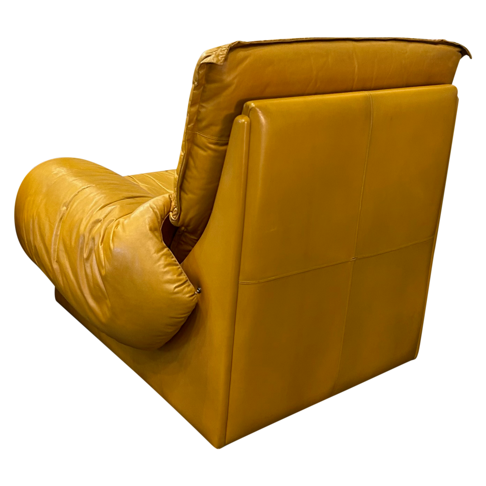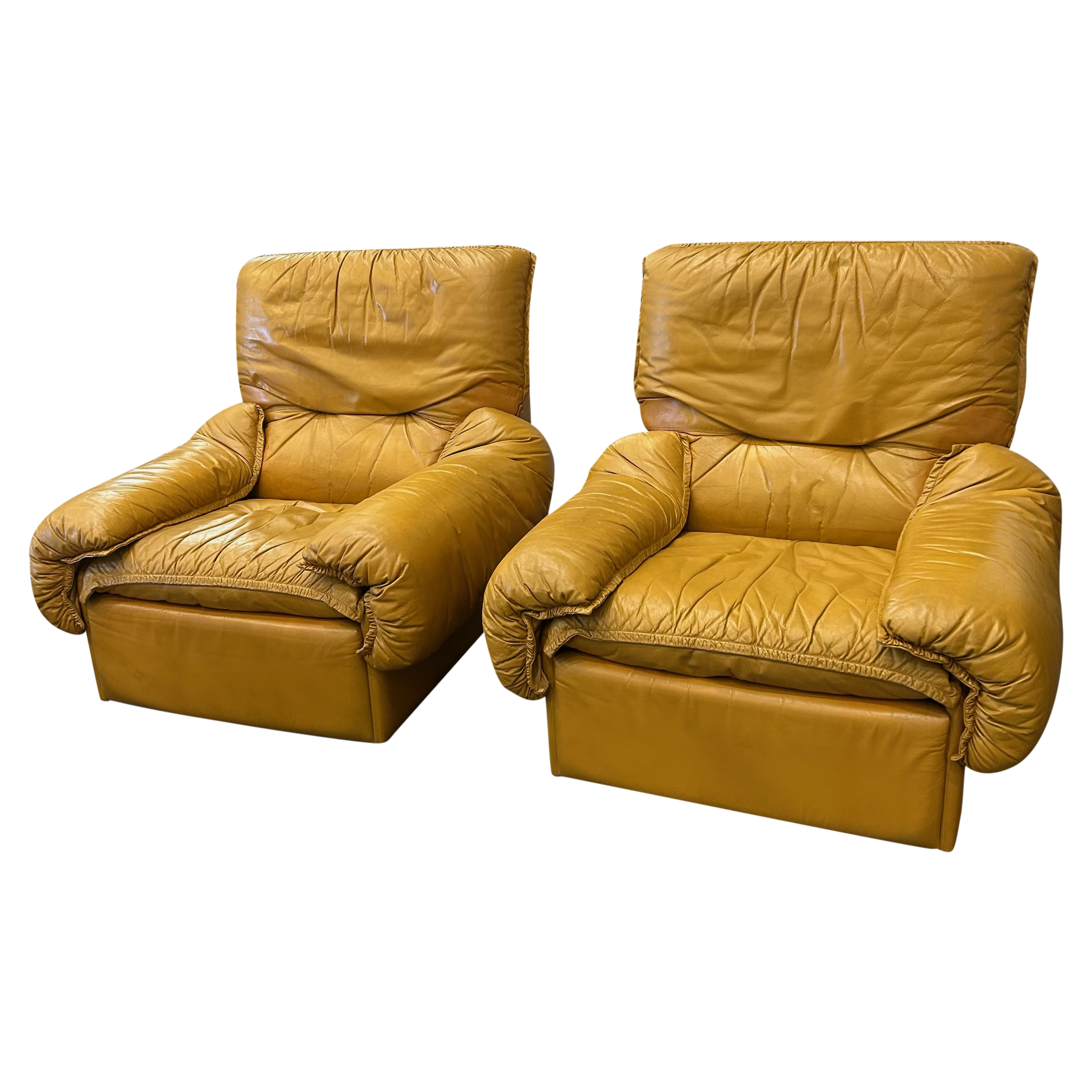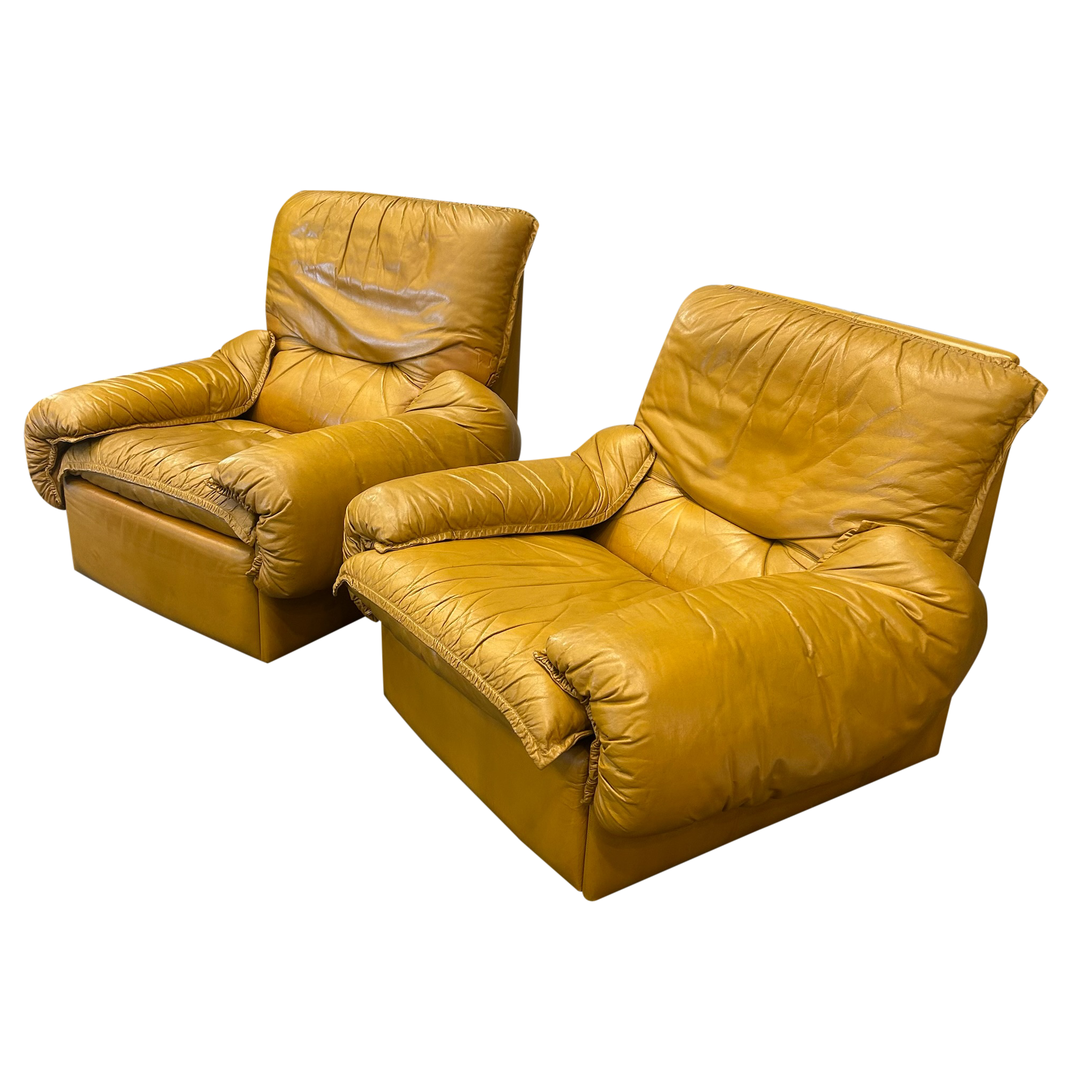 Pair of Chunky Butterscotch Leather High Back Lounge Chairs, Italy, 1970s
