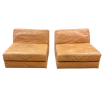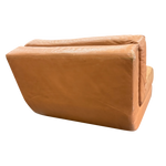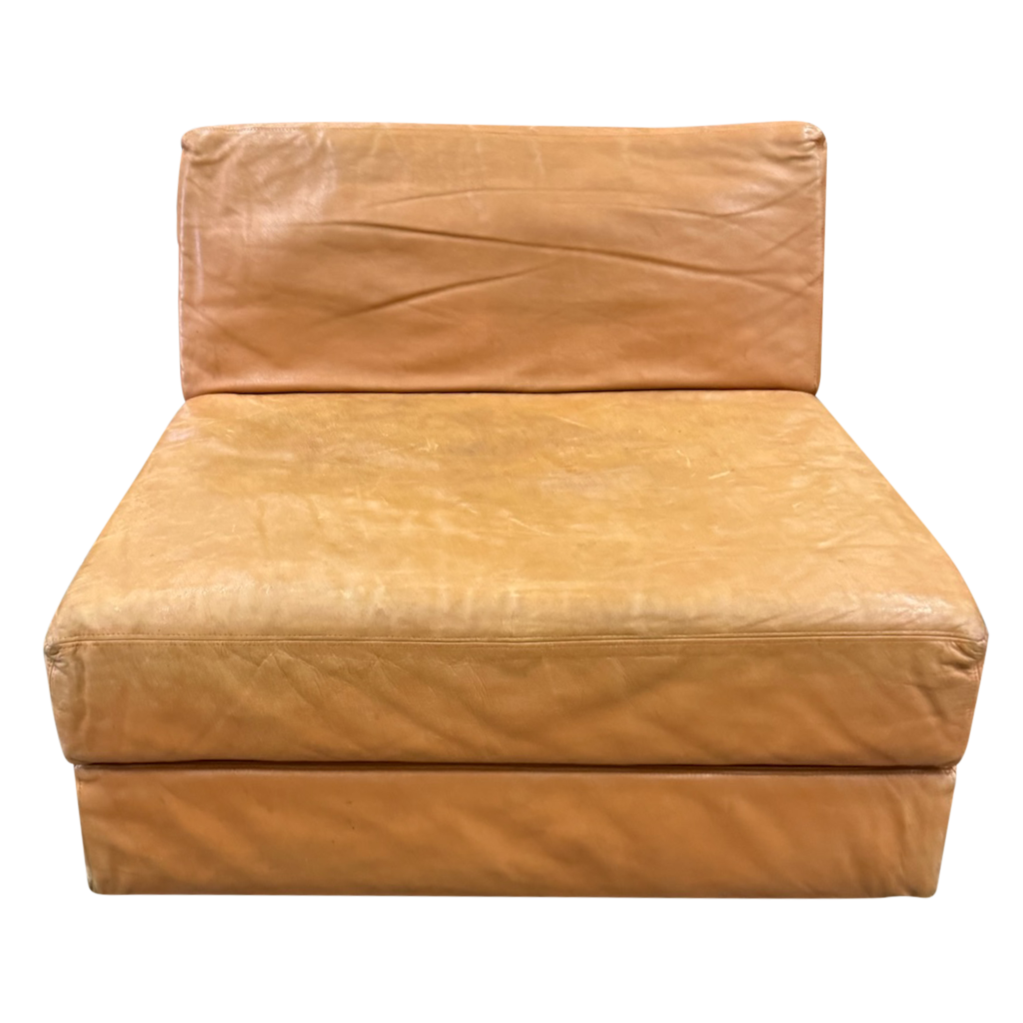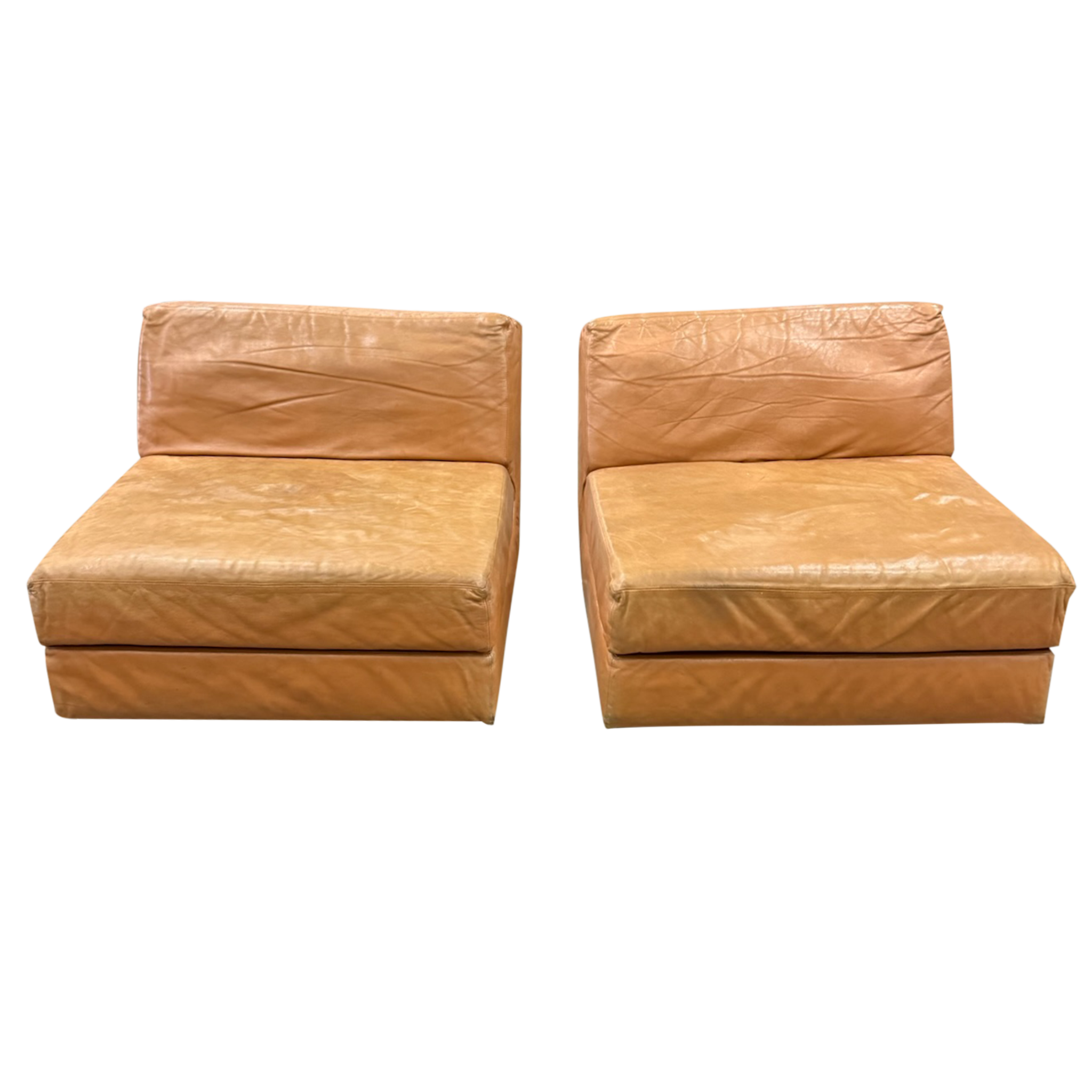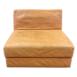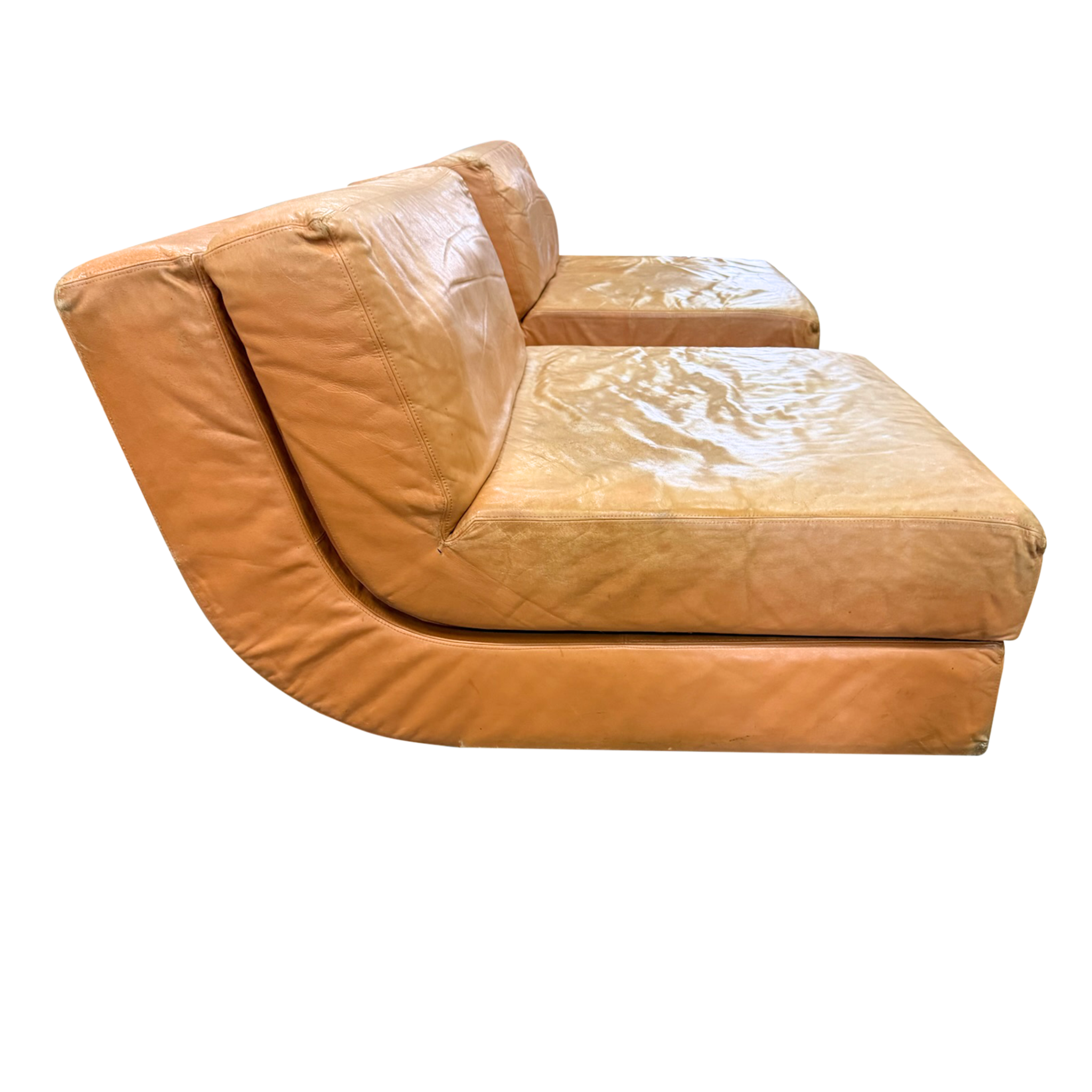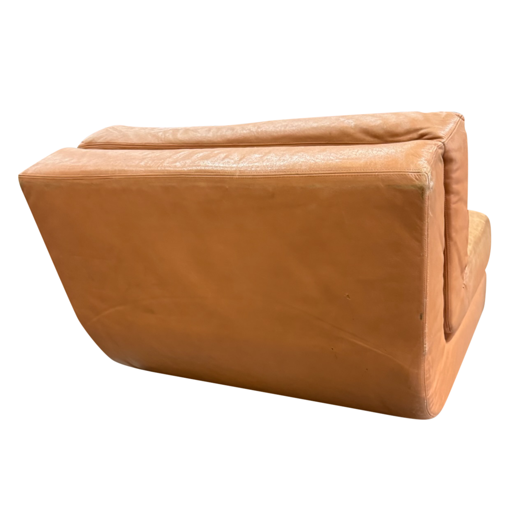 This piece is available for presale. Estimated arrival is February 20th. Softly curved silhouettes wrapped in original patinated cognac leather. The seats have a low profile with a gentle rise at the back that creates the curve. Features hand stitched seams and natural creasing in the leather.