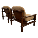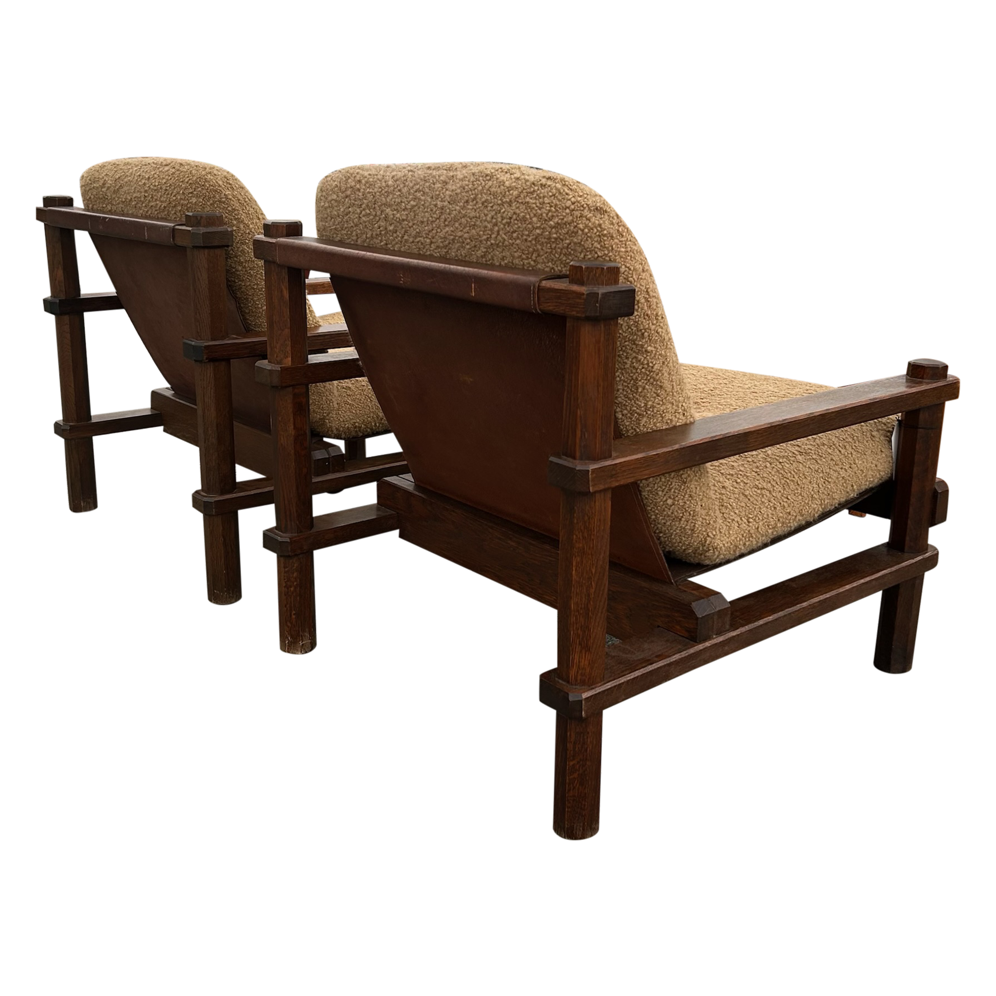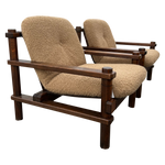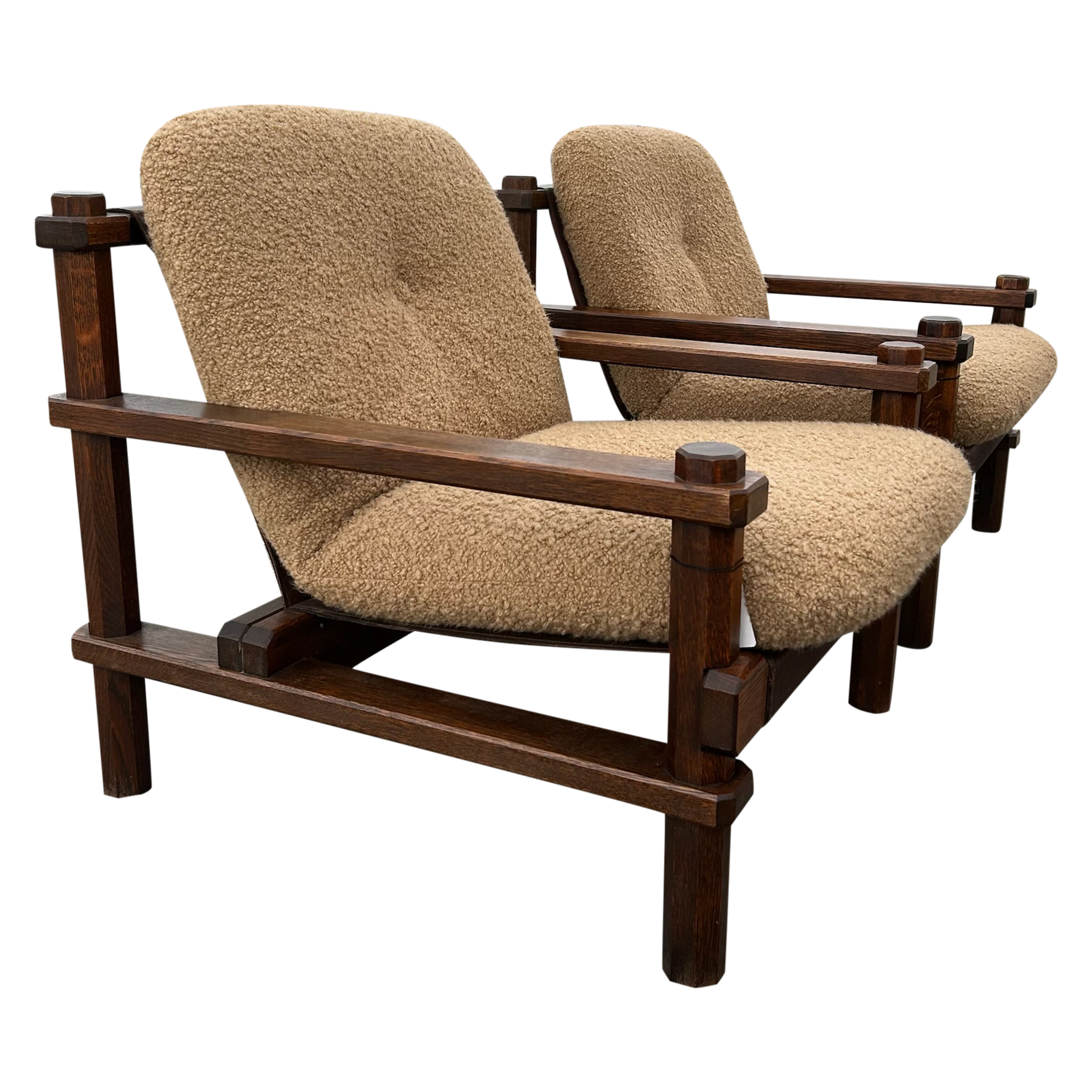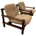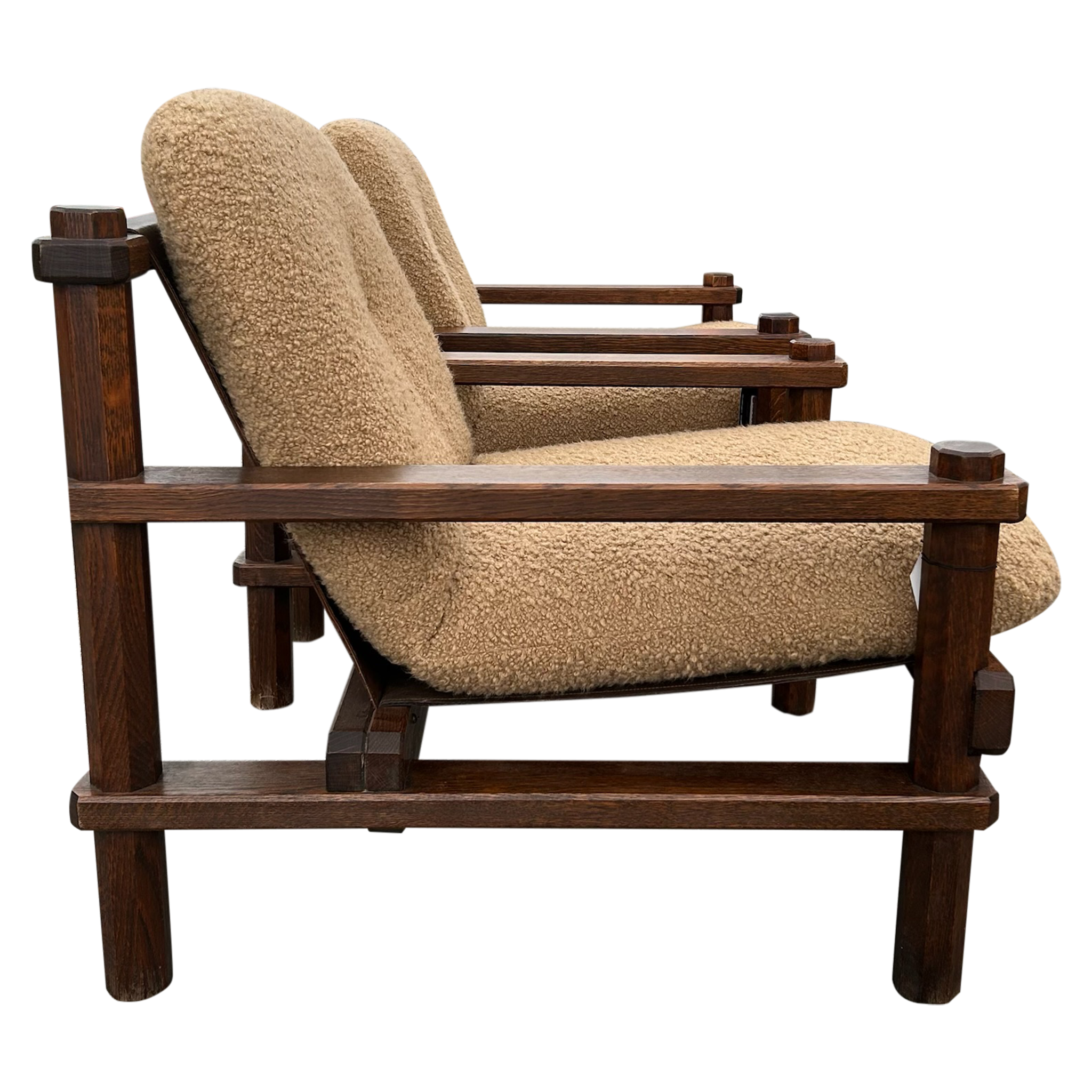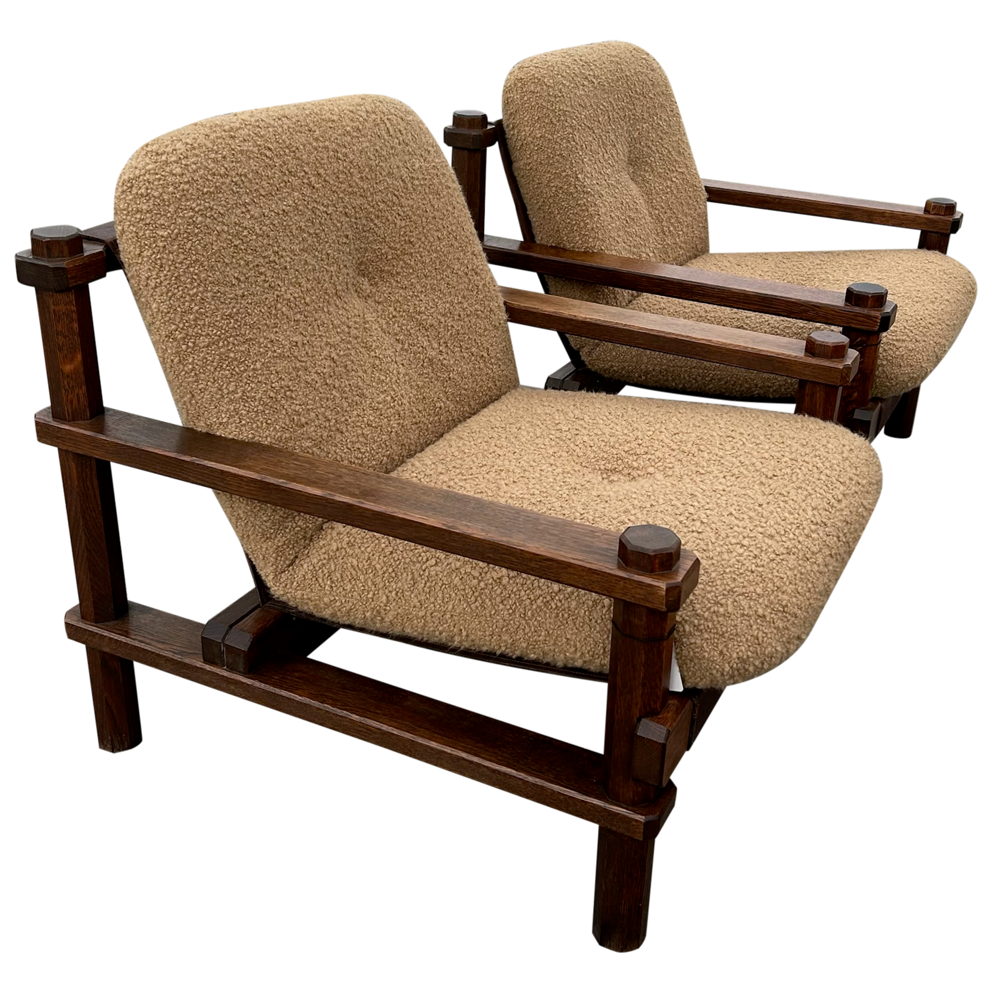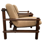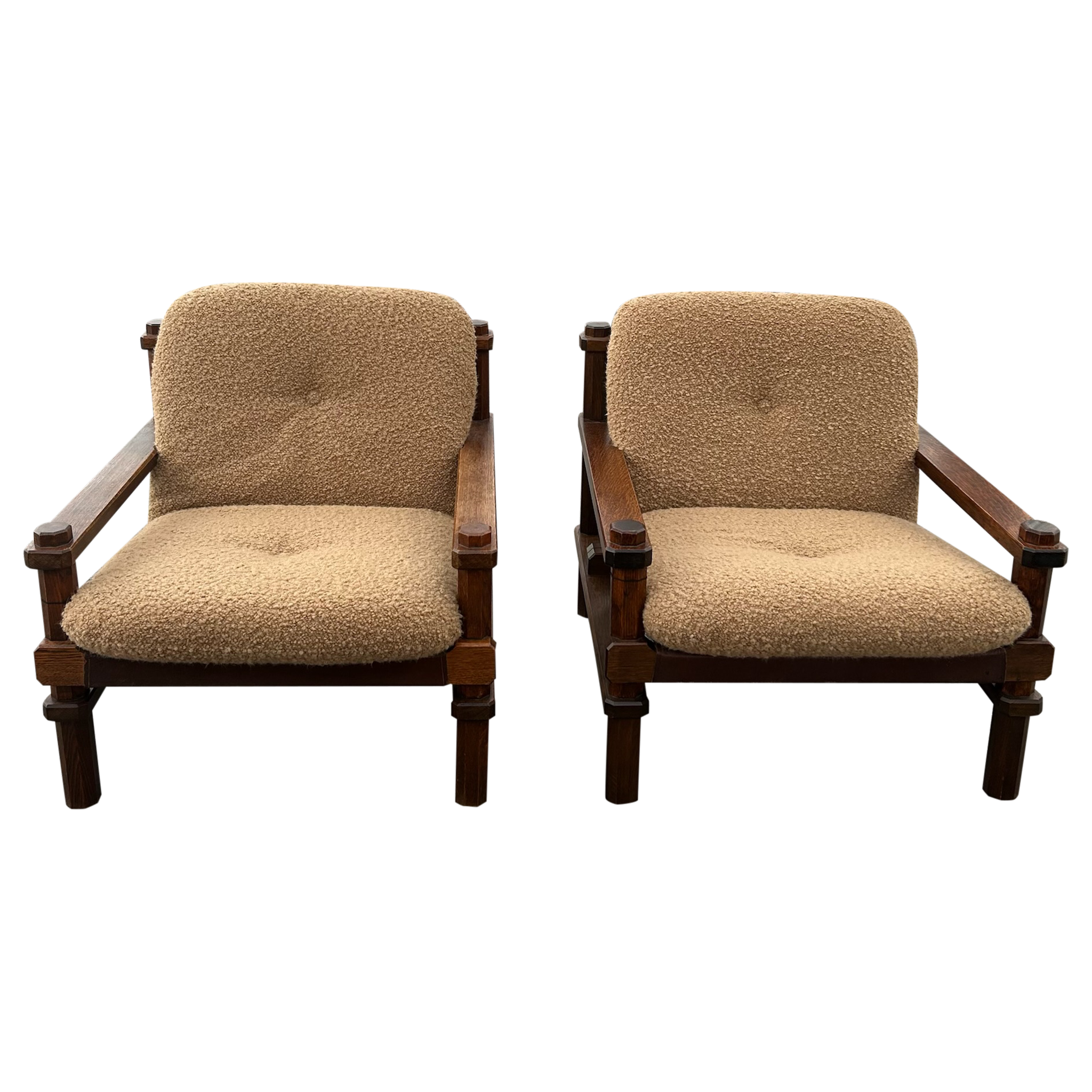 This piece is available for presale. Estimated arrival is February 20th. Armchairs featuring stout wood frames with squared posts and pegged joints. The scale feels weighty and handmade. Seats and backs are finished in a textured bouclé that adds an easy, warm texture against the darker timber.