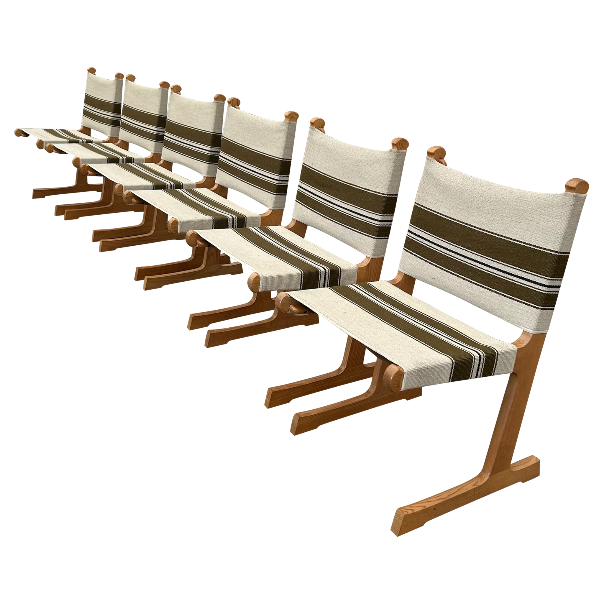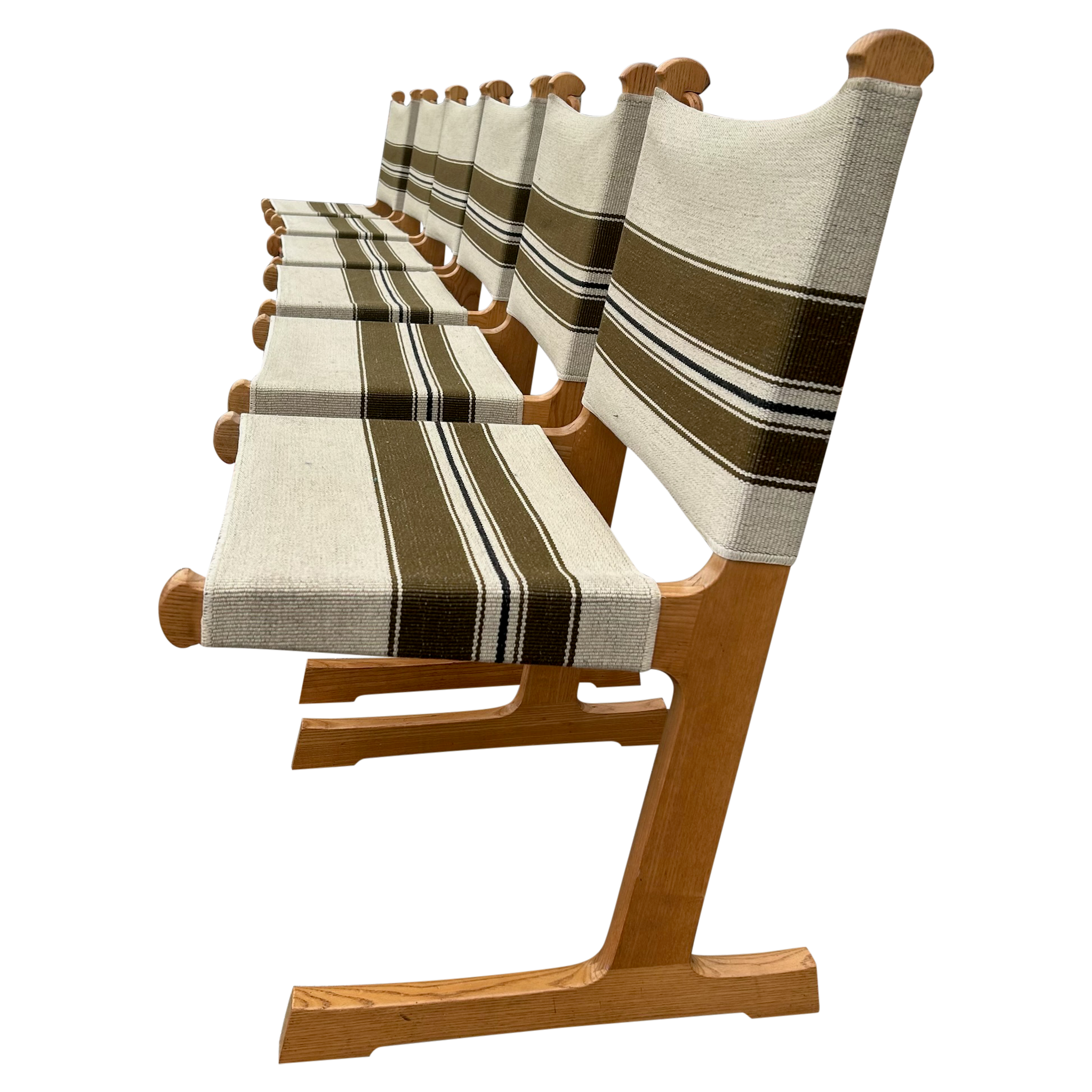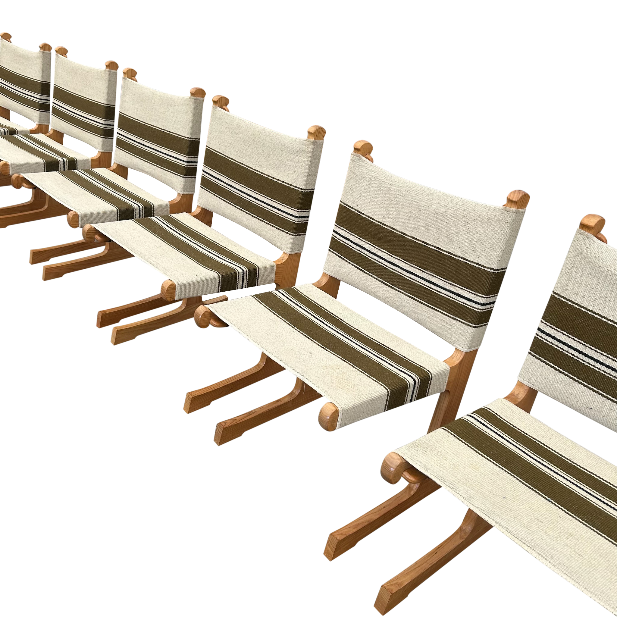 This piece is available for presale. Estimated arrival is February 20th. Oak frames with crisp, vertical lines paired with striped canvas in olive and cream. The weave brings a subtle texture against the warm wood. A straightforward Scandinavian build with an easy versatility.