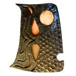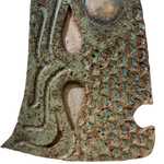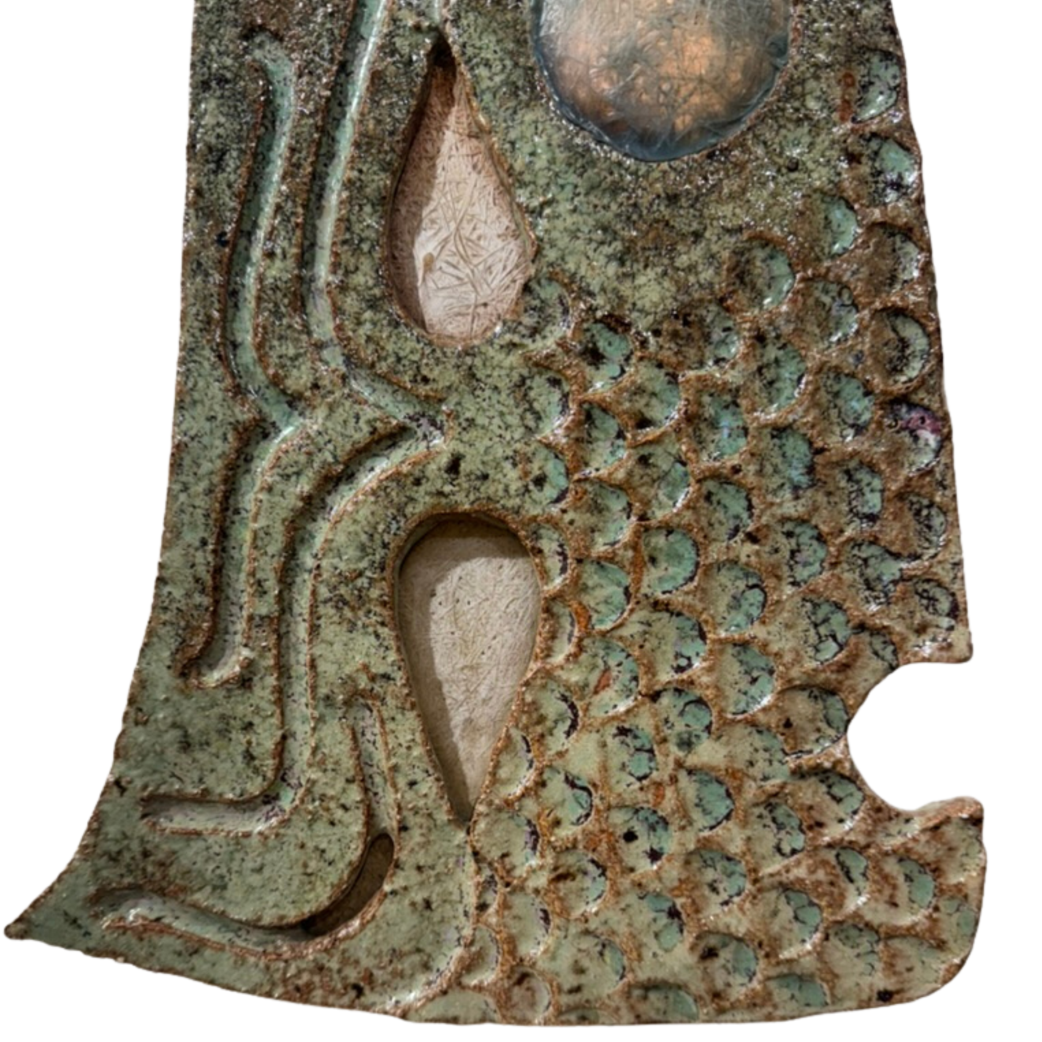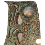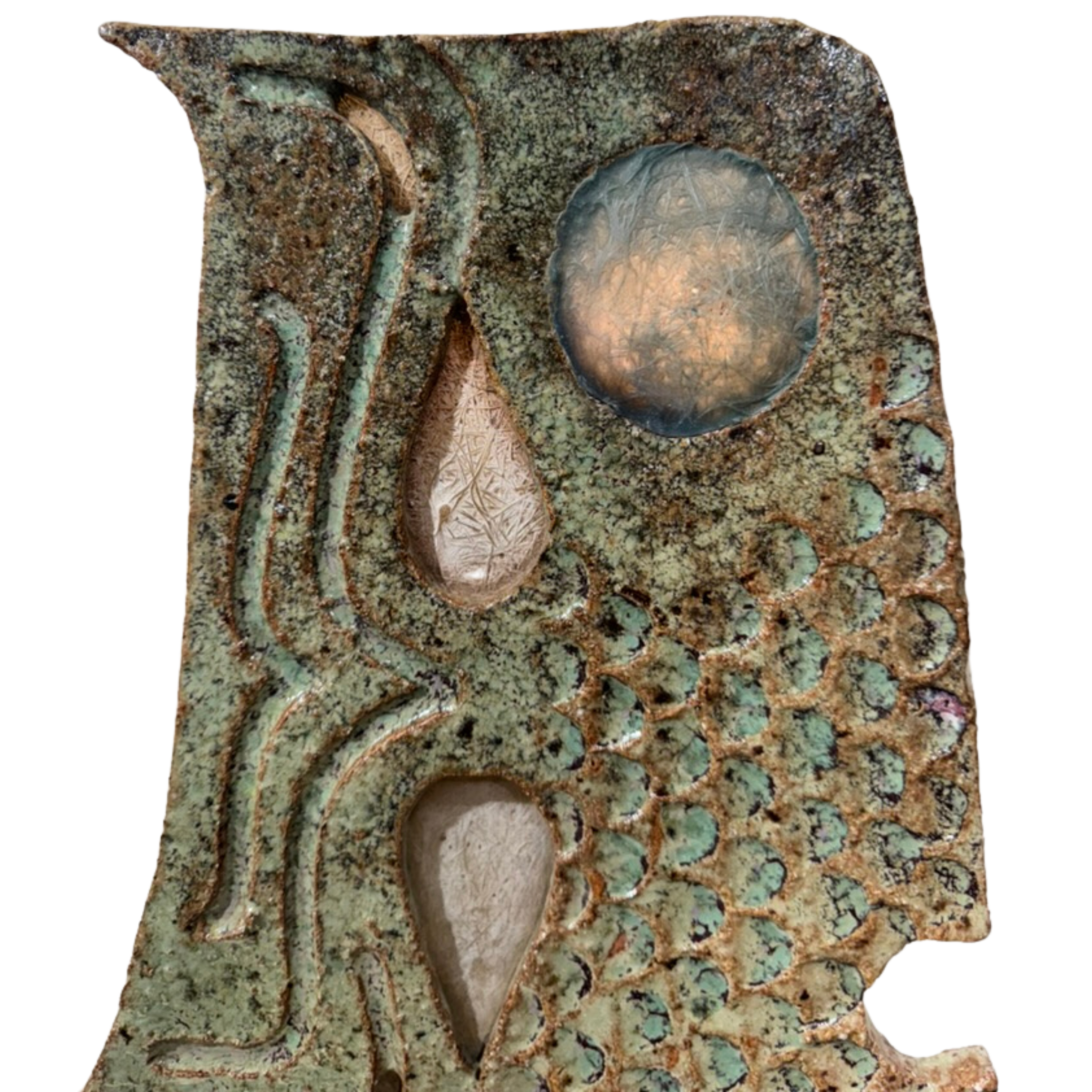 Handmade ceramic sconce with carved relief, soft green glaze, and small glazed insets in blue and ivory. The irregular form and textured surface reflect its studio build.