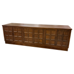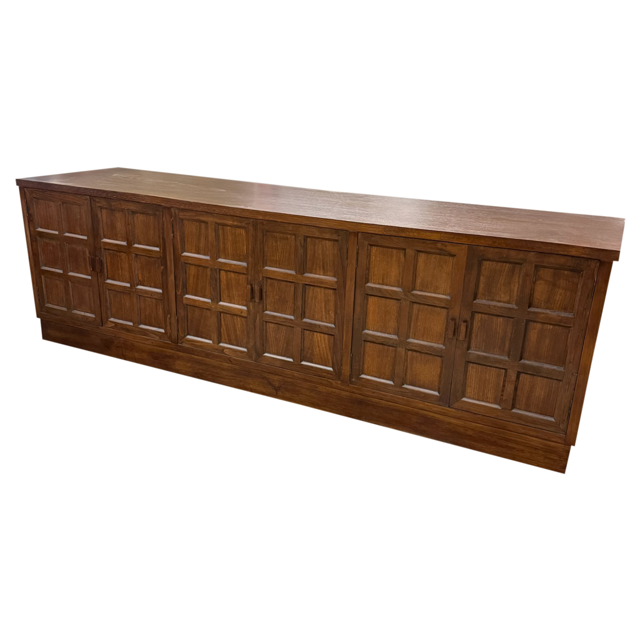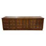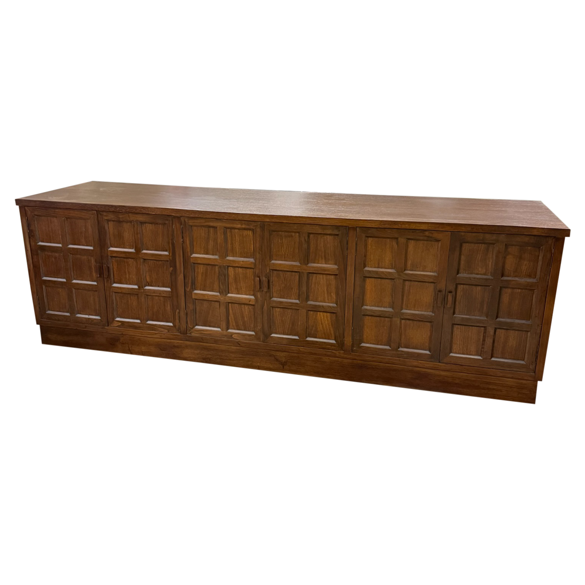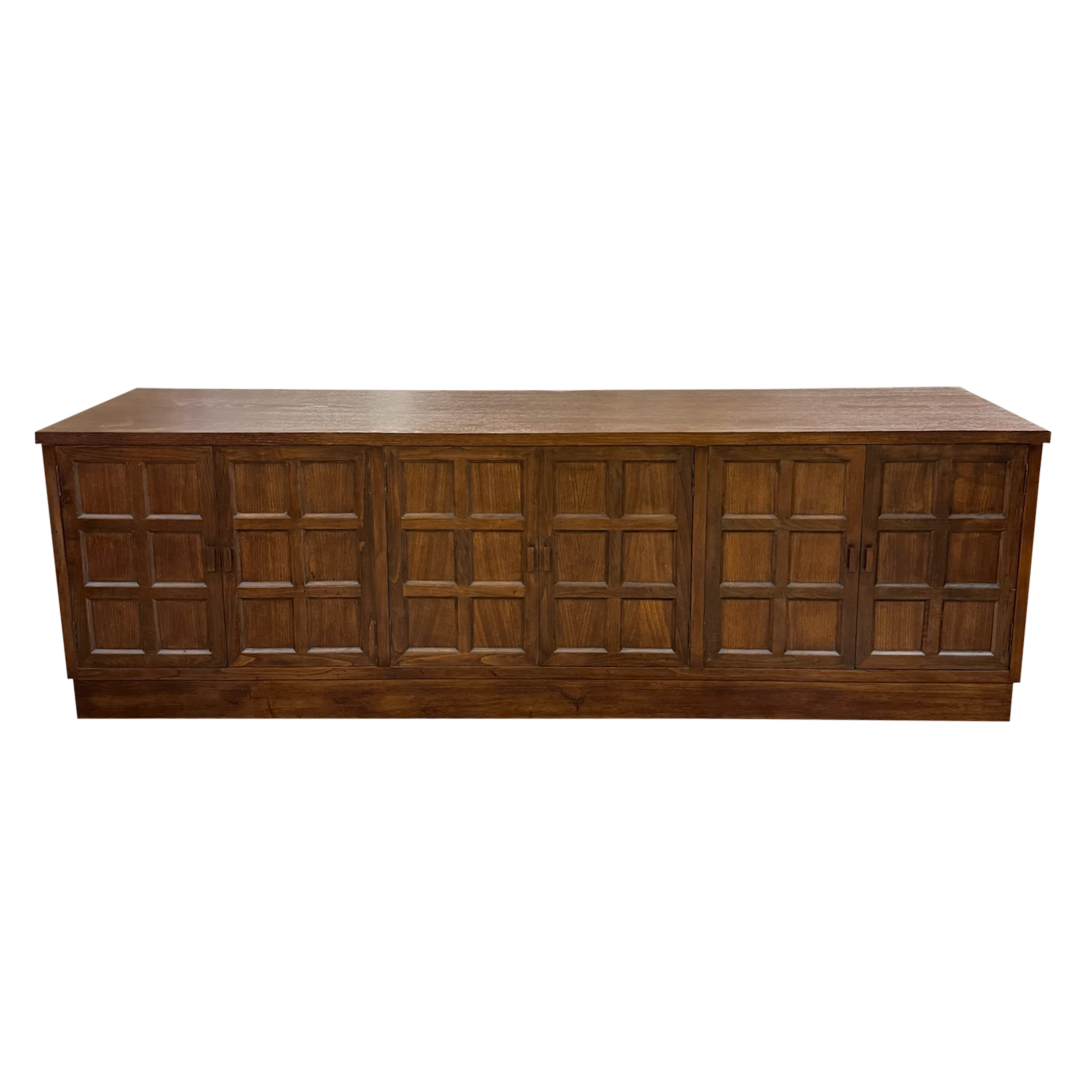 This piece is available for presale. Estimated arrival is February 20th. Long walnut sideboard with a grid of carved panel fronts and integrated pulls. The wood has a warm, even tone that highlights the block patterning across the doors.