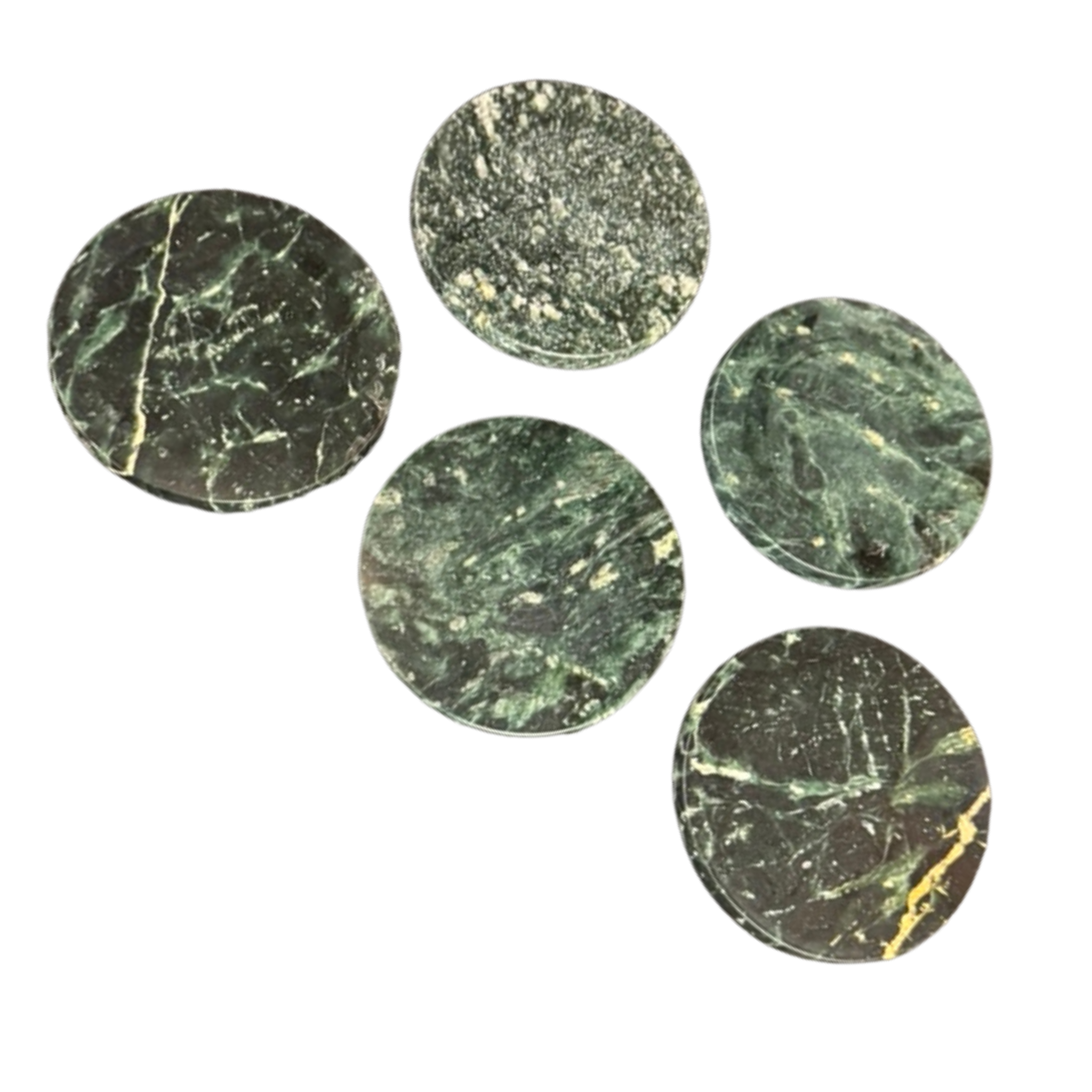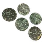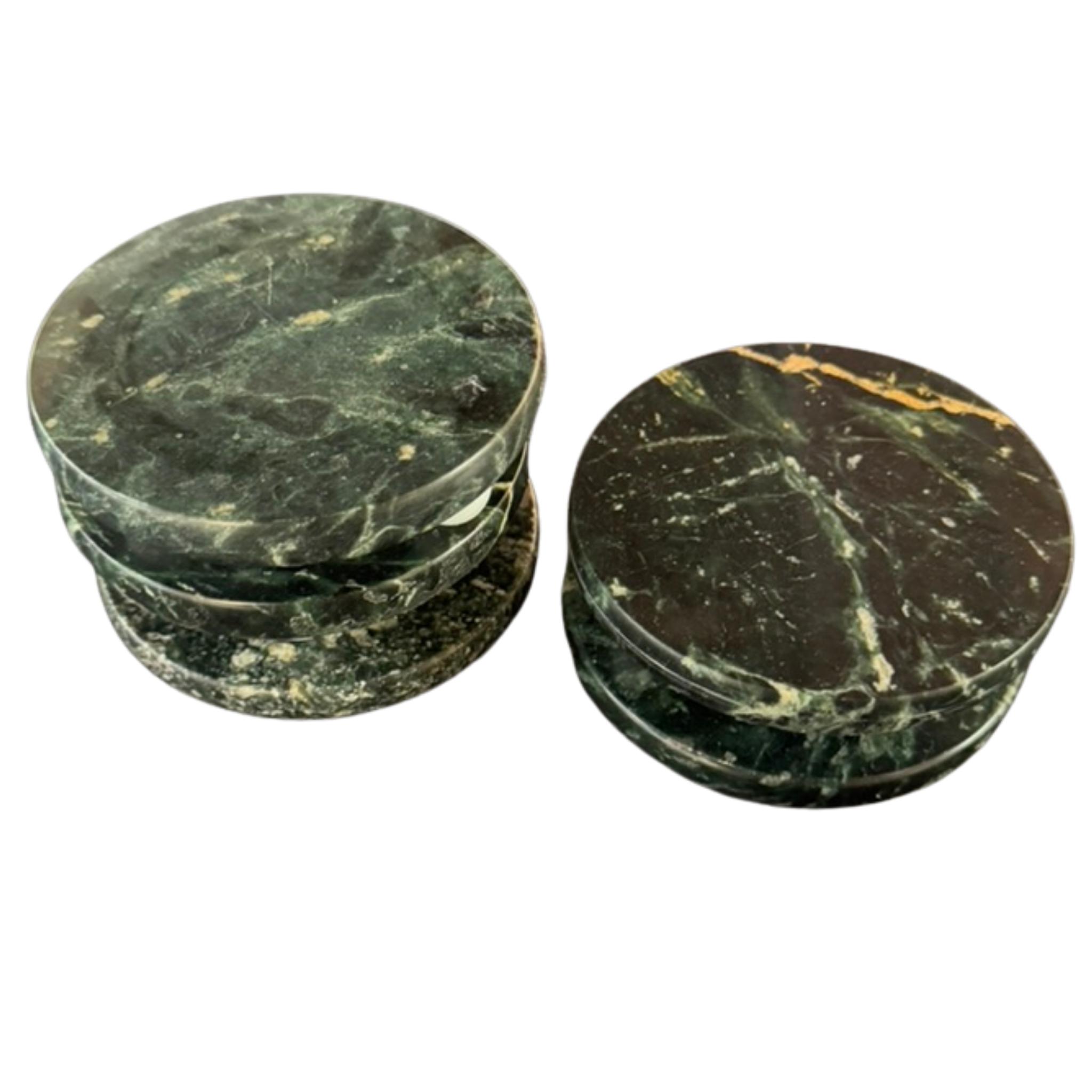 Set of five green marble coasters with stacked circular construction and rounded feet. Solid stone with natural veining and a raised profile that gives a little unexpected lift.