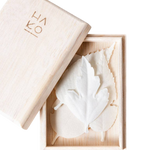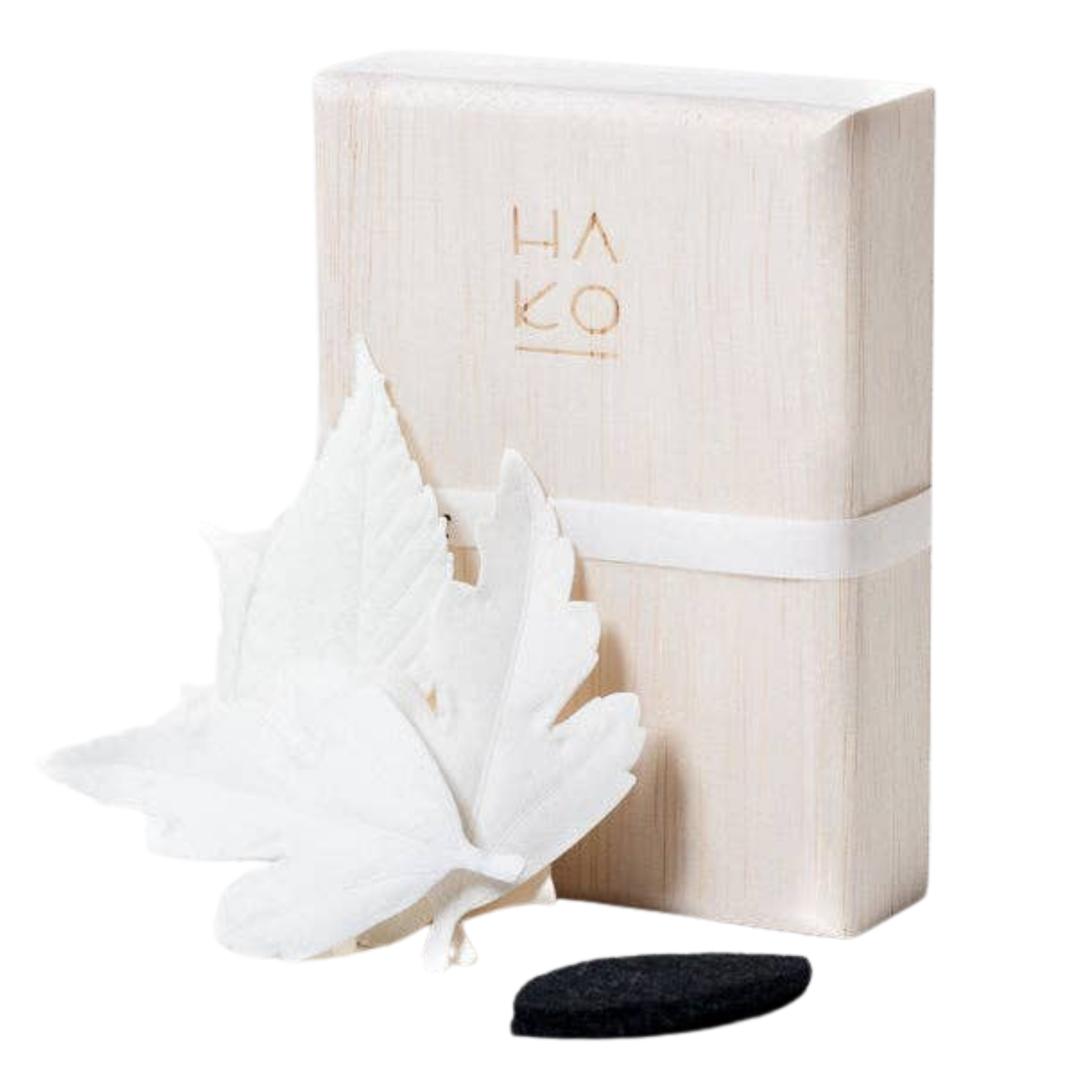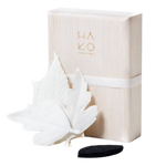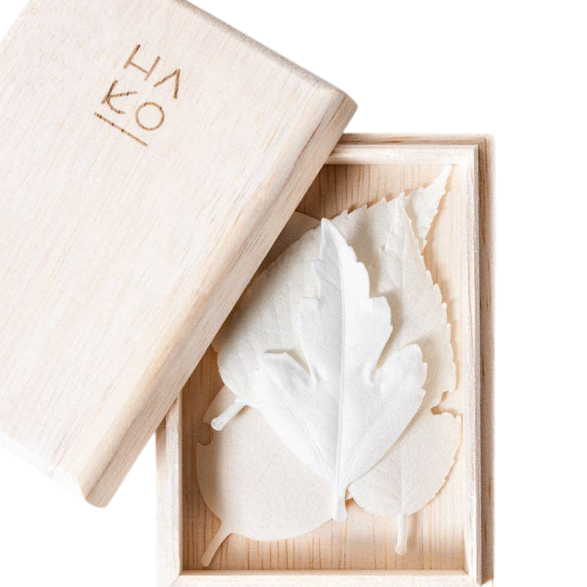 A curated sampling of HA KO incense in a gift-worthy box. This special wooden box set comes with five individual leaves of HA KO Paper Incense and includes a felt mat so you can enjoy them right away. Each leaf can be used as subtle potpourri, giving off fragrance for up to three months, or as incense that burns for approximately seven minutes while cleansing and deodorizing an area.