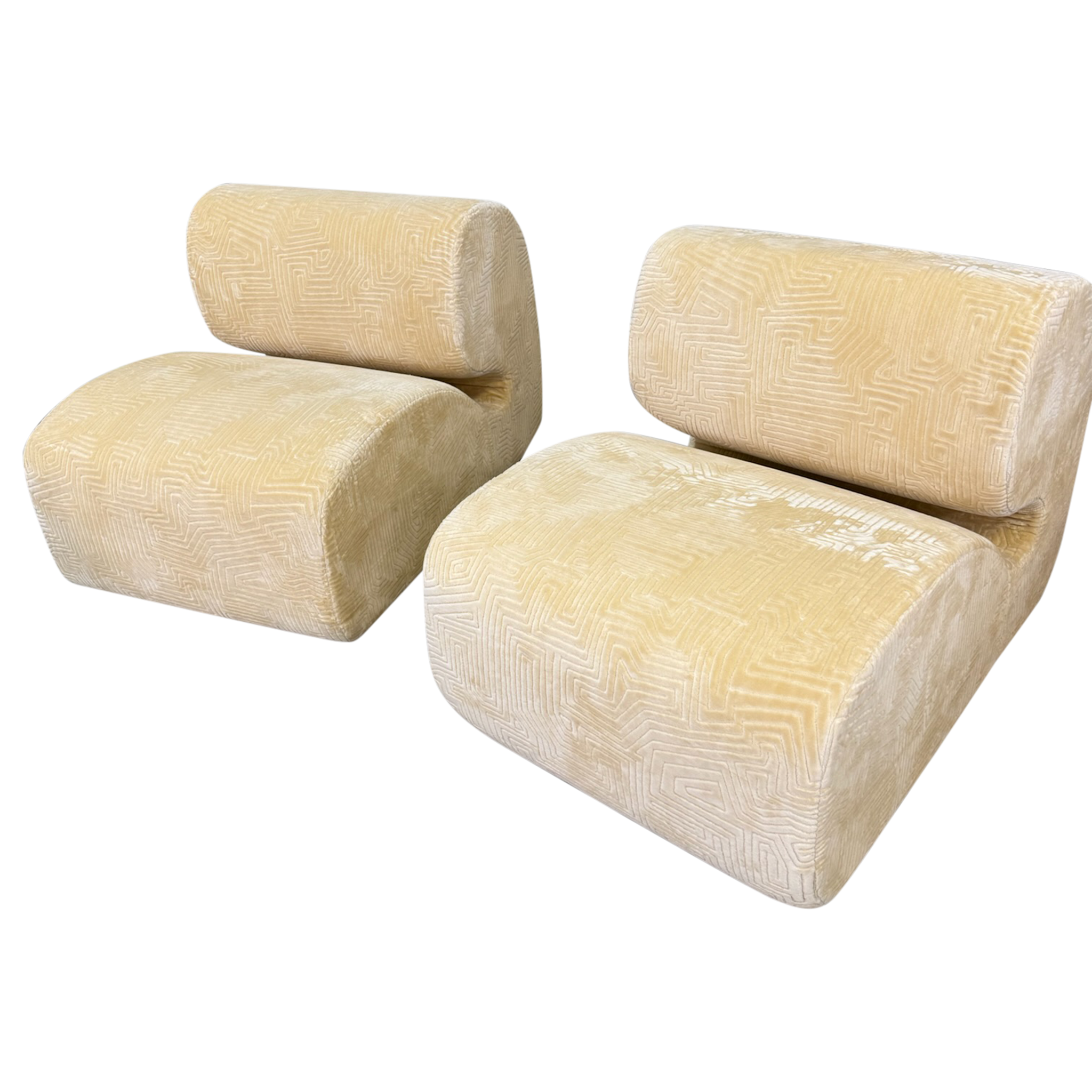 This piece is available for presale. Estimated arrival is mid to late January. Postmodern pair with soft geometric profiles and a low, sculptural sit. The cream upholstery has a raised geometric pattern that adds a layer of dimension to the rounded frames.