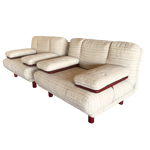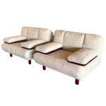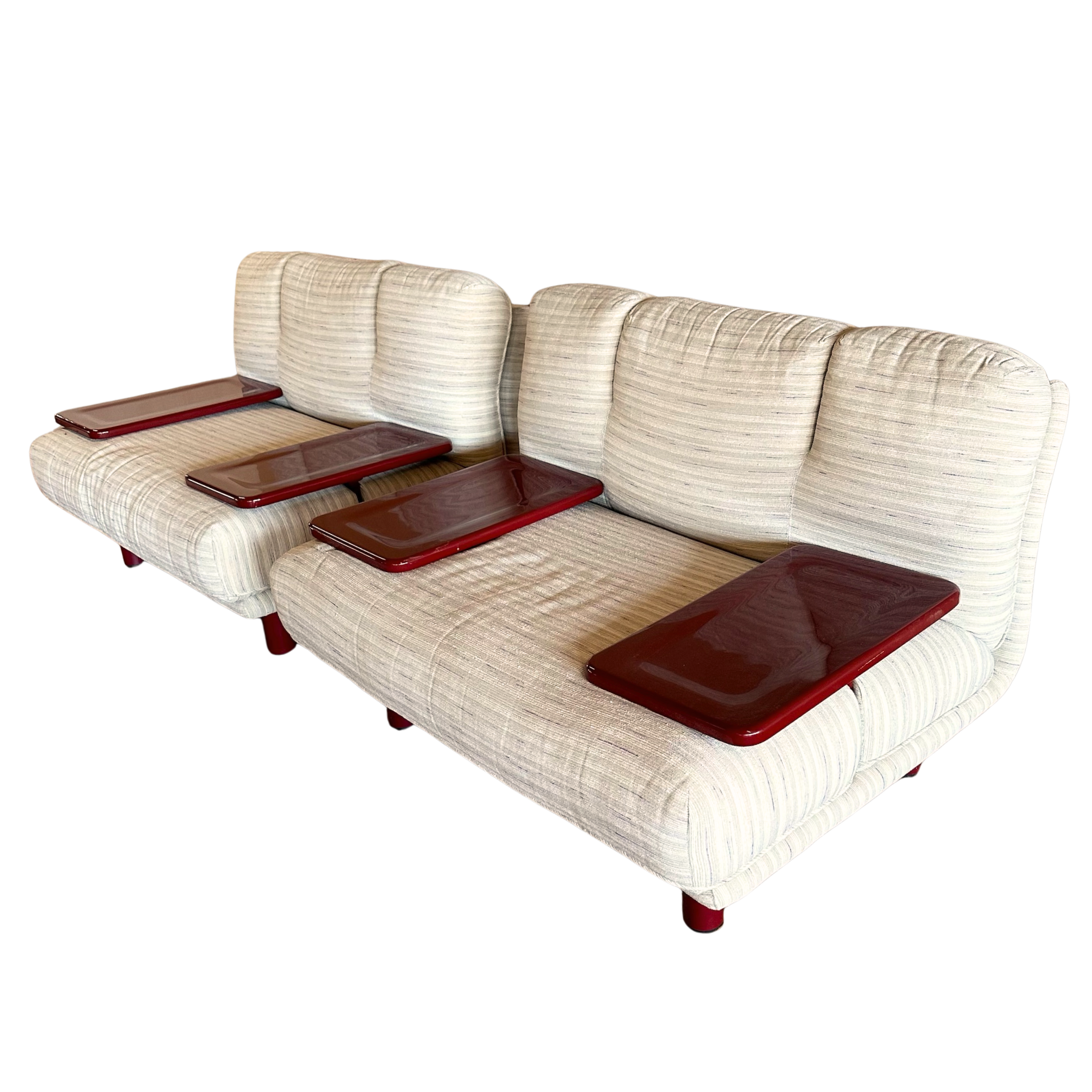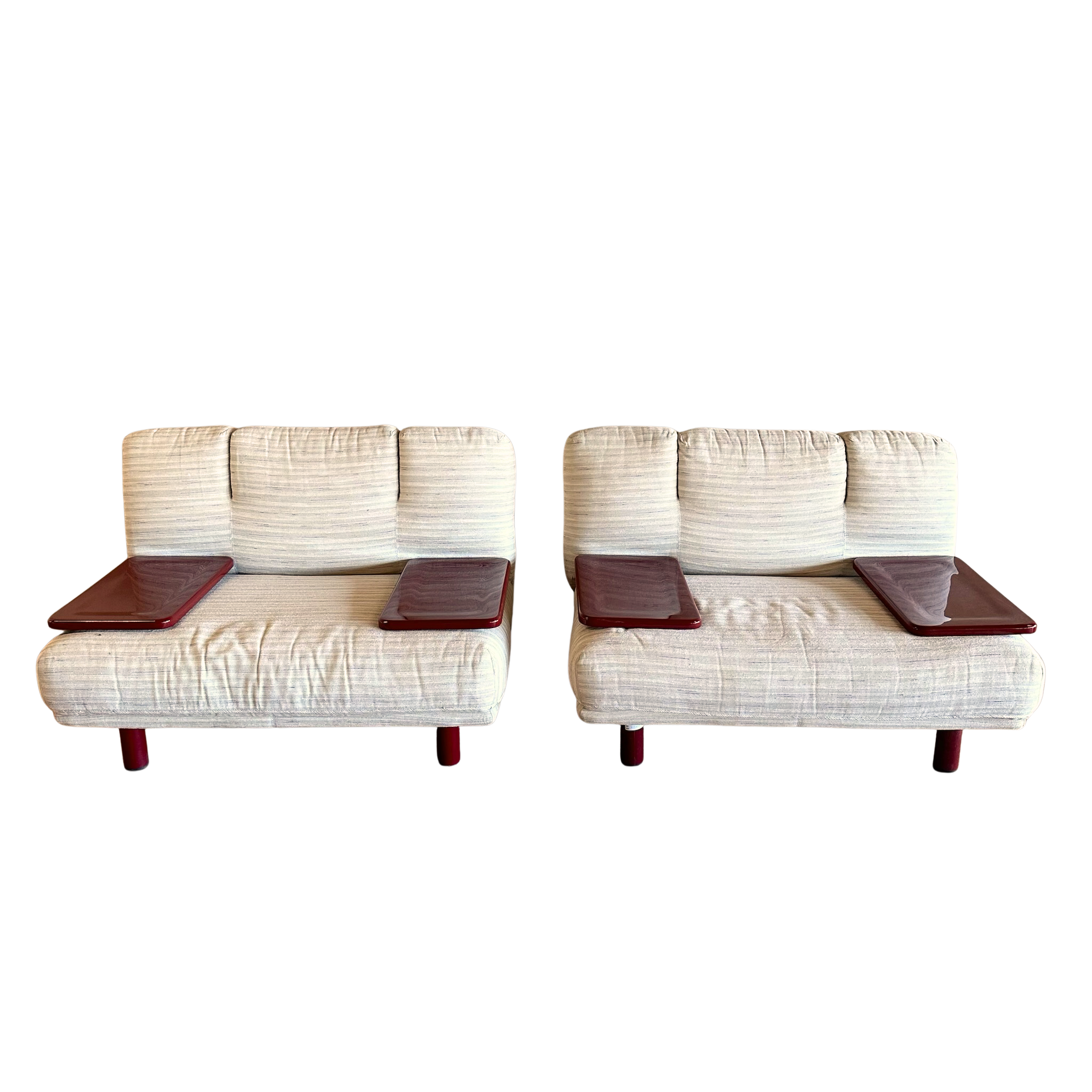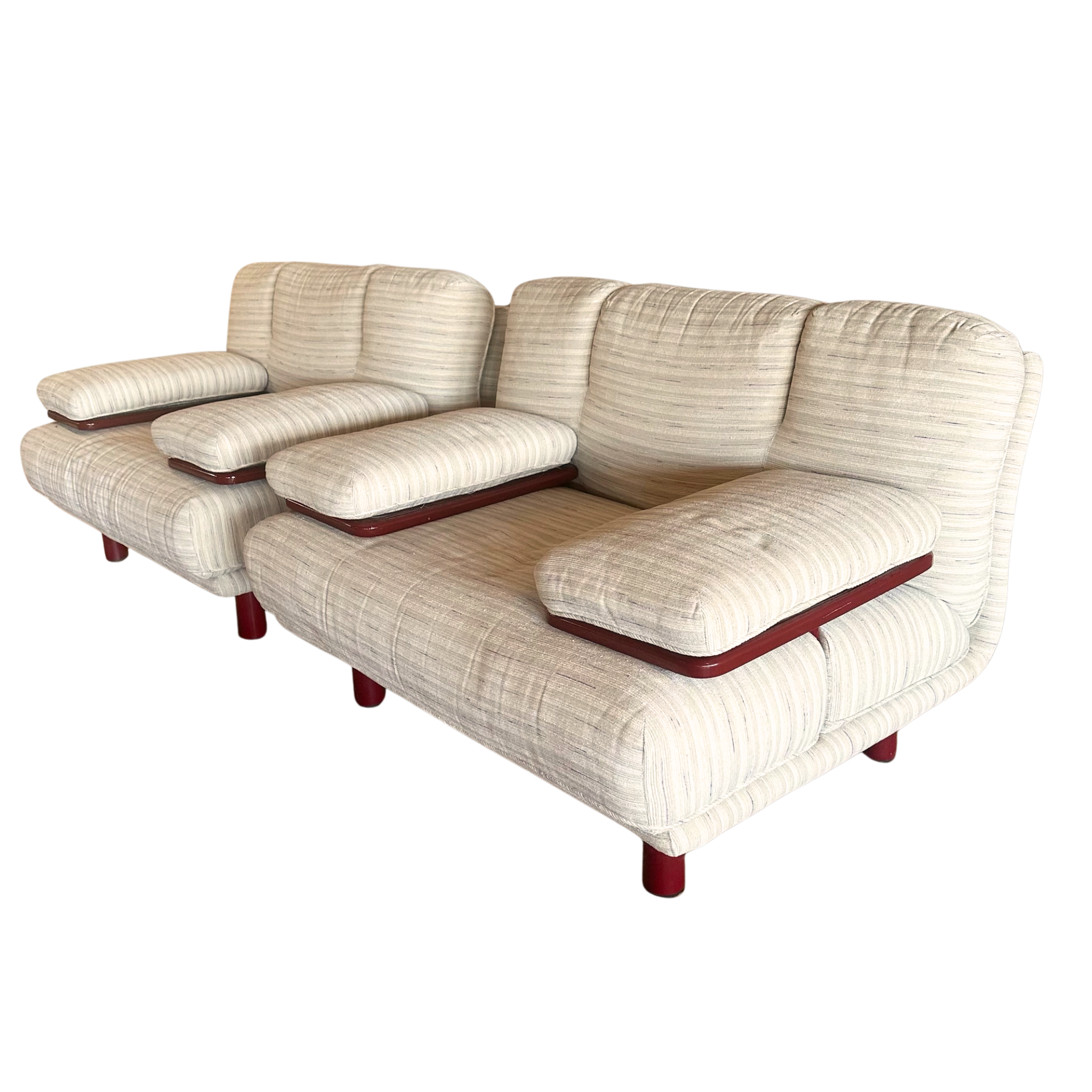 A standout of 1980s Italian design, the Magia Lounge Chairs by Bacci and Mazzoni for Giovannetti pairs tubular forms with unexpected detailing. The plush striped upholstery wraps around rounded cushions, while built in lacquered arm trays float over the seat like punctuation marks.