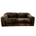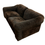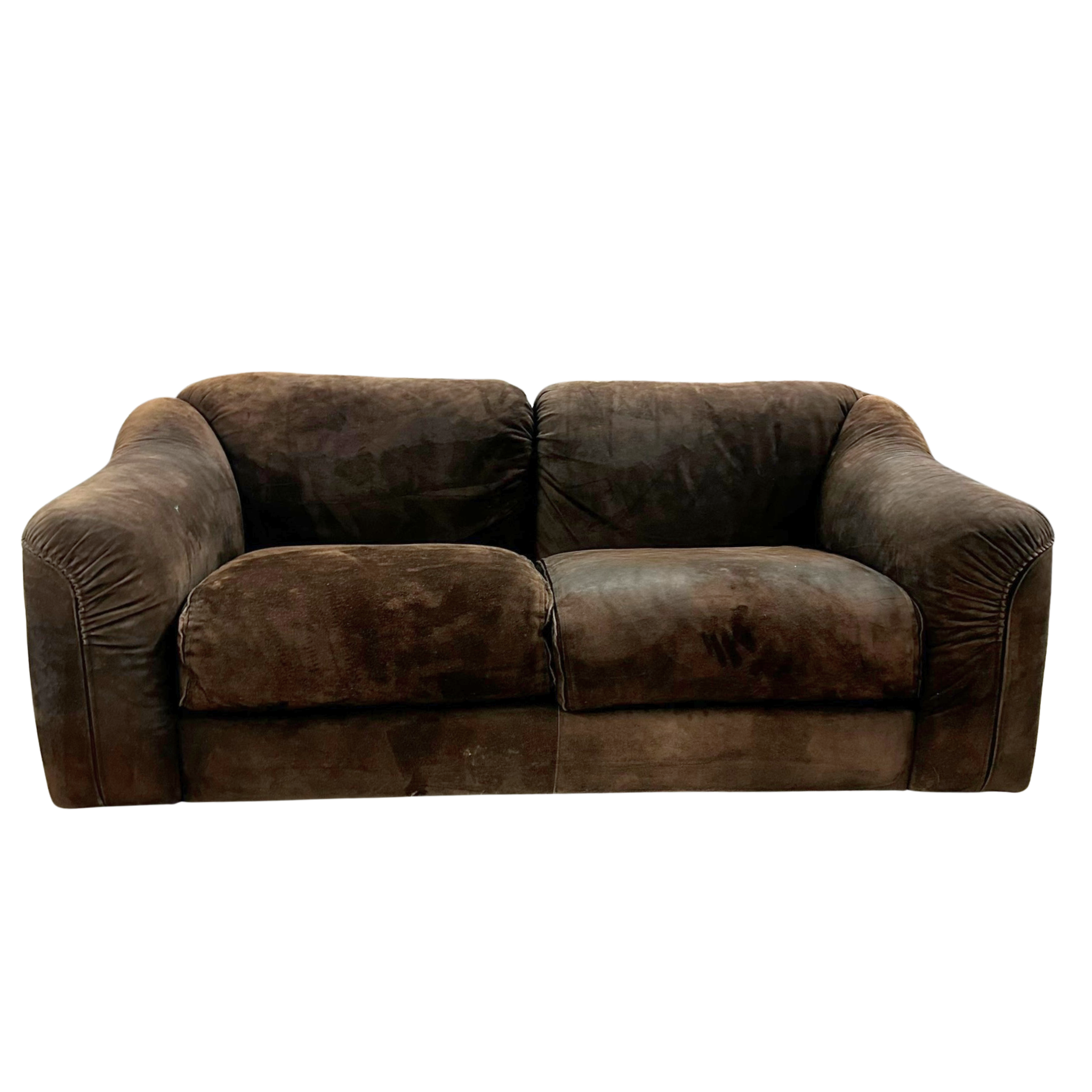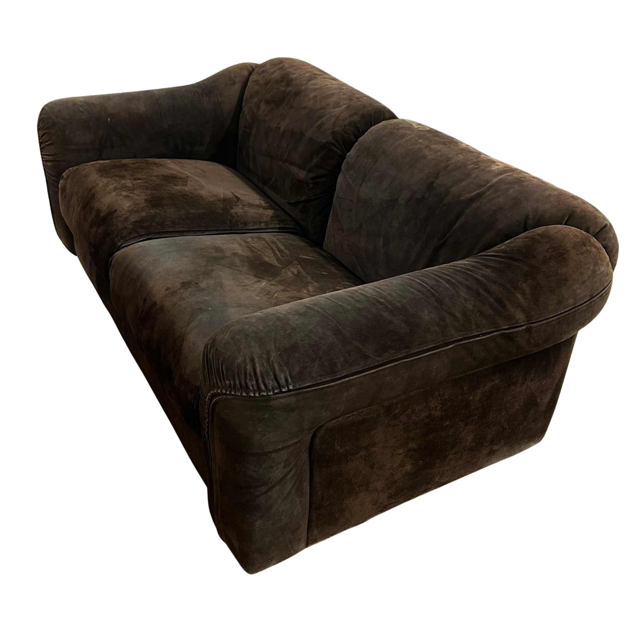 This piece is available for presale. Estimated arrival is mid to late January. Matching pair of chairs available, sold separately. Italian two seat sofa from the 1970s with original chocolate suede upholstery.